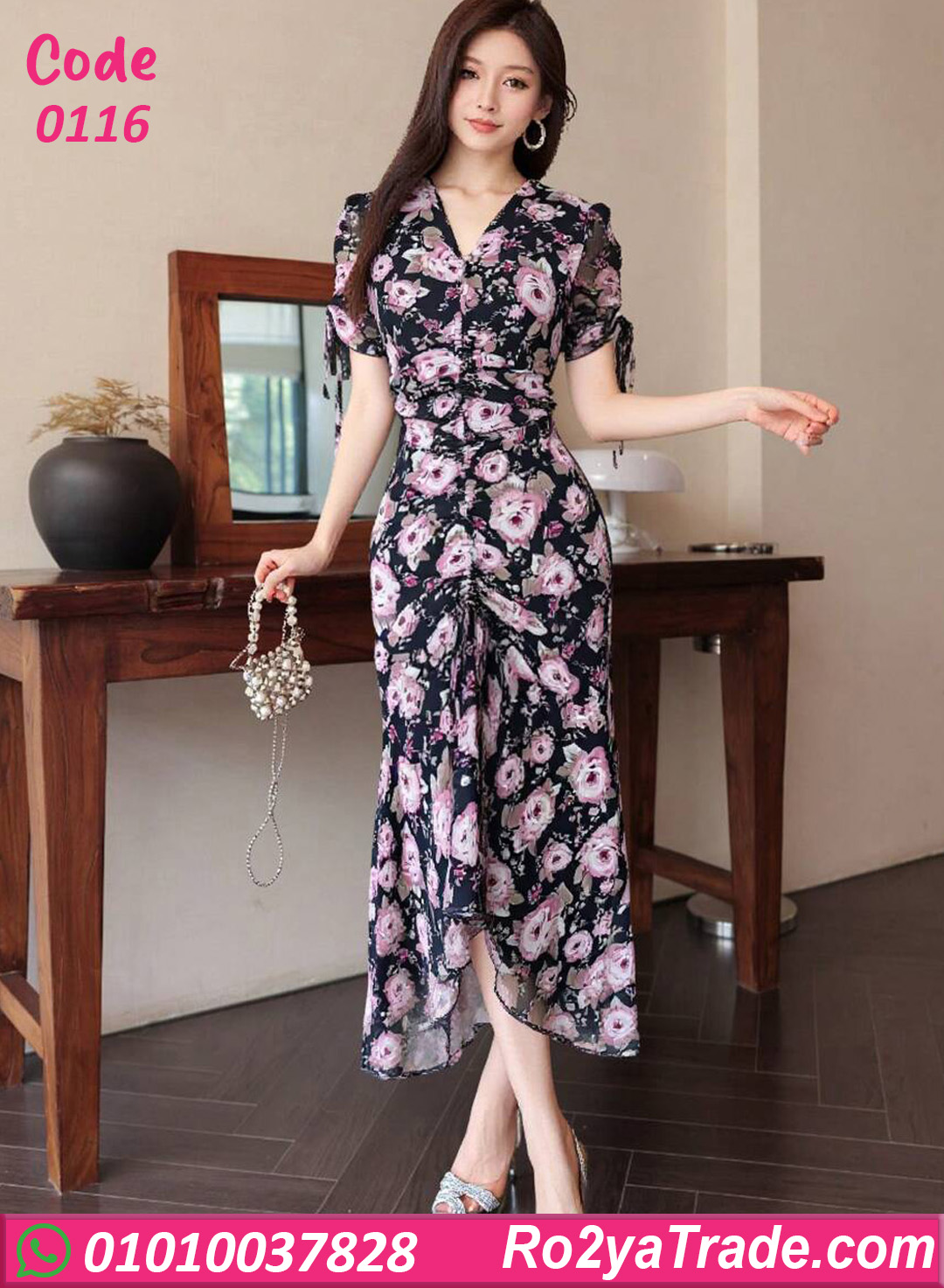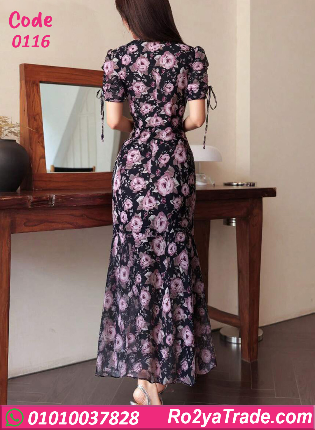 دريس صيفي أنيق بتصميم أنثوي ناعم، مزين بنقشة ورد شيك على أرضية غامقة بتدي شكل راقي ومميز. قصته مظبوطة على الجسم بتبرز القوام، مع ياقة V ناعمة وأكمام قصيرة مربوطة من الجنب بتضيف لمسة دلع وأنوثة. الطول الماكسي مع القصة المتدرجة بيخليه اختيار مثالي للمشاوير، الخروجات، والسهرات الصيفي الخفيفة.