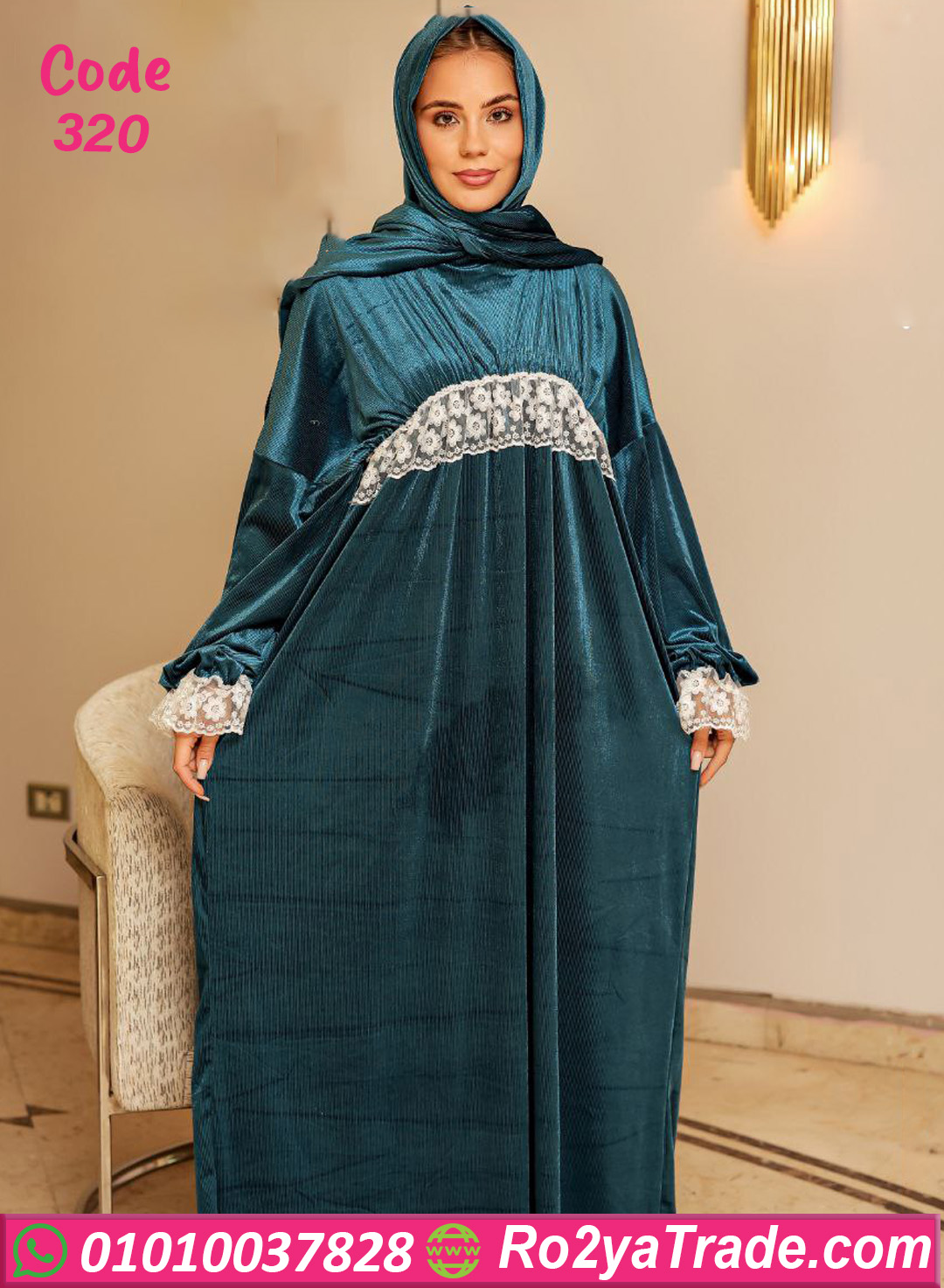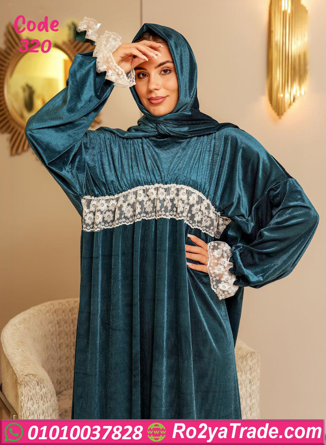 اسدال حريمي قطيفة ناعمة ودافية بتصميم أنيق مزين بدانتيل شيك، مناسب للصلاة والخروج وخامة مريحة للبس اليومي.