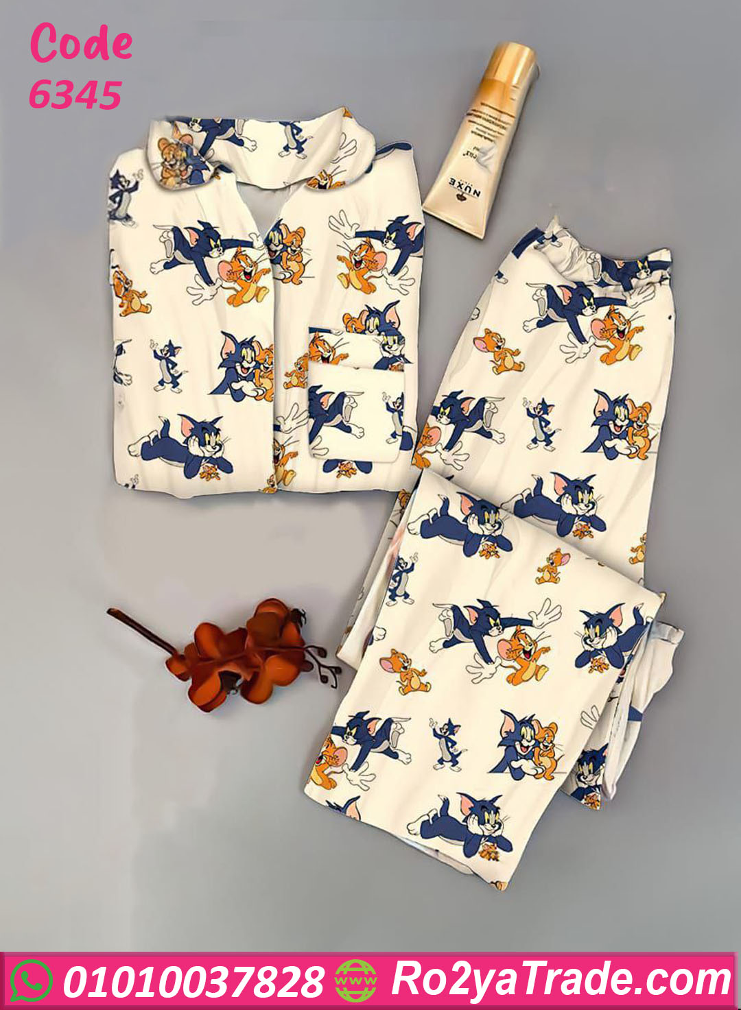 البيجامة فيها نقشات توم وجيري المرحة اللي بتدي طاقة إيجابية ومود حلو، مع تصميم عملي بقميص بأزرار وسروال واسع لسهولة الحركة والراحة.