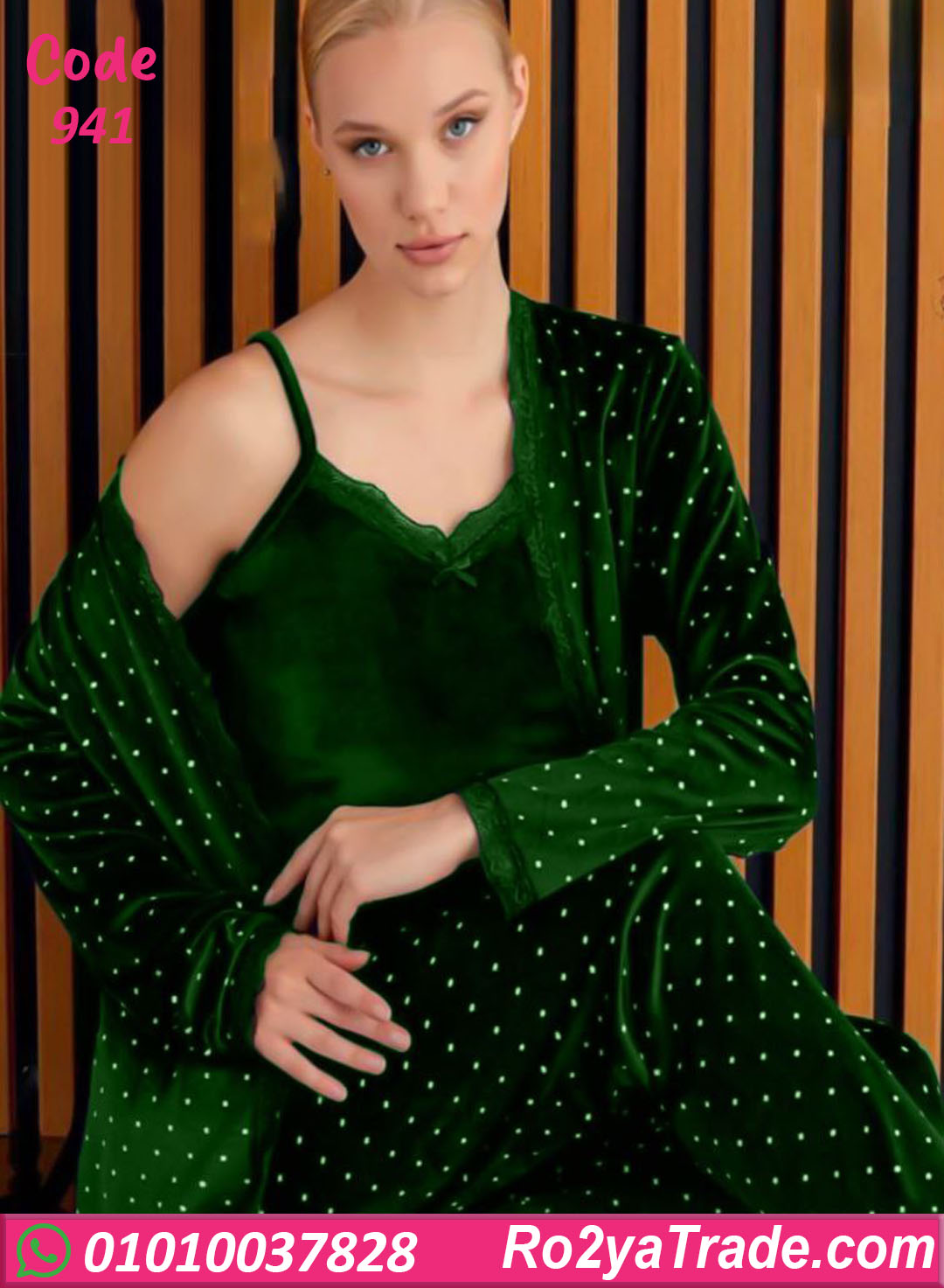 بيجامة نسائية شتوي مكوّنة من بلوزة حمالة قطيفة ناعمة مع روب وبنطلون قطيفة مريح، الخامة تقيلة وبتحافظ على حرارة الجسم، ومناسبة للبس اليومي من غير أي إحساس بالضيق. التصميم عملي وأنيق ويناسب كل ست بتحب الإحساس بالدفا مع شياكة بسيطة. كود 941