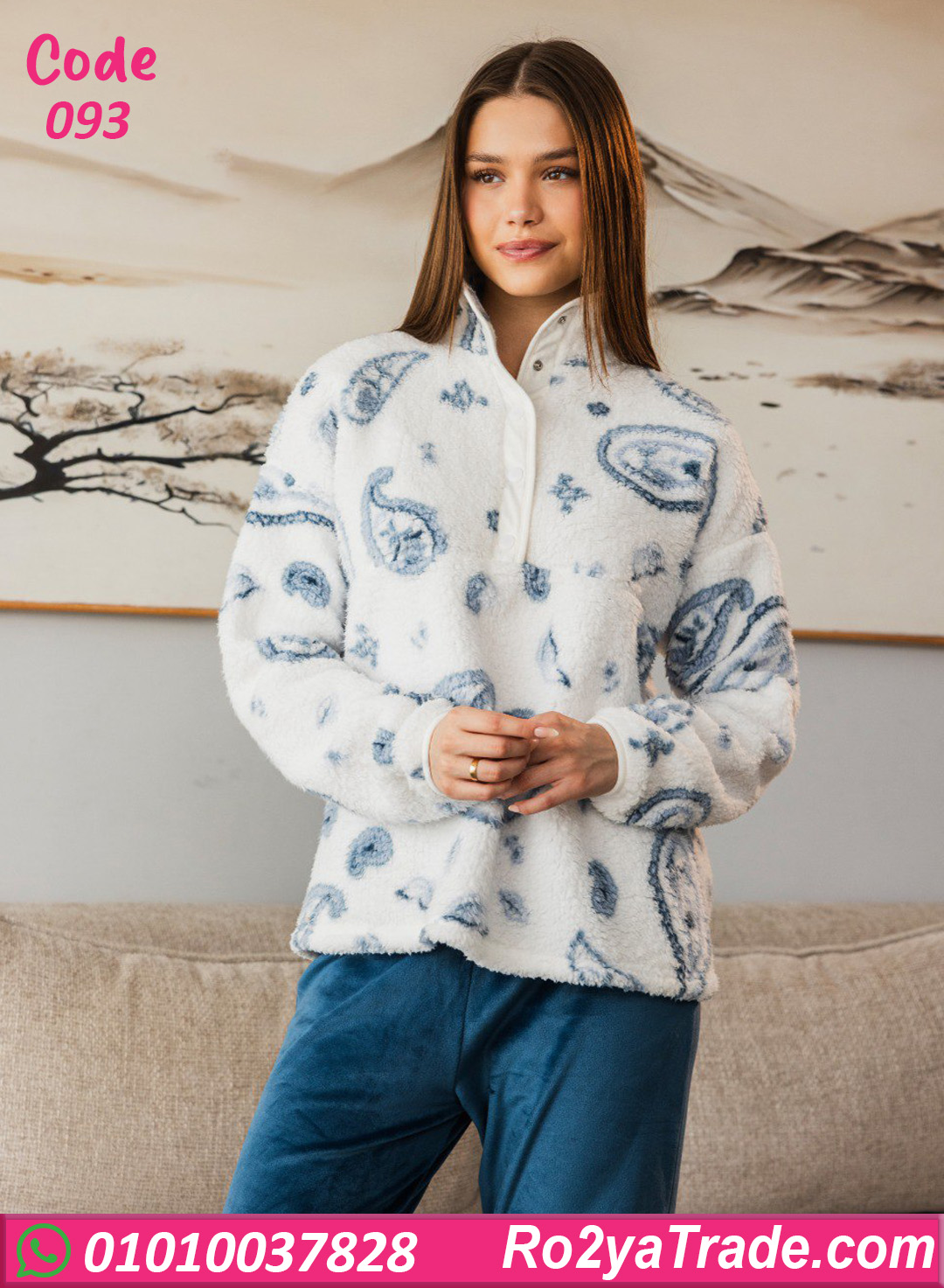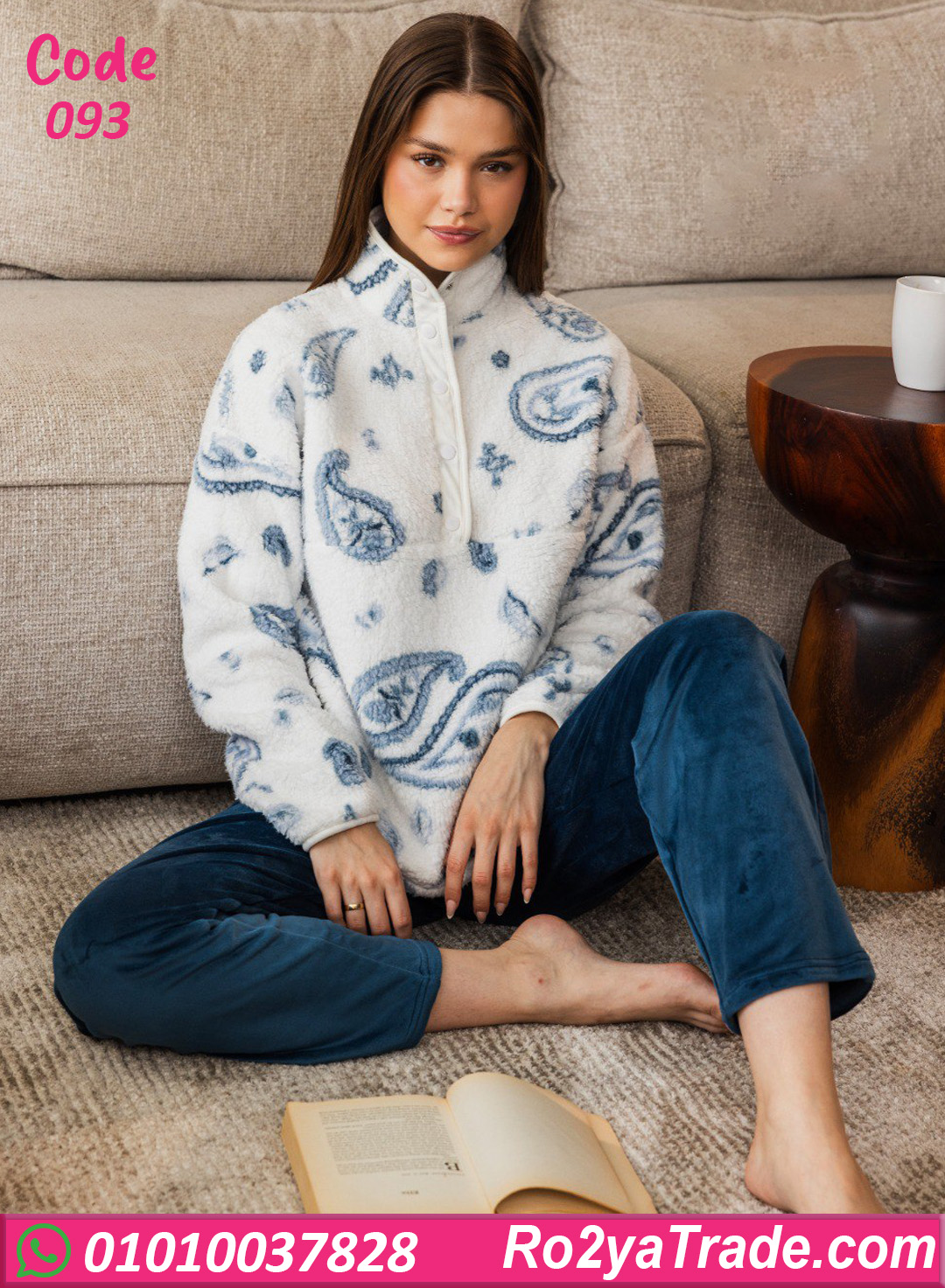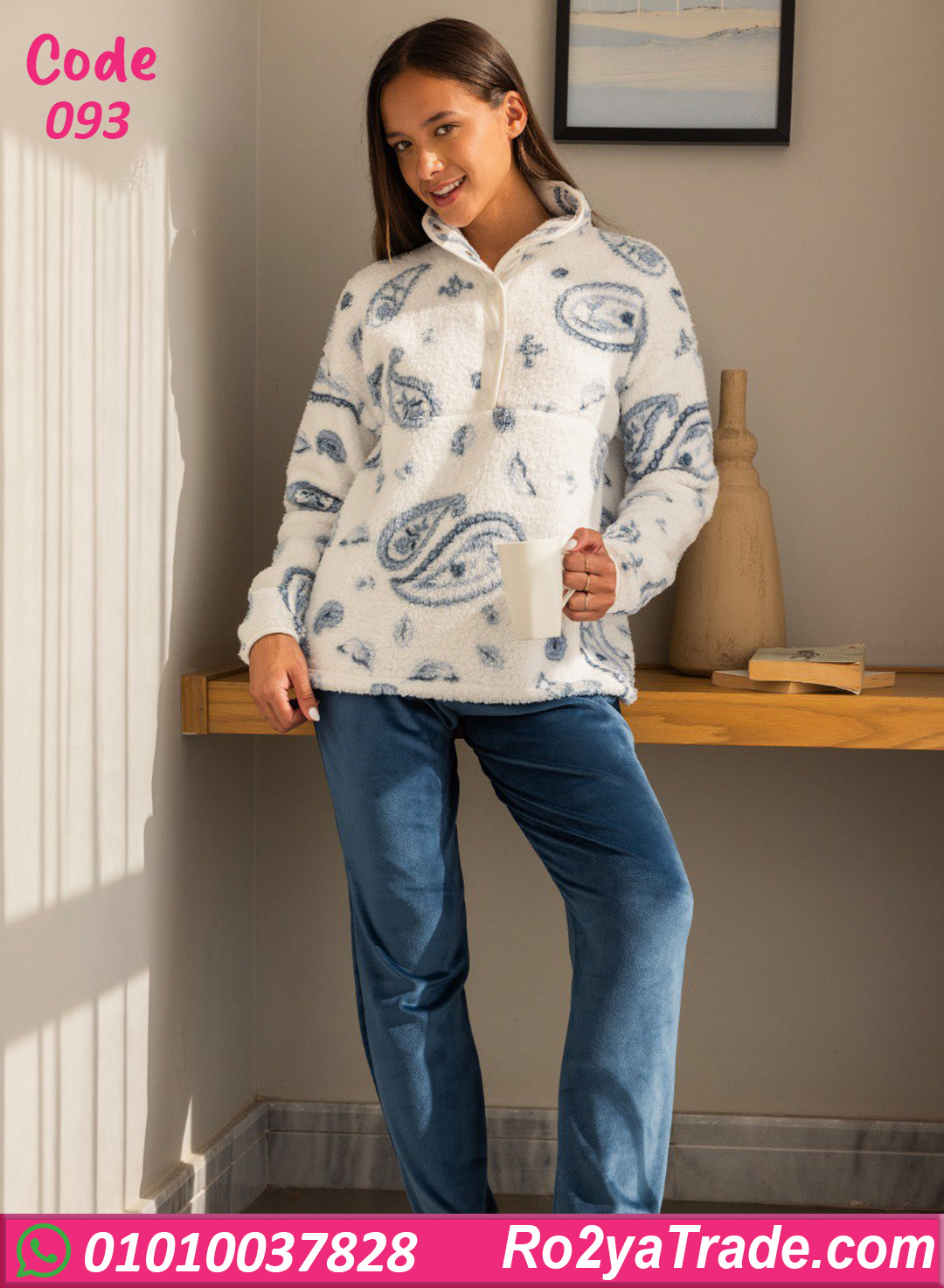 بيجامة حريمي شتوي بتصميم عملي وناعم، مناسبة للبيت وأوقات الراحة في أيام الشتا، خامة قطيفة دافية ومريحة بتدي إحساس عالي بالدفا مع حرية كاملة في الحركة.
