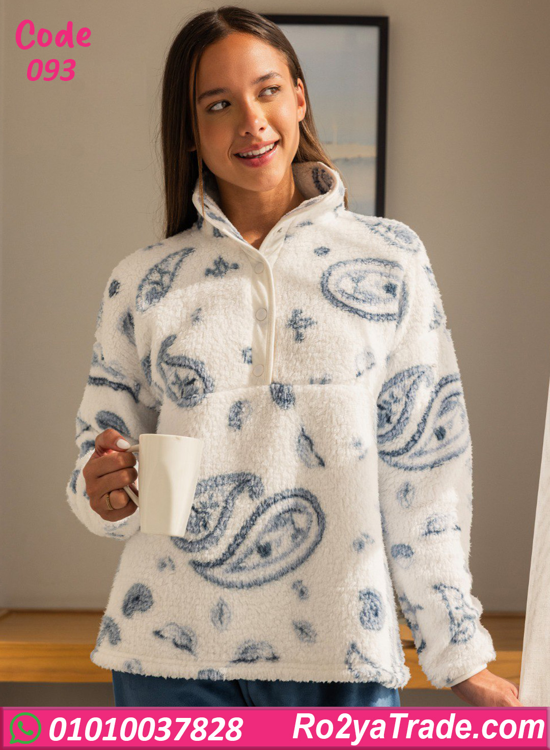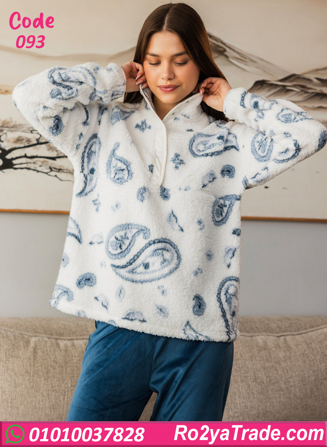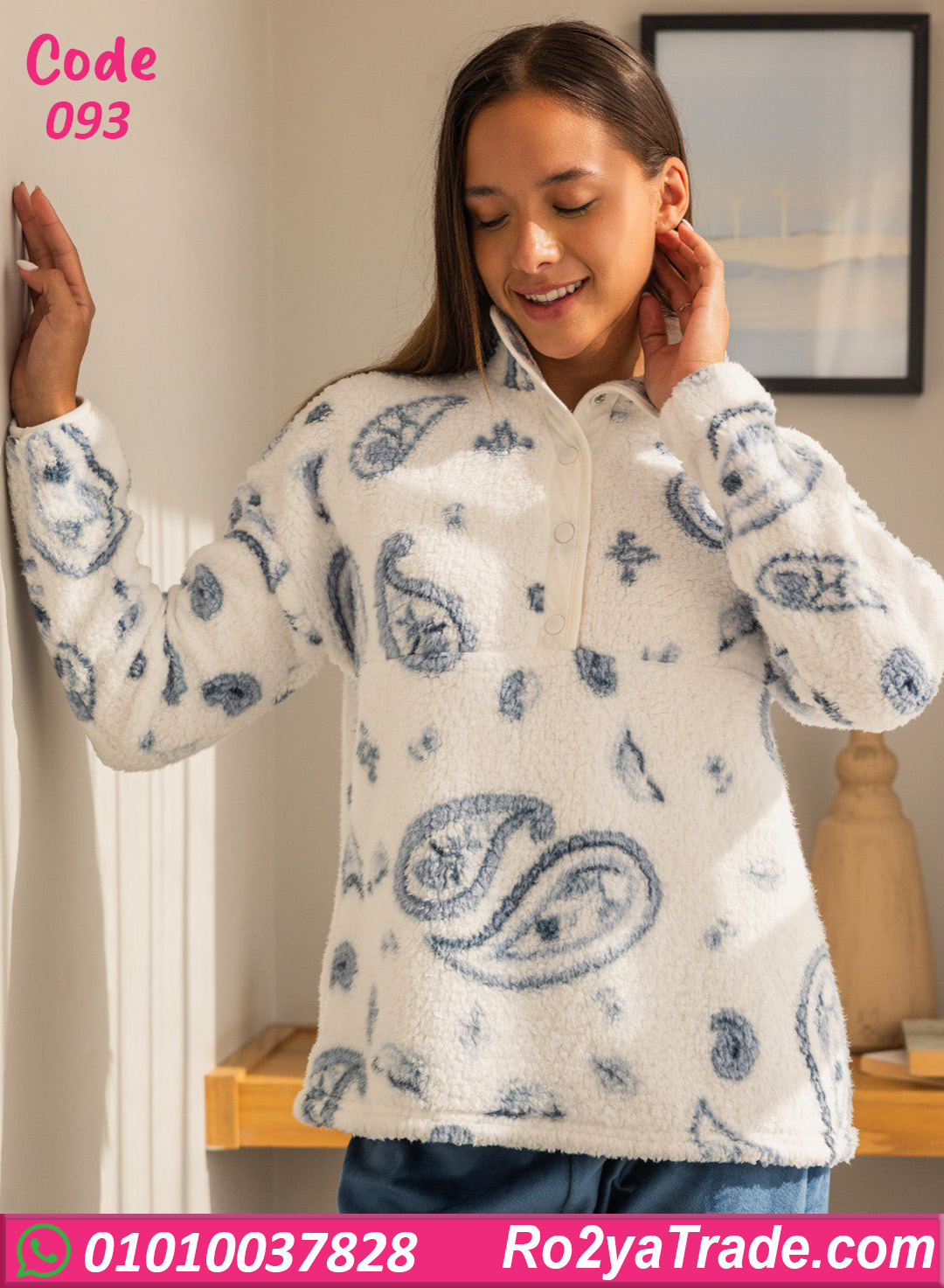 بيجامة حريمي شتوي بتصميم عملي وناعم، مناسبة للبيت وأوقات الراحة في أيام الشتا، خامة قطيفة دافية ومريحة بتدي إحساس عالي بالدفا مع حرية كاملة في الحركة.
