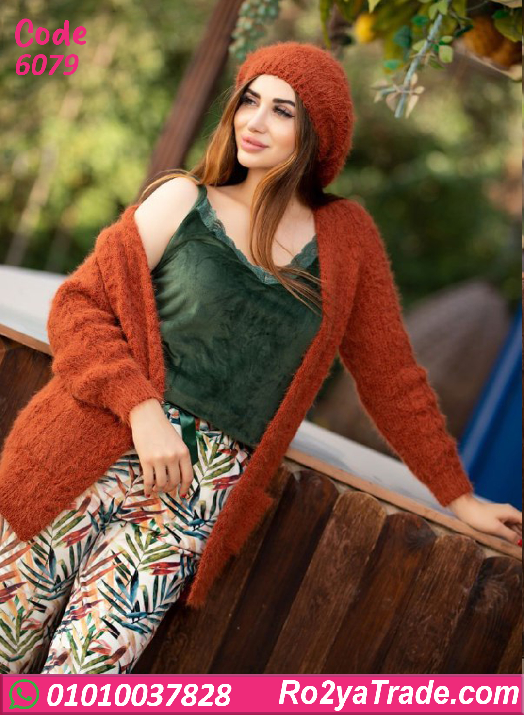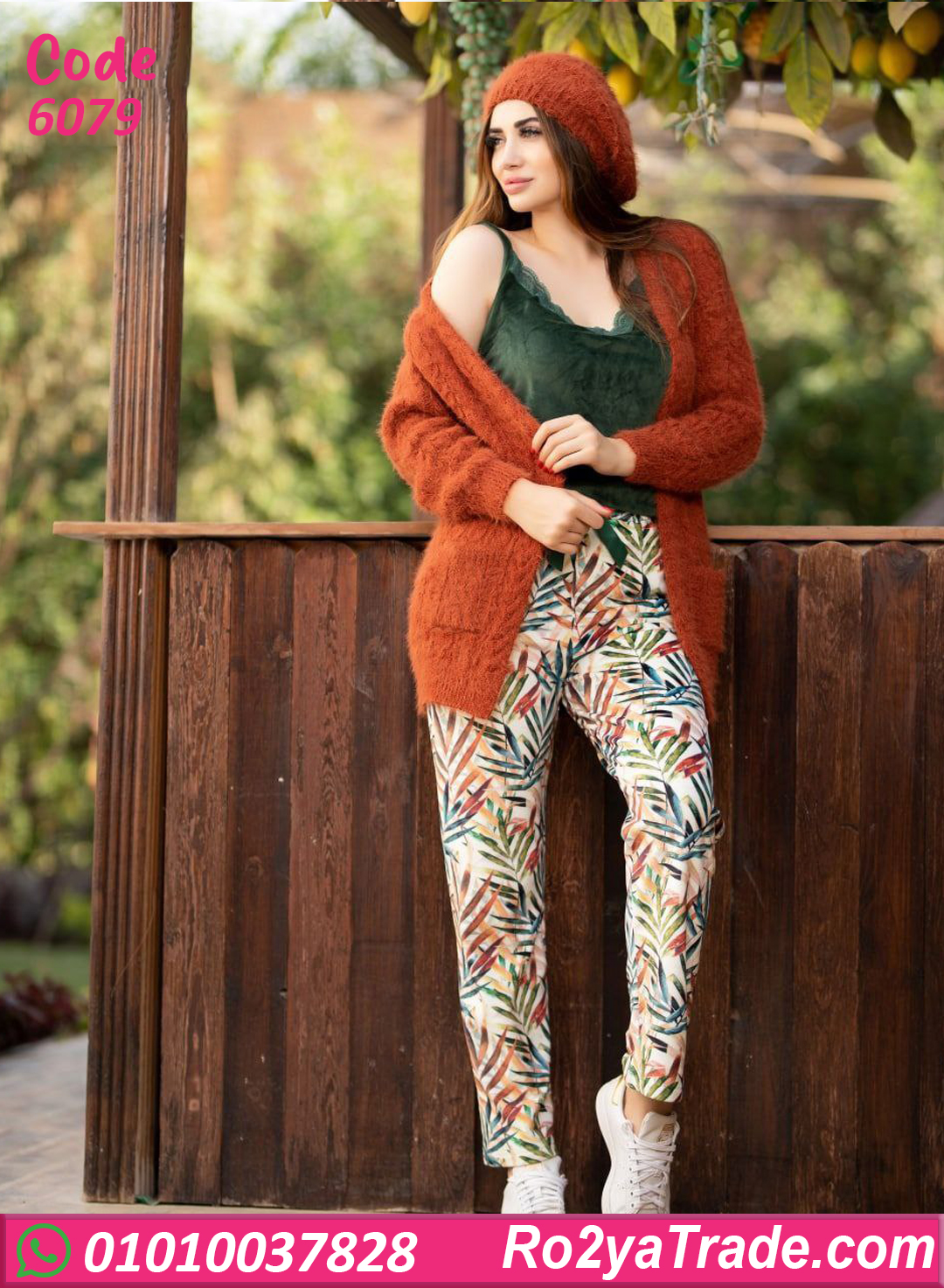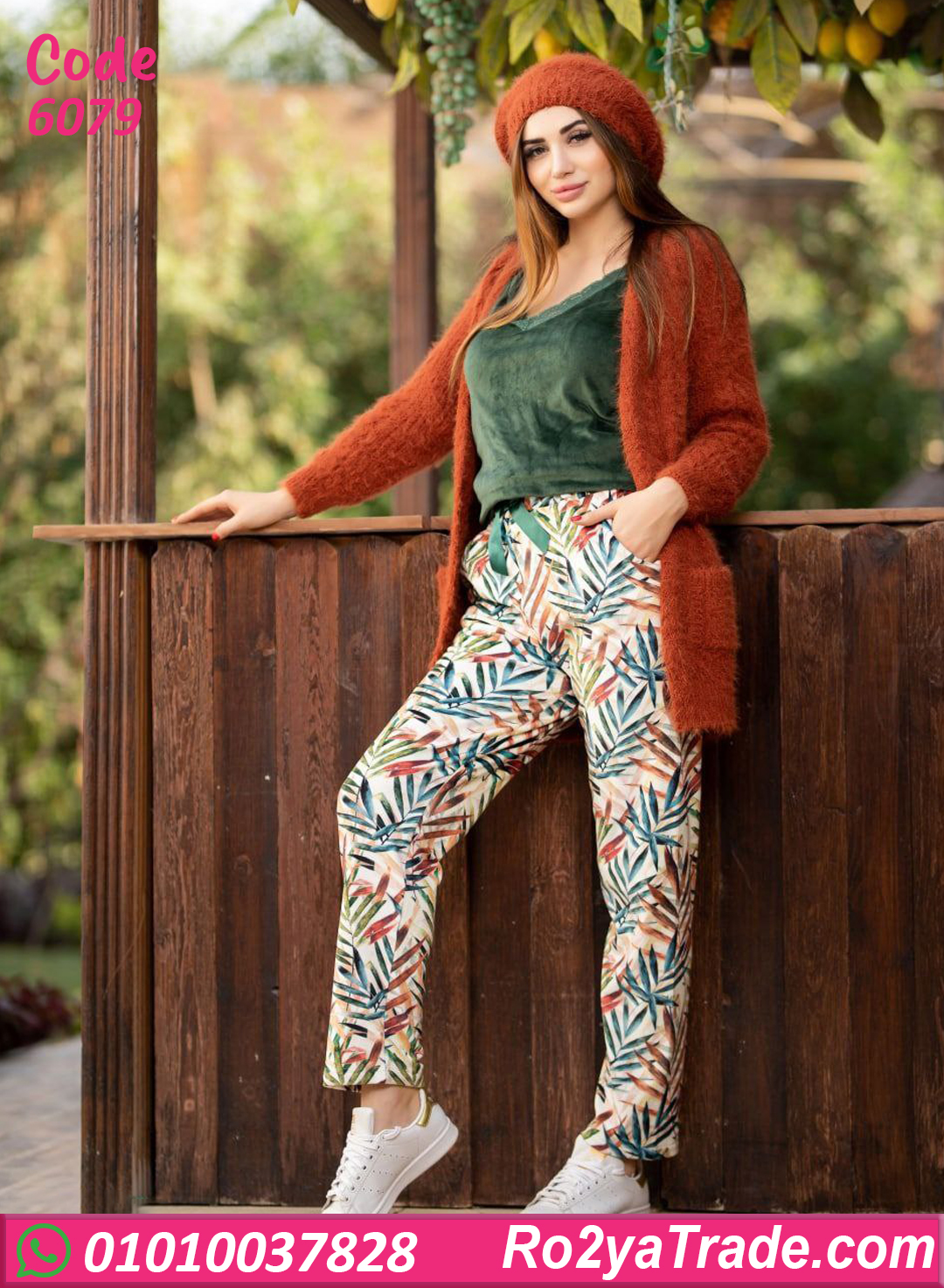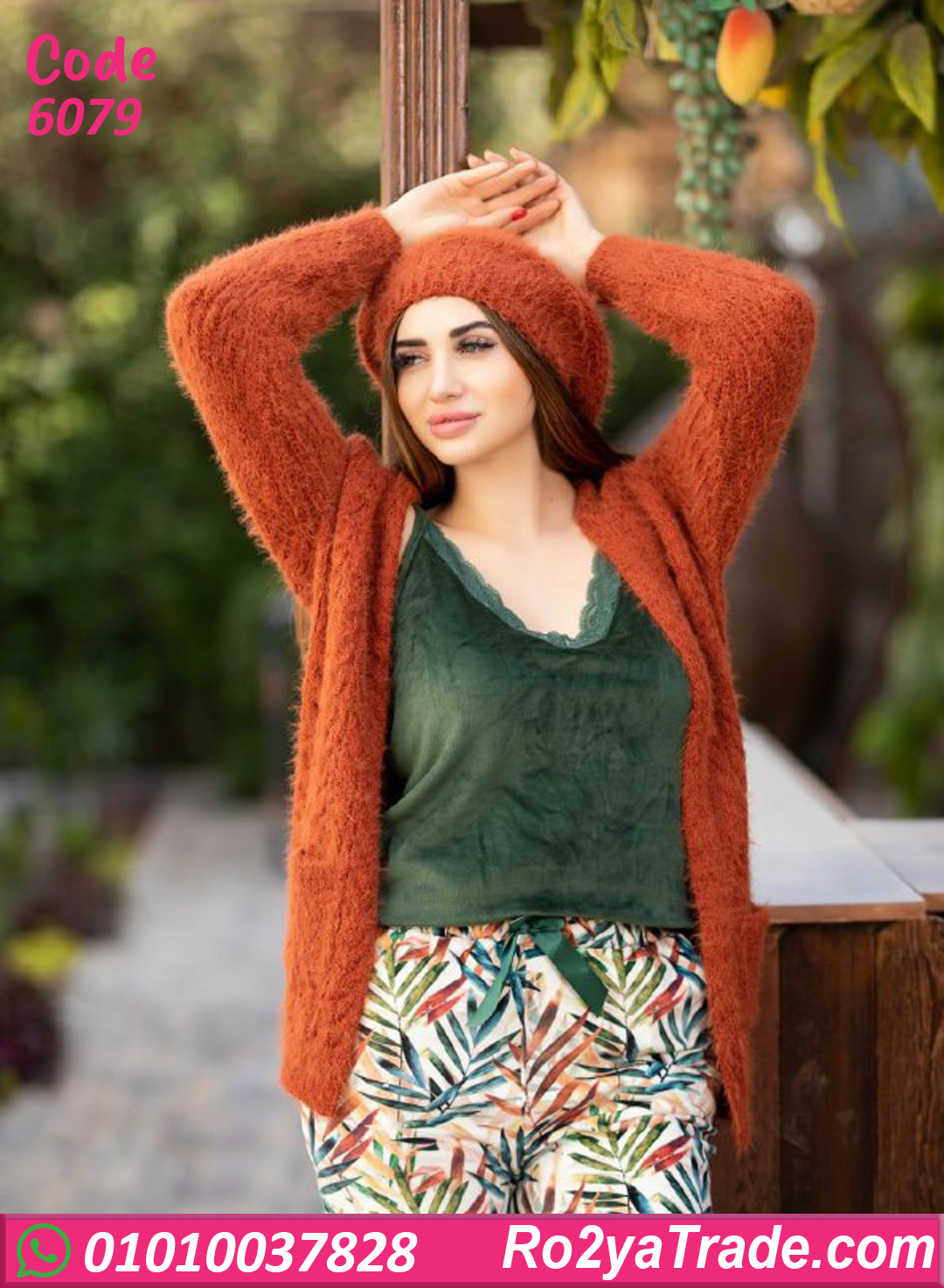 بيجامة حريمي شتوي كود 6079 اختيار مثالي لكل ست بتحب الشياكة والراحة معًا. الطقم مكوّن من توب قطيفة بحمالة بلمسة ناعمة على الجسم، ومعاه كارديجان قطيفة دافي بيدّي شكل أنيق ومناسب للجو البارد، وبنطلون مريح بنقشة أوراق مميزة بتكمّل شكل الطقم. الخامة قطيفة ناعمة ودافية، بتوفّر إحساس عالي بالراحة والدفا خصوصًا في أيام الشتاء. التصميم عملي وسهل اللبس، ومناسب للاستخدام اليومي في البيت أو أوقات الراحة، وبيجمع بين الدفا والشكل العصري.