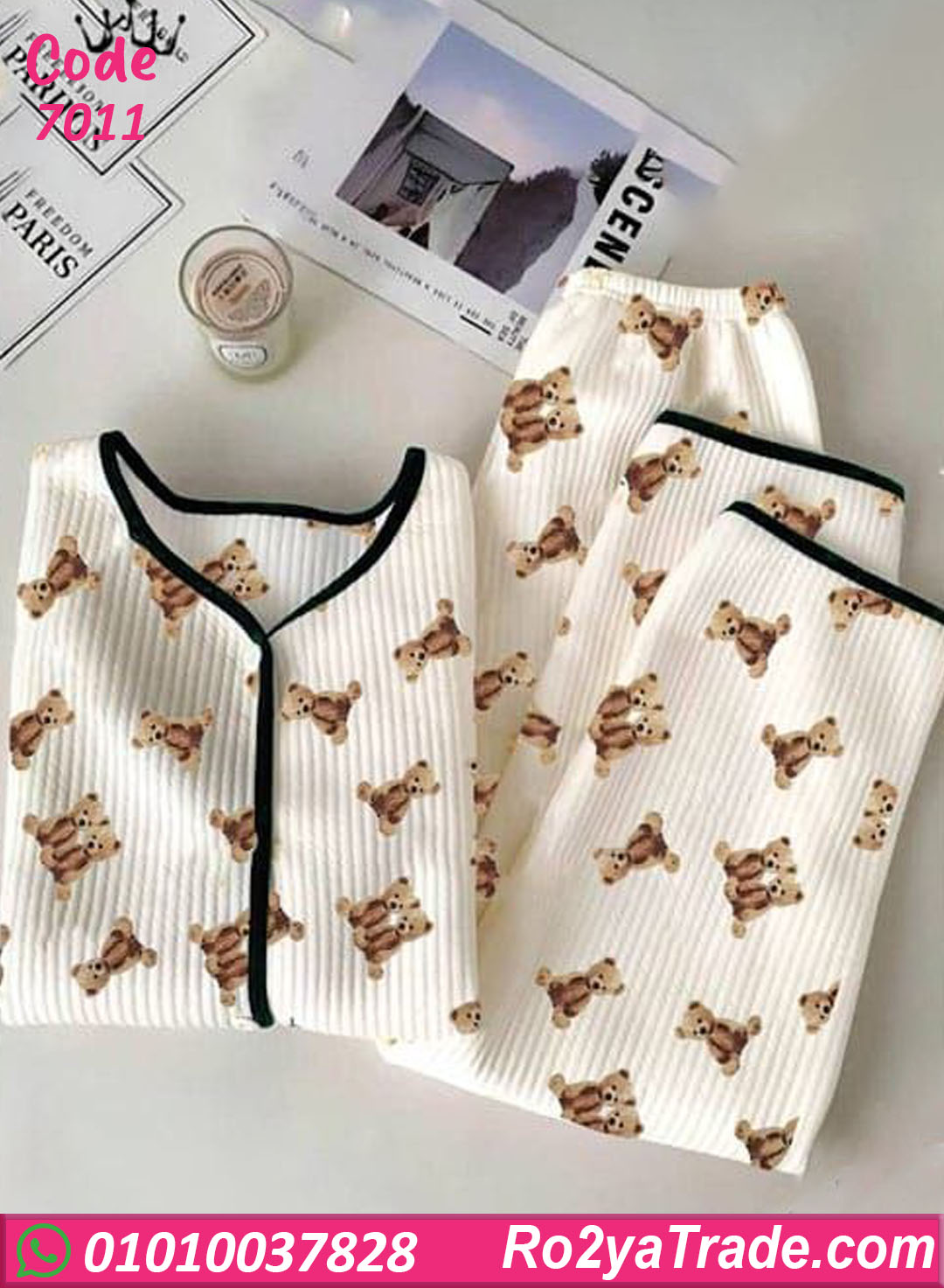 مكوّنة من قميص بأزرار وبنطلون بنقشة دبدوب لطيفة، خامة ناعمة ودافية جدًا، مناسبة للبيت وأوقات الراحة في الشتا.