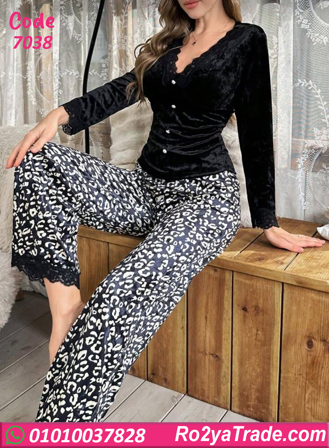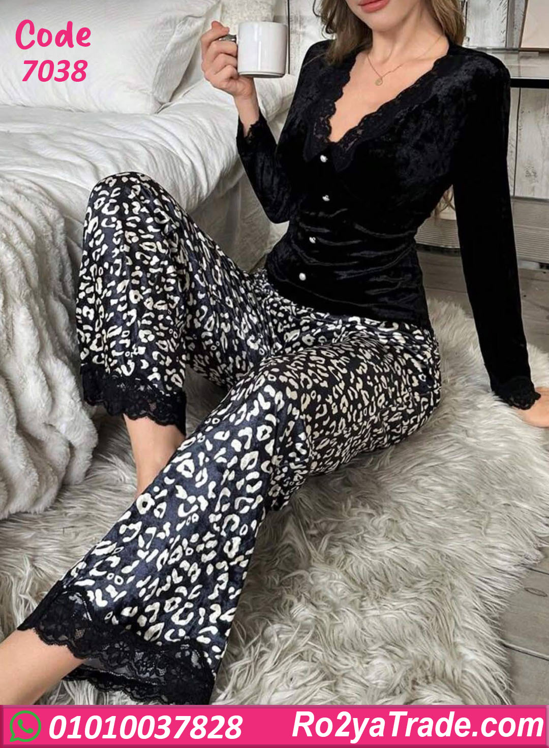 بيجامة حريمي شتوي قطعتين بتصميم أنيق وجذاب، مكوّنة من بلوزة قطيفة مزينة بدانتيل ناعم مع أزرار،