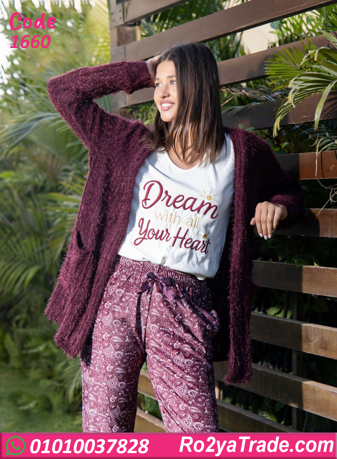 بيجامة حريمي شتوي 3 قطع كود 1660 اختيار مثالي لكل ست بتحب الدفا والراحة مع شكل أنيق ومميز. الطقم مكوّن من تيشيرت مريح بتصميم بسيط، وبنطلون بنقشة شيك، ومعاهم روب قطيفة دافي بيدي إحساس عالي بالدفا والشياكة في نفس الوقت.