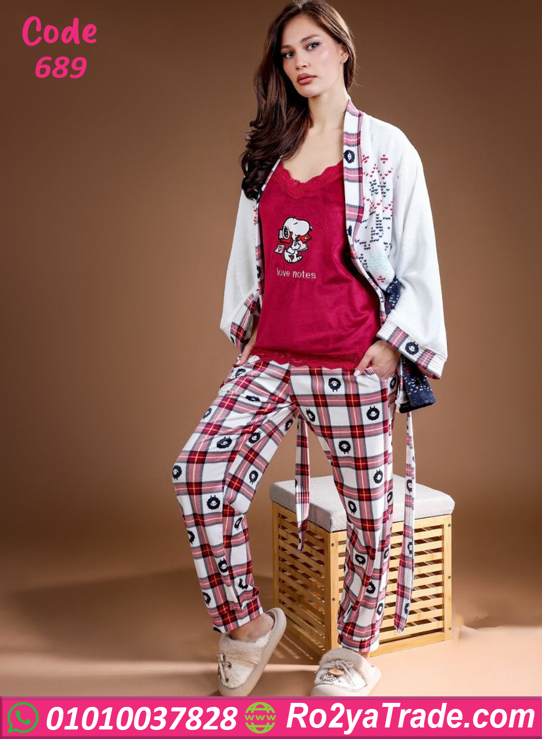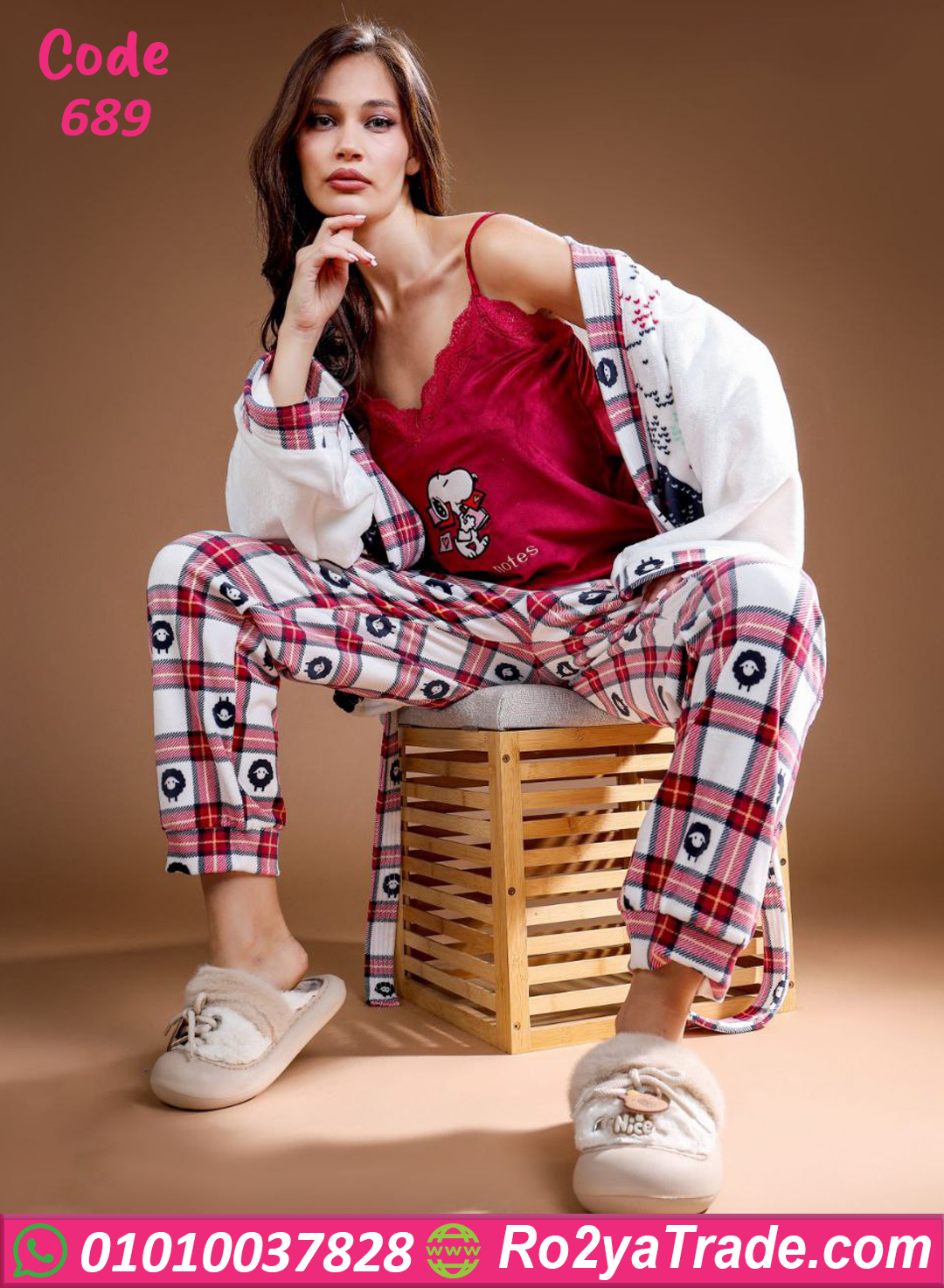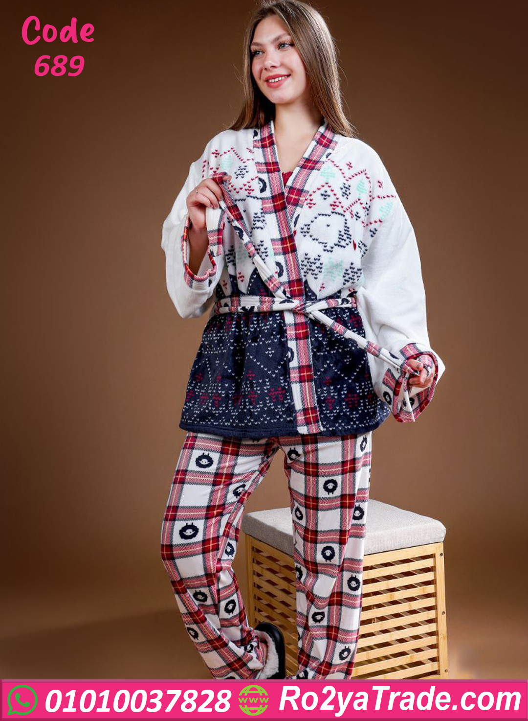 بيجامة نسائي شتوي مكونة من 3 قطع، توب بحمالات برسمة لطيفة تضيف لمسة أنثوية، مع بنطلون كاروهات مريح وعملي، وروب شتوي دافي يكمل الطقم ويزود الإحساس بالدفا. الخامة ناعمة على الجلد وبتدي راحة عالية أثناء اللبس.