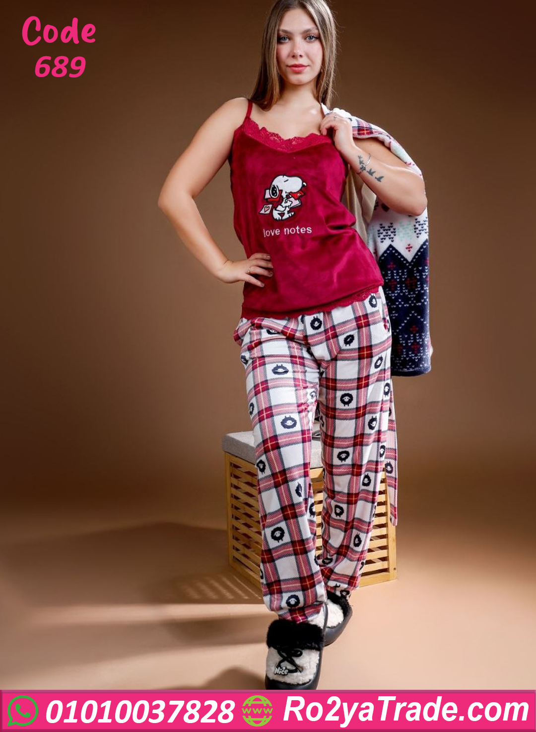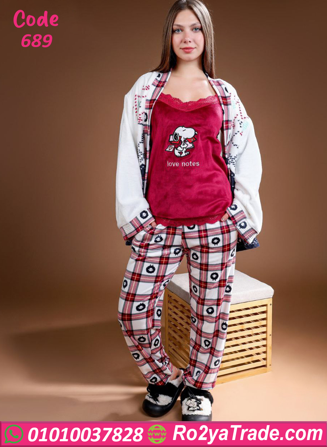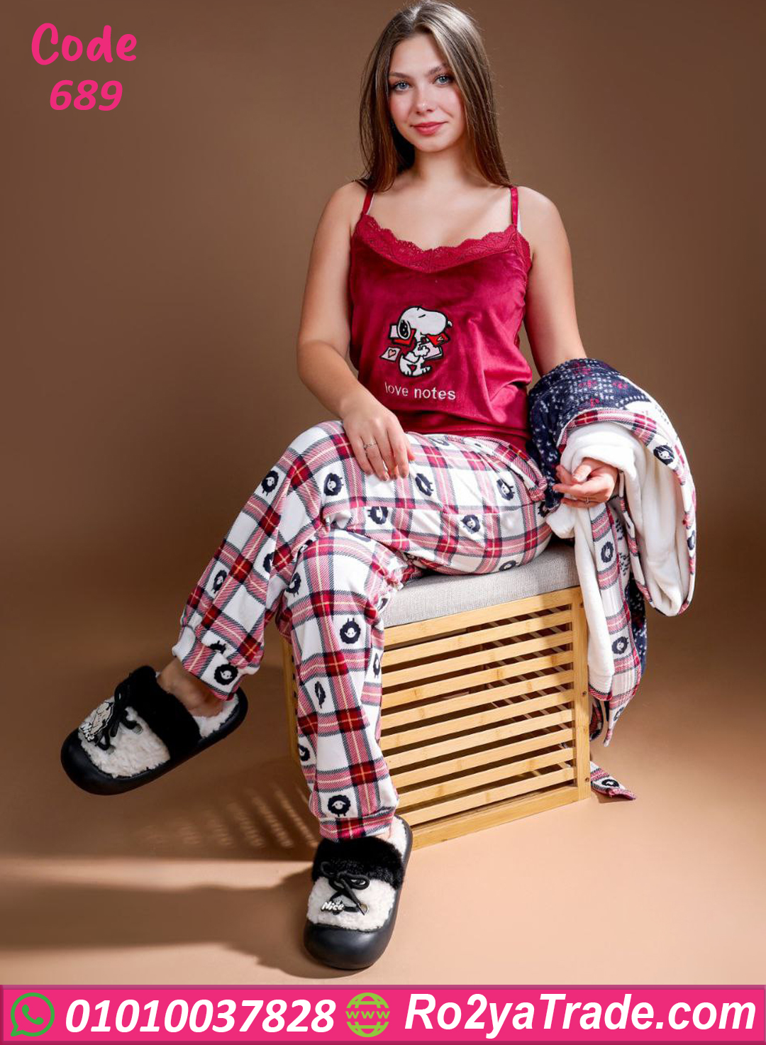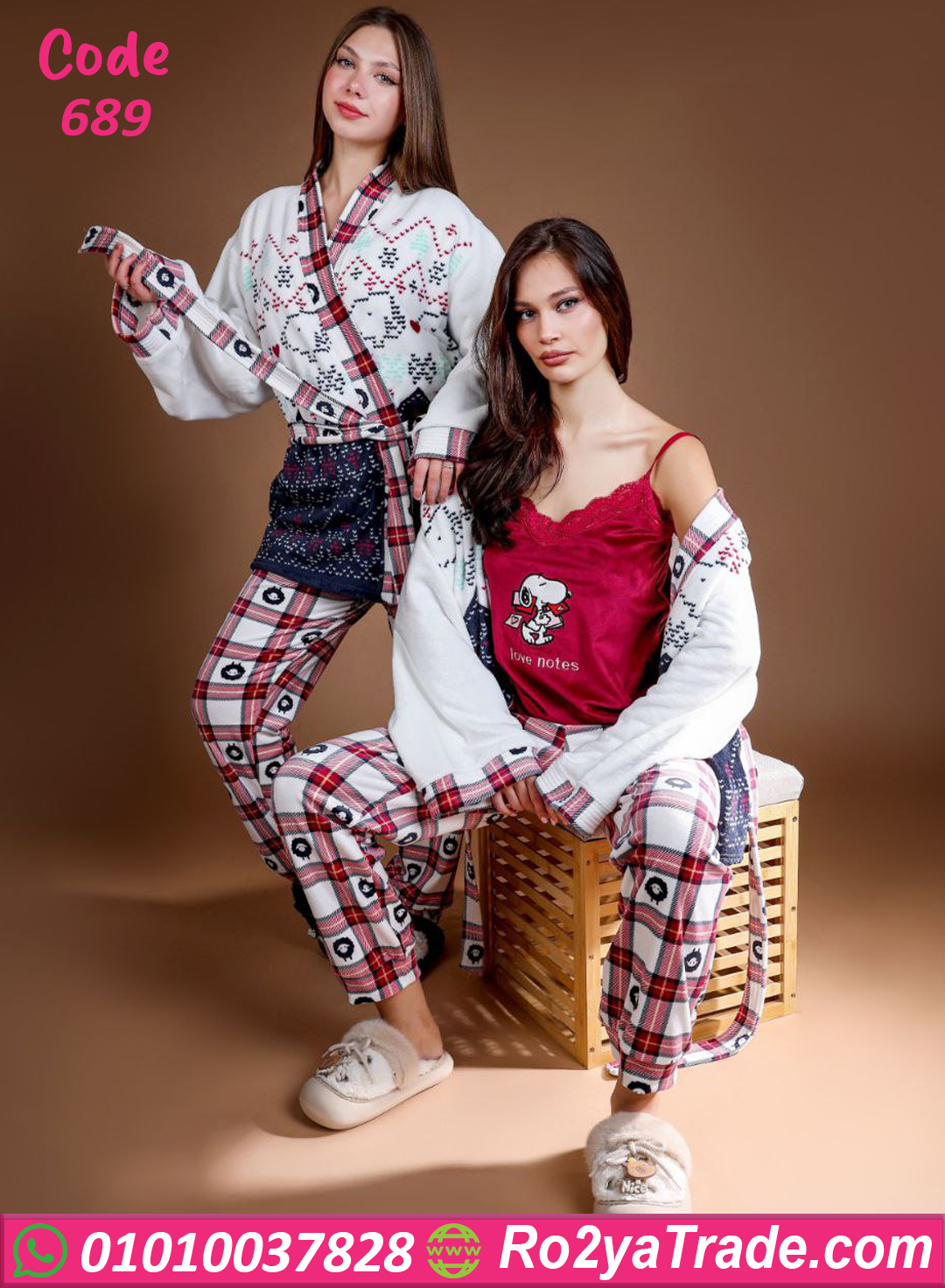 بيجامة نسائي شتوي مكونة من 3 قطع، توب بحمالات برسمة لطيفة تضيف لمسة أنثوية، مع بنطلون كاروهات مريح وعملي، وروب شتوي دافي يكمل الطقم ويزود الإحساس بالدفا. الخامة ناعمة على الجلد وبتدي راحة عالية أثناء اللبس.