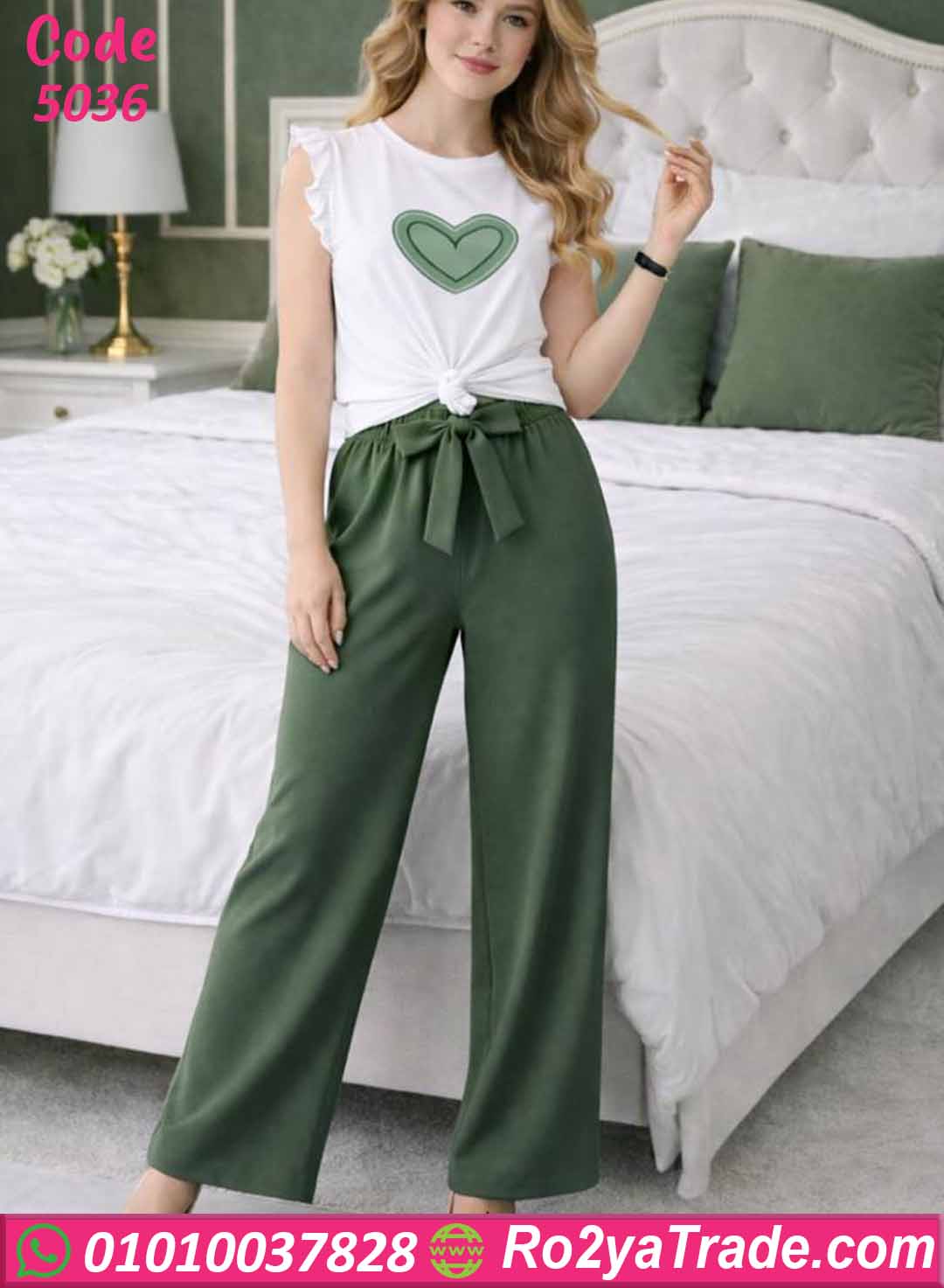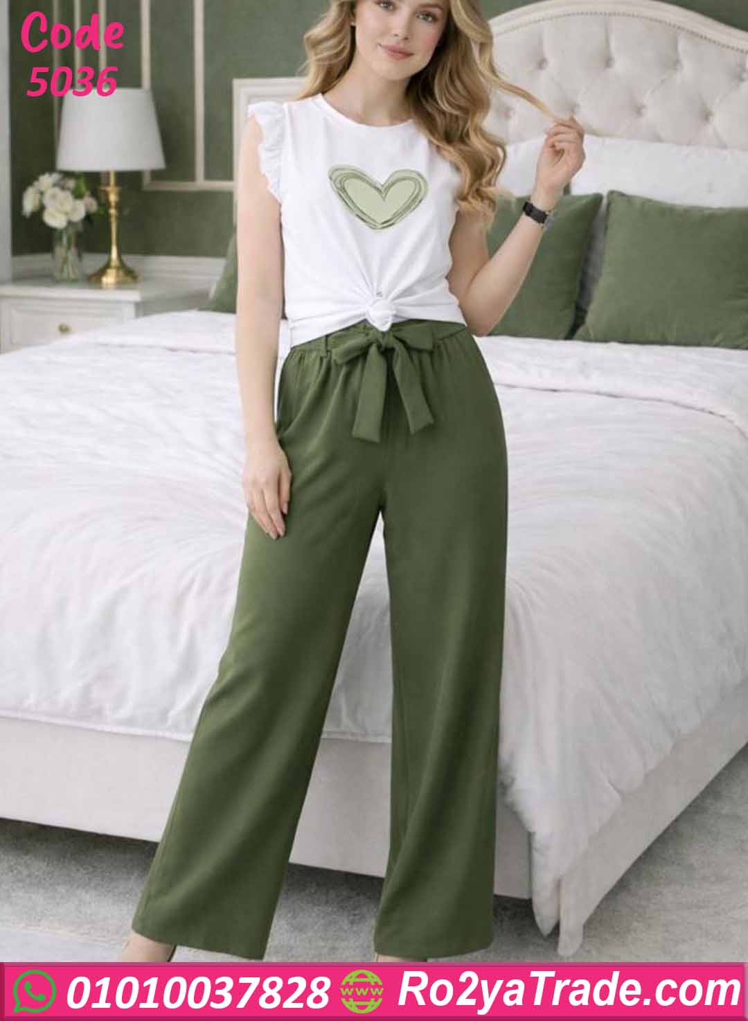 يتكون الطقم من قطعتين: توب أبيض بأكمام قصيرة مزينة بكشكشة خفيفة على الكتف مع طبعة قلب أنيقة في المنتصف تضيف لمسة ناعمة ومميزة، مع بنطلون طويل واسع بخصر مطاطي ورباط قابل للتعديل ليمنحك الراحة والثبات أثناء الحركة.