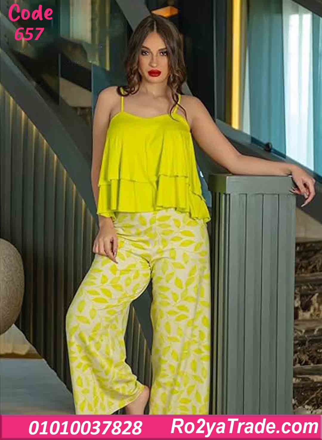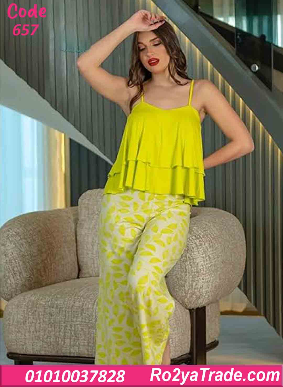 بيجامة حريمي صيفي بتصميم جريء ومنعش مكونة من توب فستوني بطبقات ناعمة وبنطال واسع مشجر بنقشة ليموني، تمنحك إطلالة حيوية ومميزة في البيت.