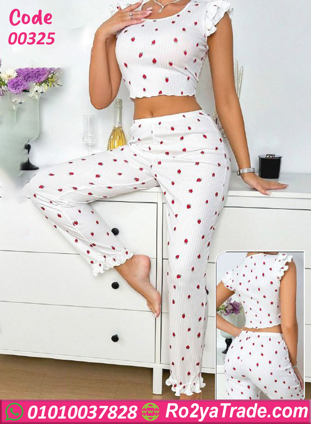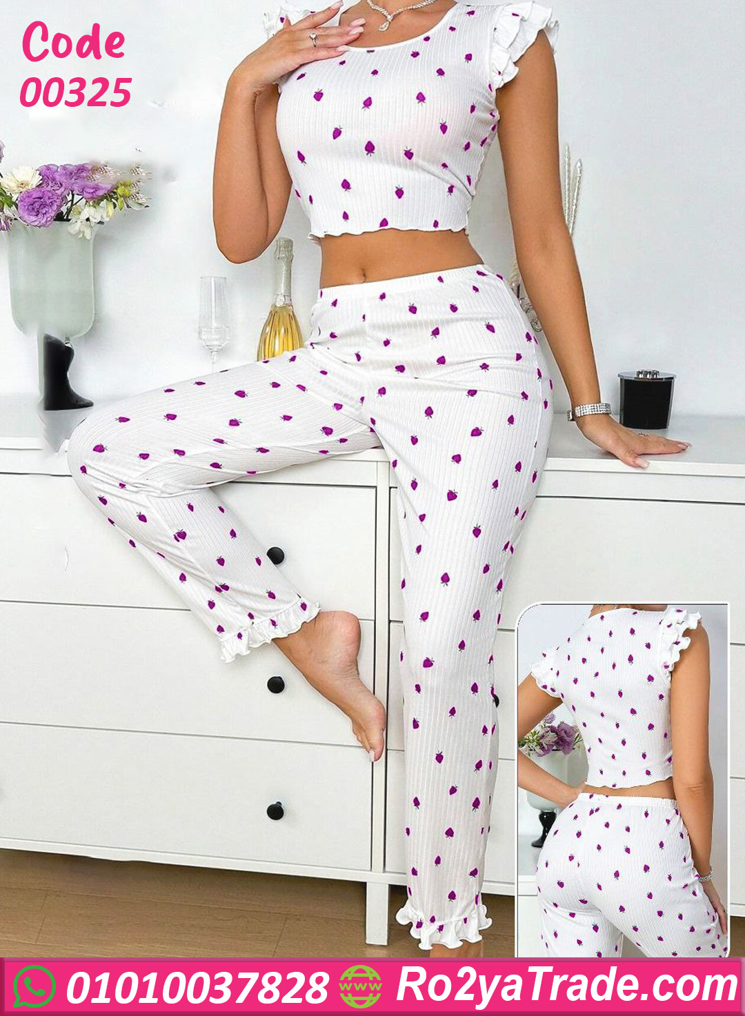 بيجامة حريمي صيفي مكوّنة من قطعتين (توب قصير + بنطلون طويل)، تصميمها ناعم وبسيط مع نقشة رقيقة تضيف لمسة أنوثة جذابة.