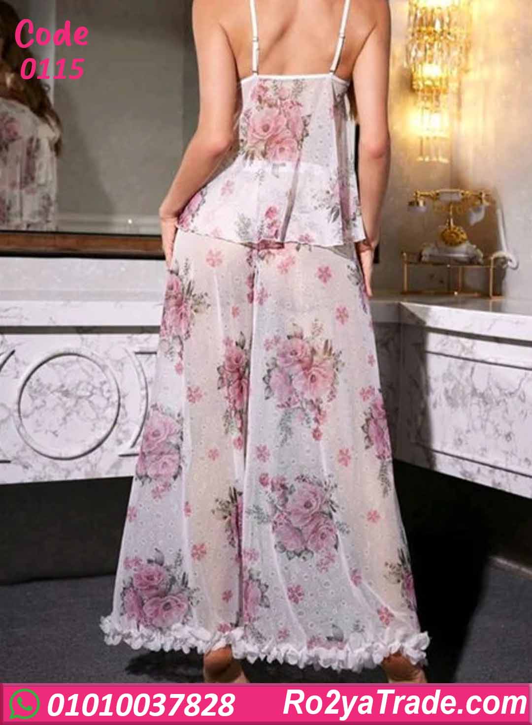 بيجامة حريمي صيفي أنيقة بتصميم رقيق ونقشة ورد ناعمة، مكوّنة من بلوزة حمالة وبنطلون واسع، مناسبة للراحة واللبس المنزلي بإطلالة أنثوية مميزة.