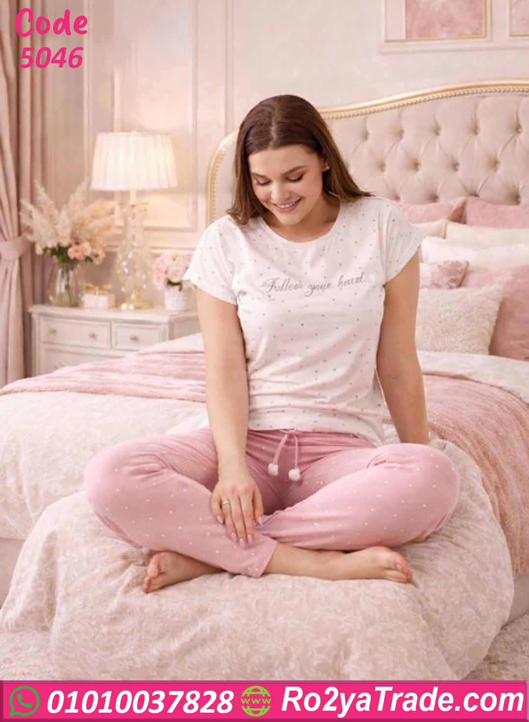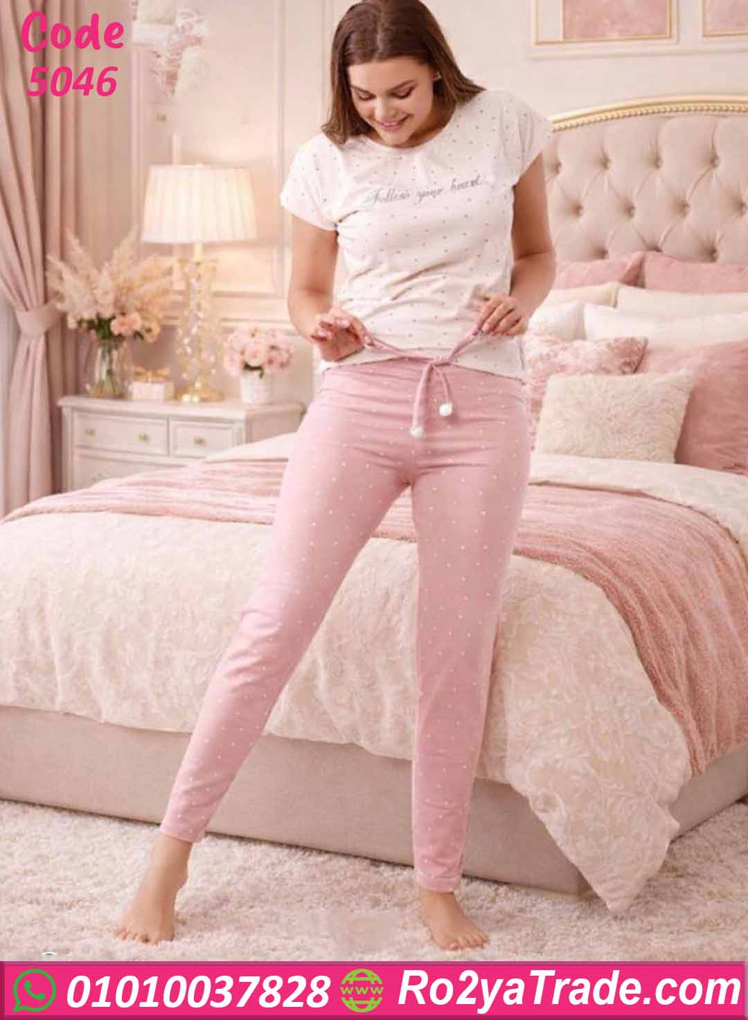بيجامة حريمي صيفي منقطة مع بنطلون وردي مريح – كود 5046