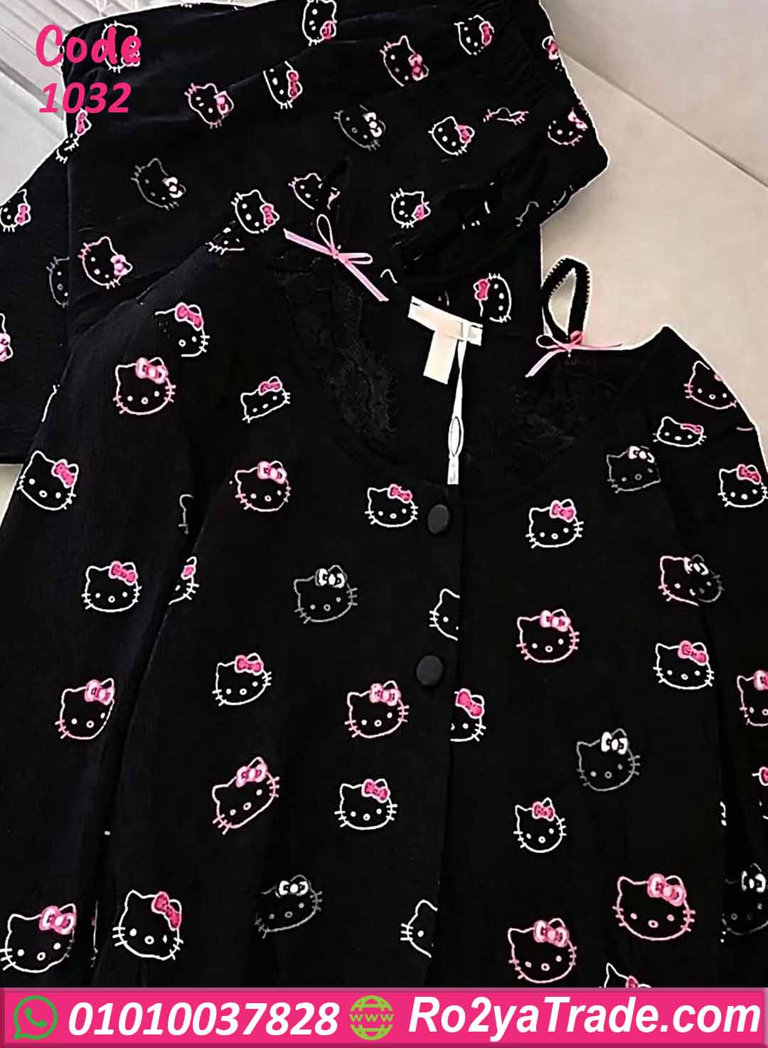 الطقم لونه أسود بنقشة هيلو كيتي صغيرة متكررة مع فيونكات وردي، ستايل كيوت جدًا ومختلف يخليكي مميزة في البيت.