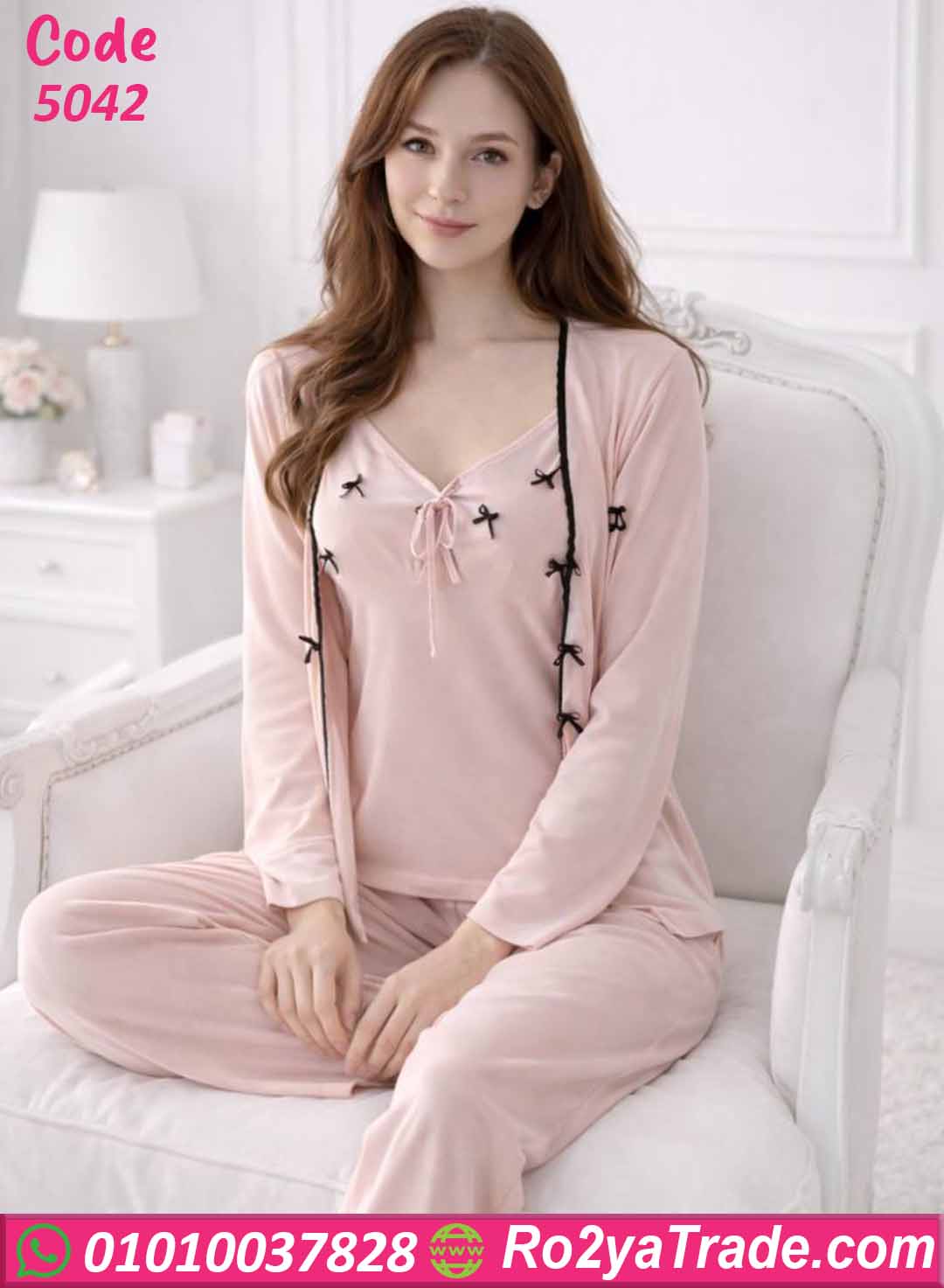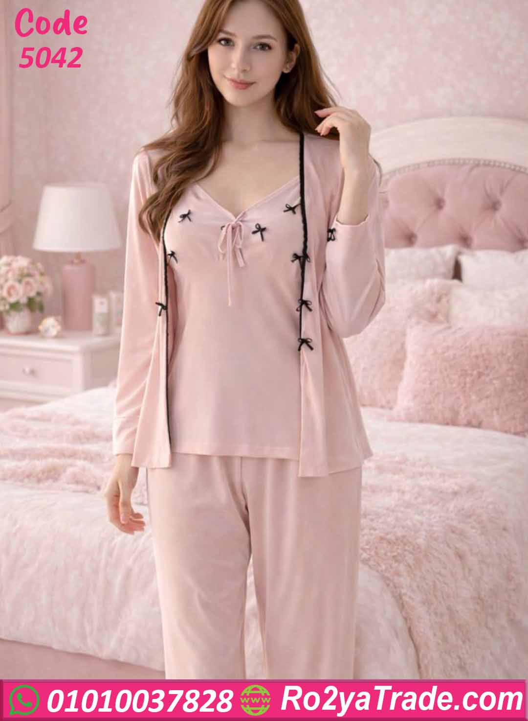 بيجامة حريمي صيفي 3 قطع بتفاصيل فيونكة أنيقة – كود 5042