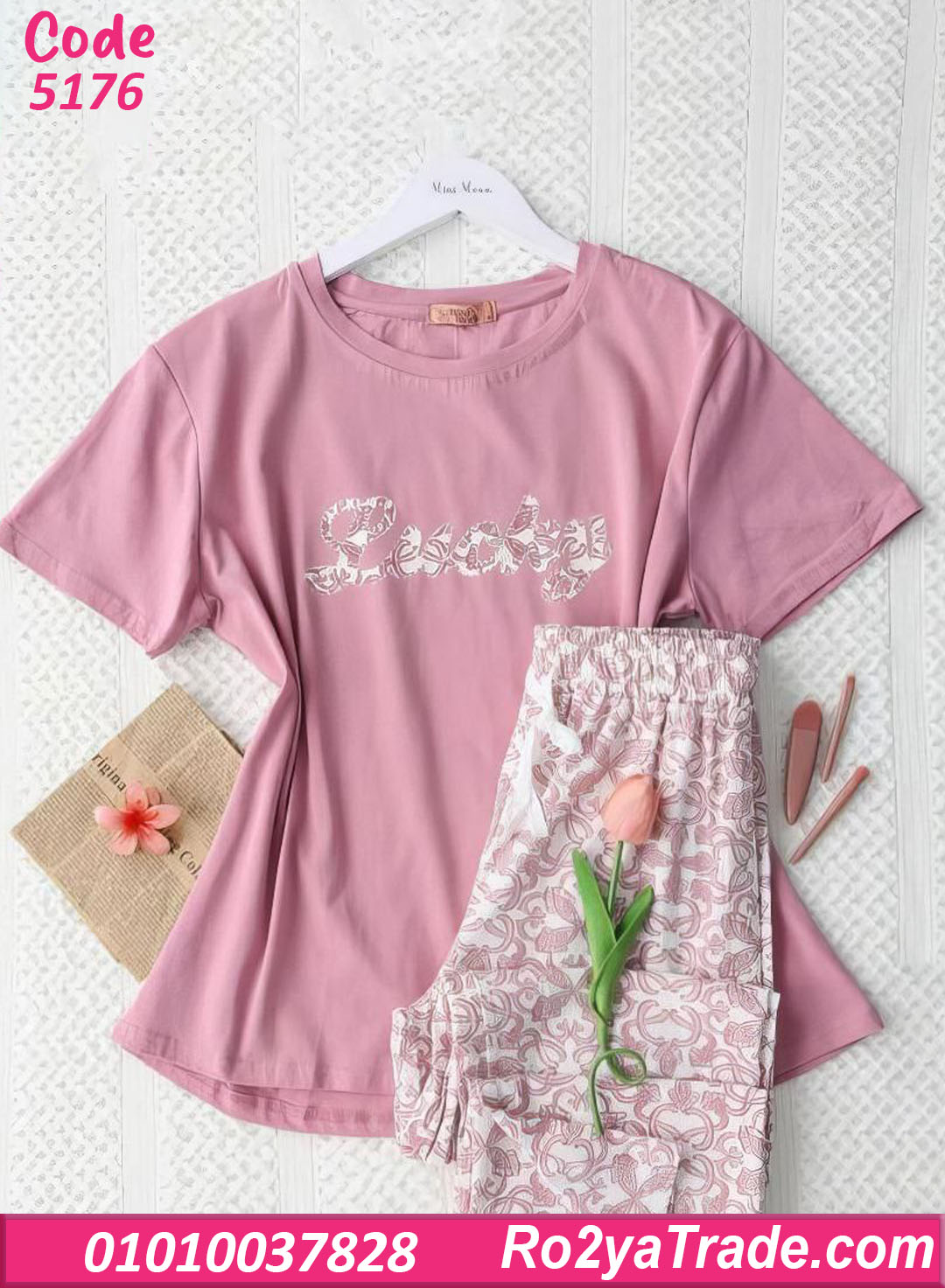 تيشيرت نص كم بلون هادي مكتوب عليه Desady بشكل أنيق، مع بنطلون طويل بنقشة ناعمة متناسقة تضيف لمسة رقيقة وجذابة.