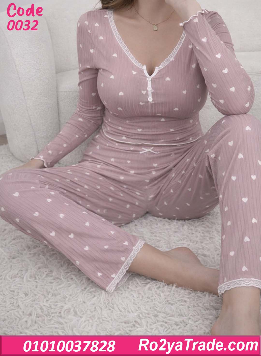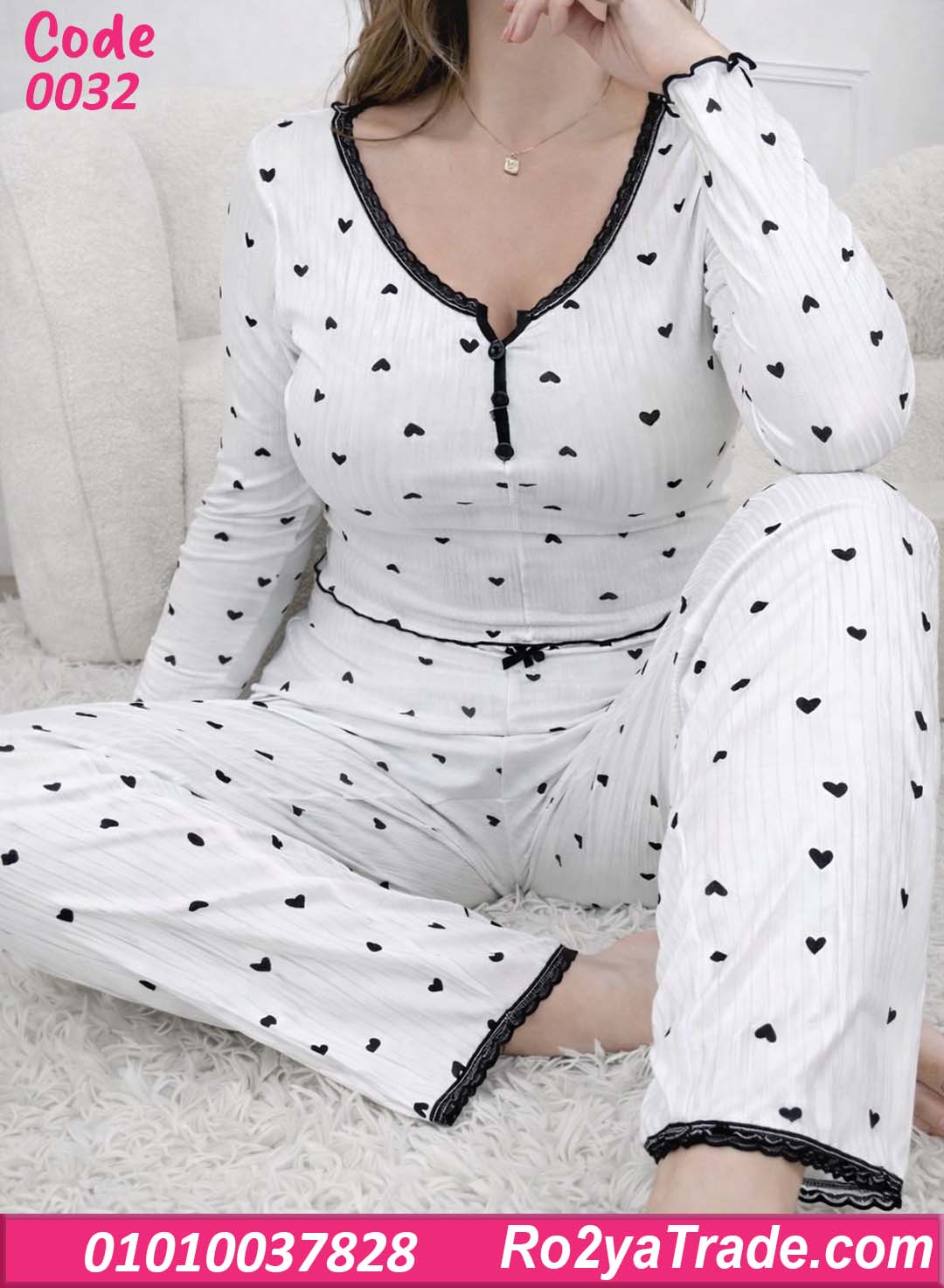 الموديل عبارة عن بيجامة قطعتين (بلوزة + بنطلون) بتصميم بسيط وشيك مع نقشة القلوب الصغيرة اللي بتدي شكل لطيف وجذاب،