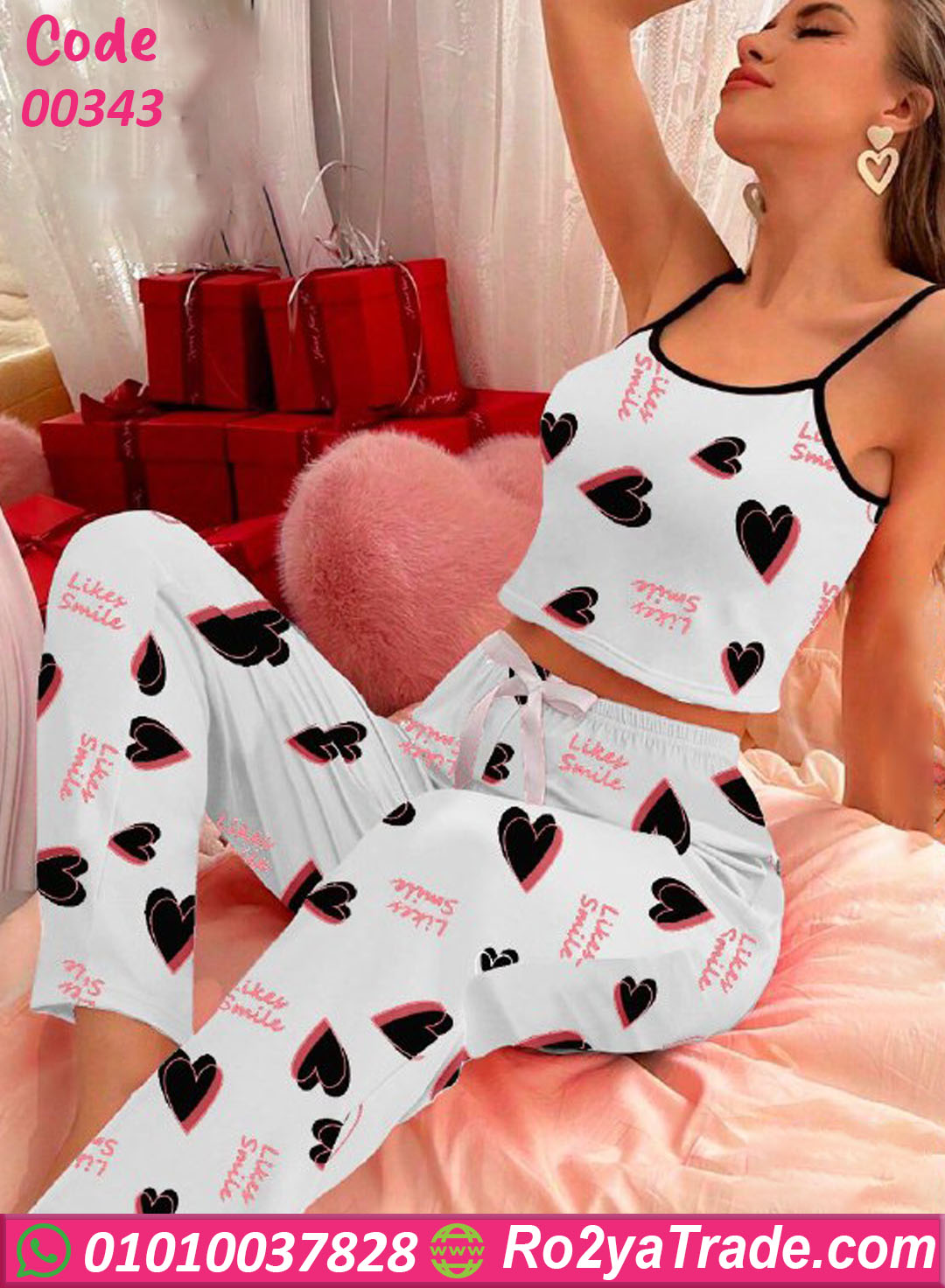 بيجامة حريمي صيفي بتصميم عصري بنقشة قلوب جذابة، تمنحك إطلالة مريحة وأنثوية في البيت.