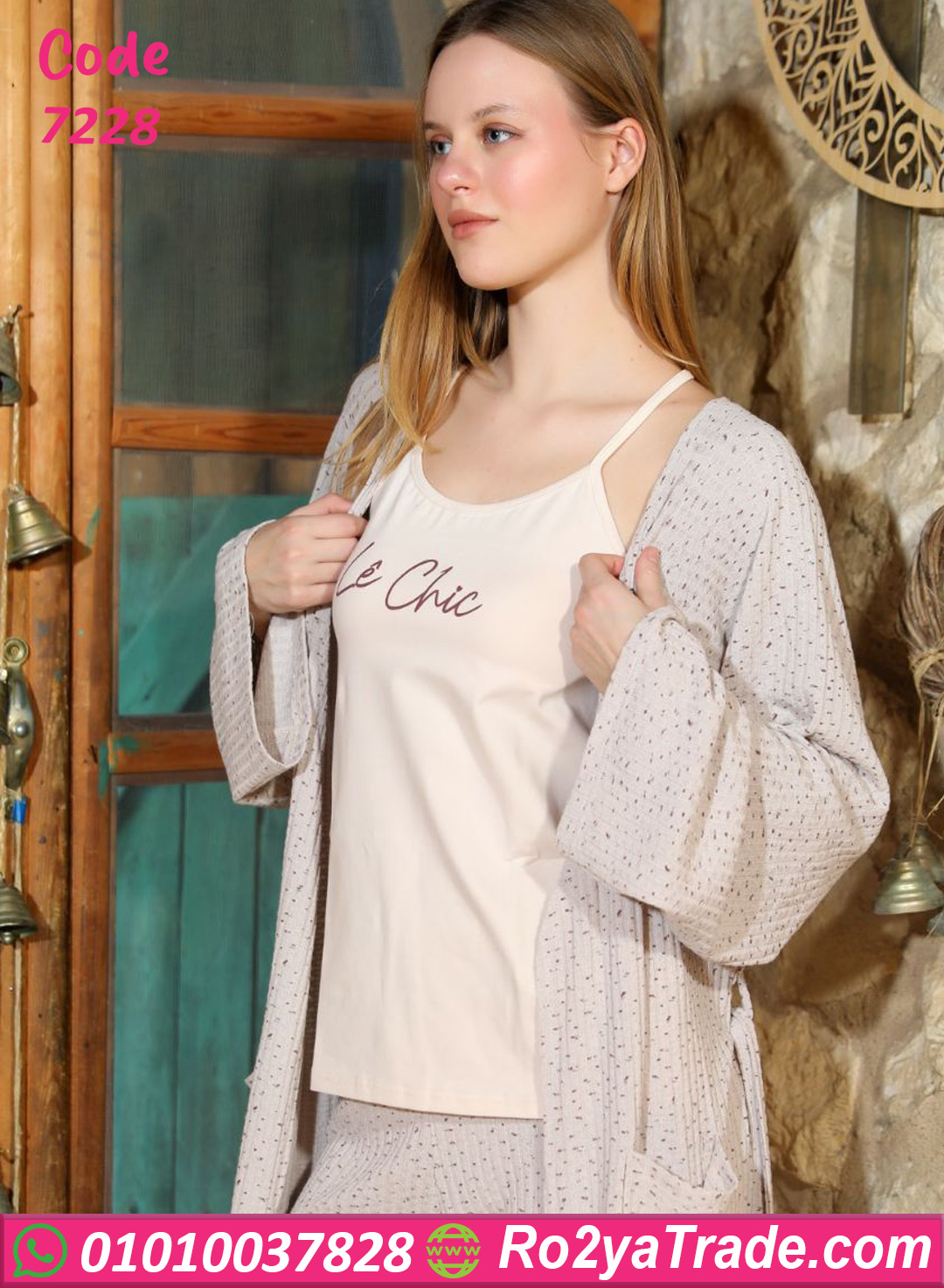 بيجامة حريمي شتوى بتصميم أنثوي ناعم يناسب الستات اللي بتحب الراحة مع الشياكة. الطقم مكوّن من توب وبنطلون مع روب خفيف، خامته ناعمة وخفيفة ومريحة في الحركة. مناسب للاستخدام اليومي في البيت أو وقت الاسترخاء، وبيتميز بشكل هادي وألوان بسيطة تليق بكل الأذواق. اختيار مثالي لستايل هوم وير شيك ومريح. كود 7228
