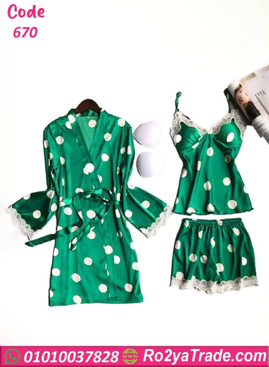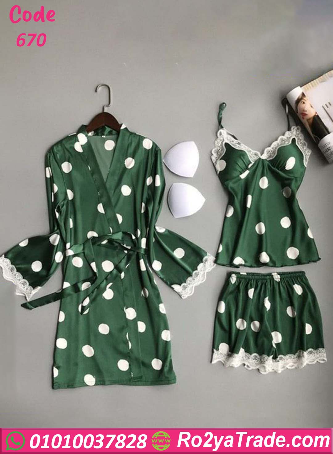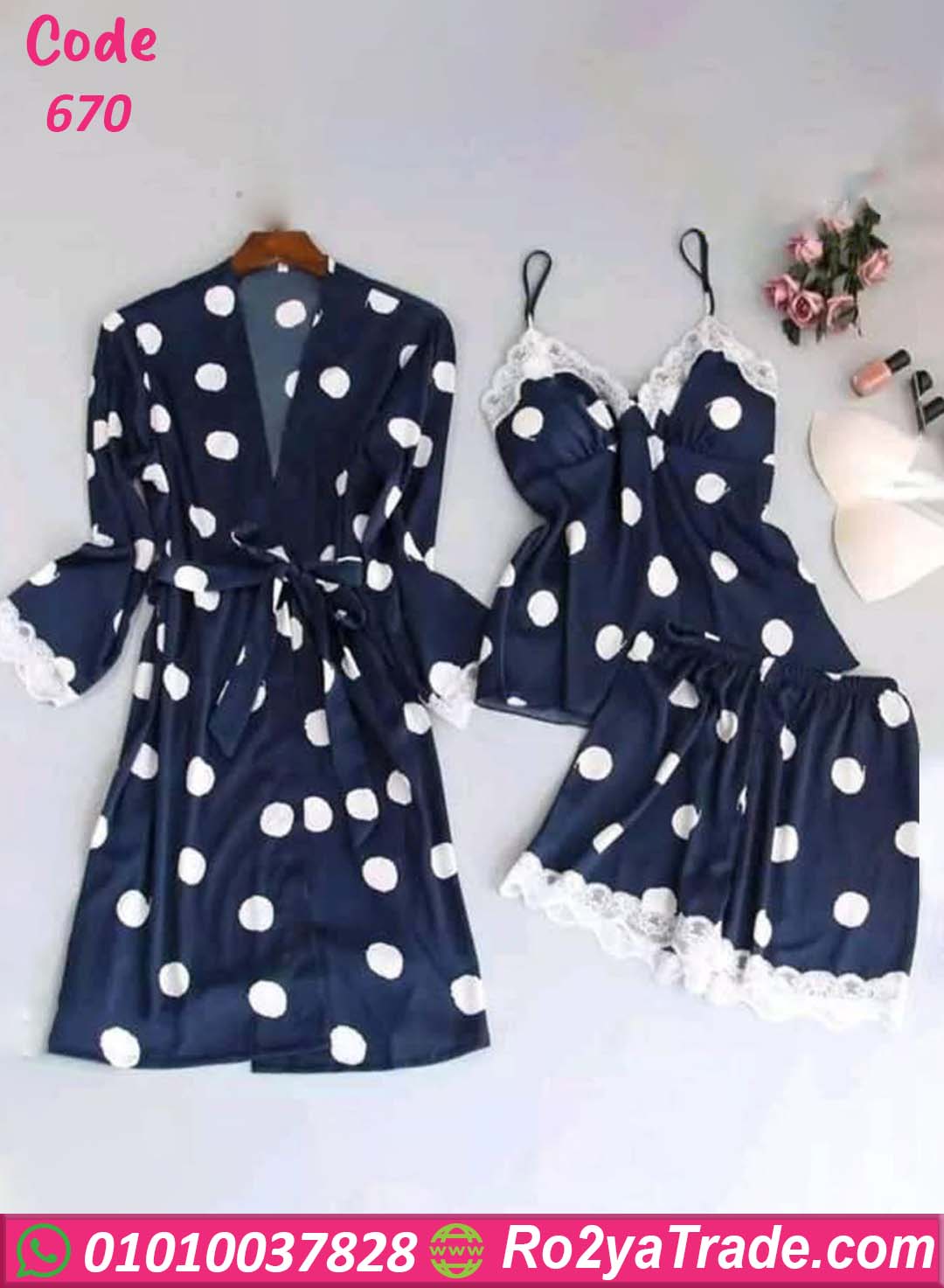 طقم بيجامة حريمي صيفي أنيق يتكون من 3 قطع: توب بحمالات رفيعة، هوت شورت مريح، وروب خفيف بتصميم نقاط جذابة يمنحك إطلالة أنثوية شيك داخل المنزل.