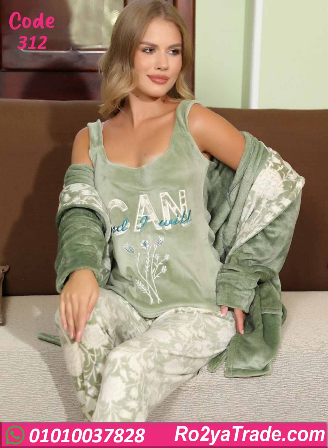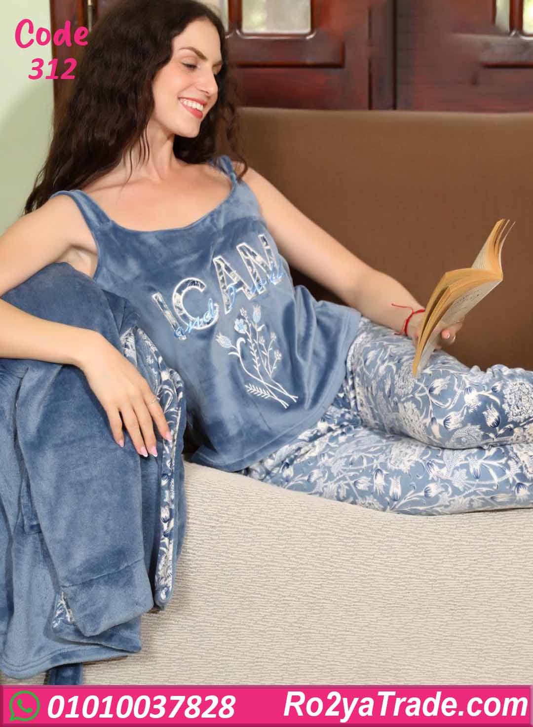 بيجامة حريمي شتوي شيك ومريحة، مكوّنة من توب وبنطلون مع روب دافي، مناسبة للبس اليومي داخل البيت وبتدي إحساس عالي بالراحة والدفا مع شكل أنيق.