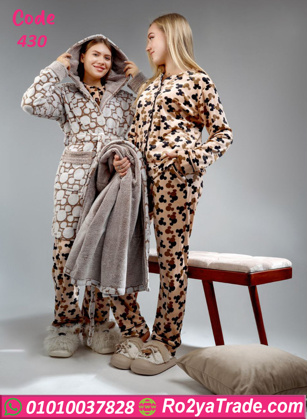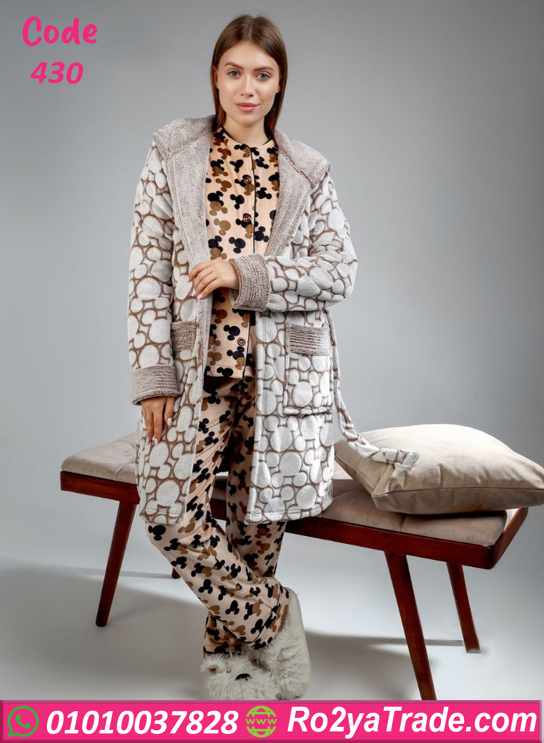 بيجامة حريمي شتوي شيك مكوّنة من 3 قطع (بلوزة + بنطلون + روب)، تصميم أنيق برسمة ميكي، خامة تقيلة ودافية جدًا، مثالية للبيت والراحة في أيام الشتاء الباردة.
