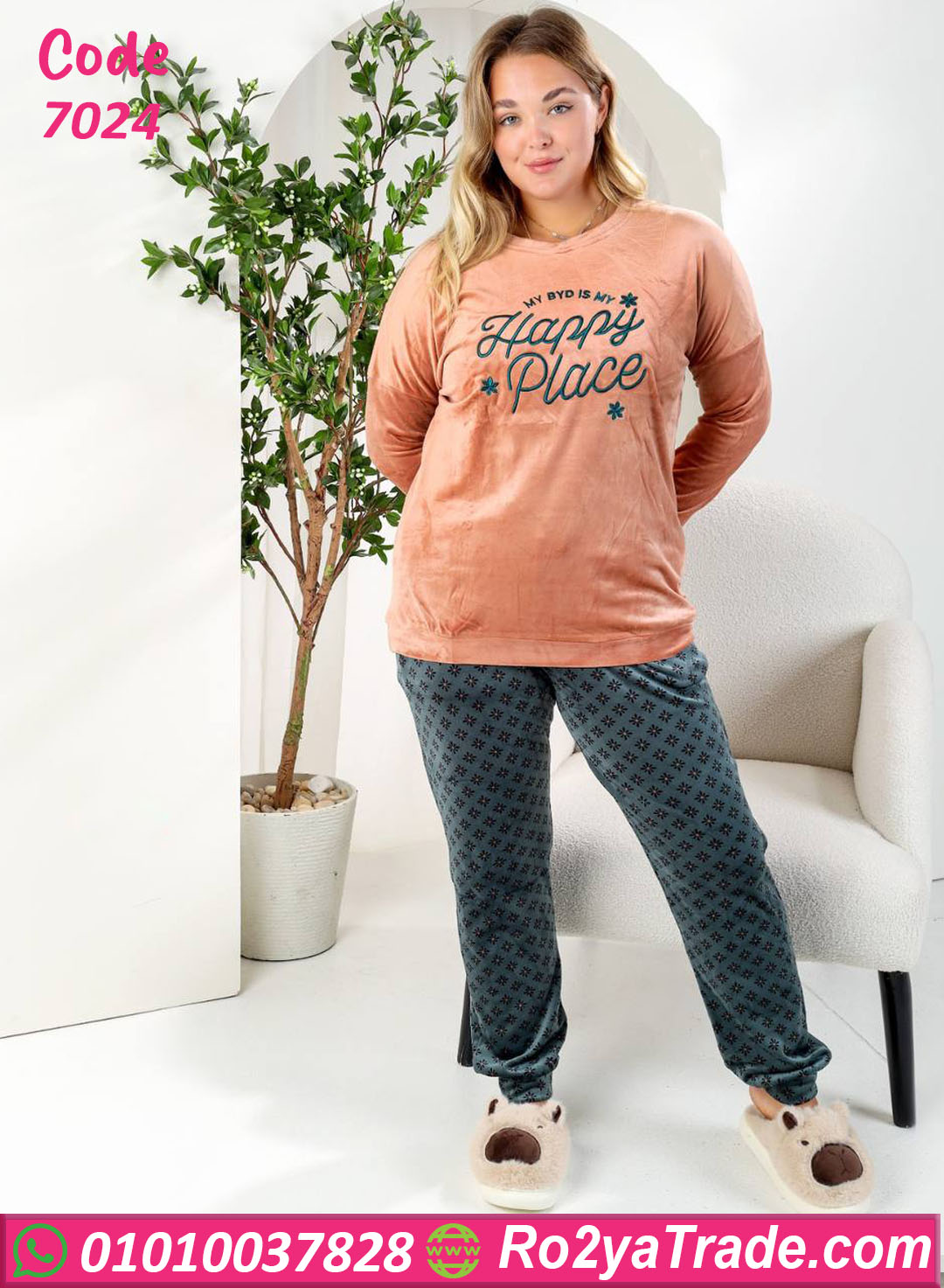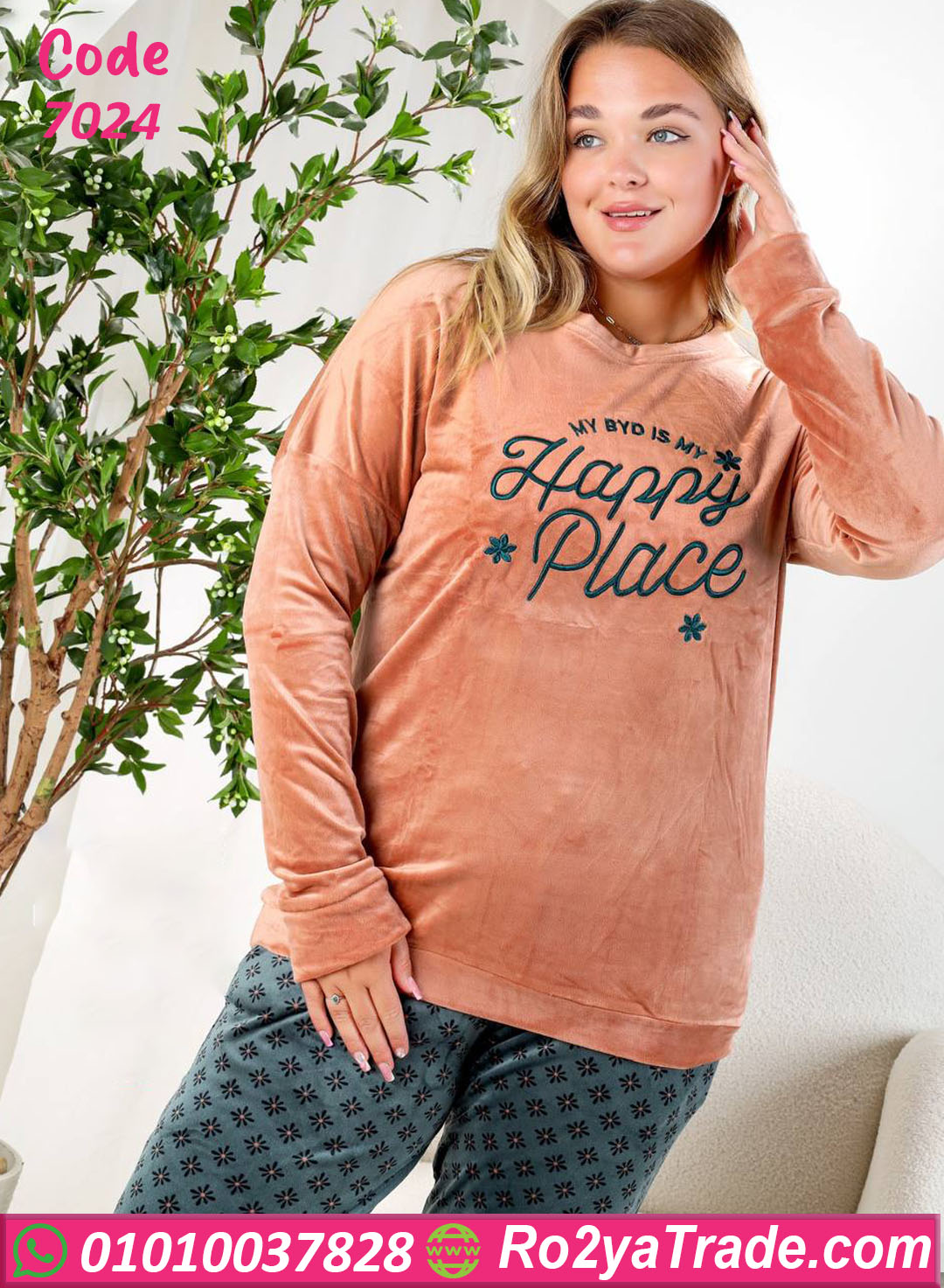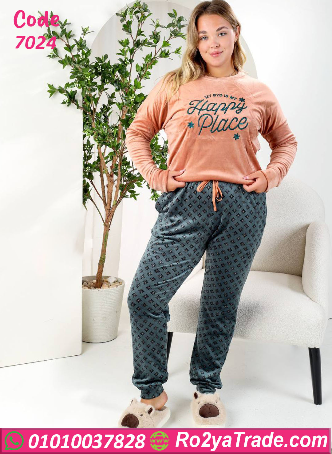بيجامة شتوي أنيقة بخامة قطيفة ناعمة، بتجمع بين الراحة والشياكة. البلوزة بلون خوخي هادي مكتوب عليها “Happy Place” بتدي إحساس بالدفا والتفاؤل، والبنطلون بلون رمادي منقوش بنقشة بسيطة تضيف لمسة أنوثة. الخامة تقيلة ومبطنة من جوه علشان تحافظ على دفئك طول الشتاء، وكمان مش بتكش ولا تفقد لونها بعد الغسيل. مناسبة للبيت أو للبس مريح في الشتاء، بستايل أنثوي جذاب ومودرن جدًا.