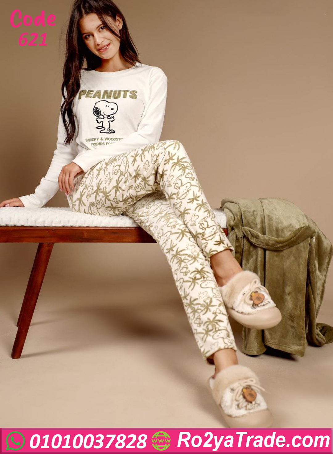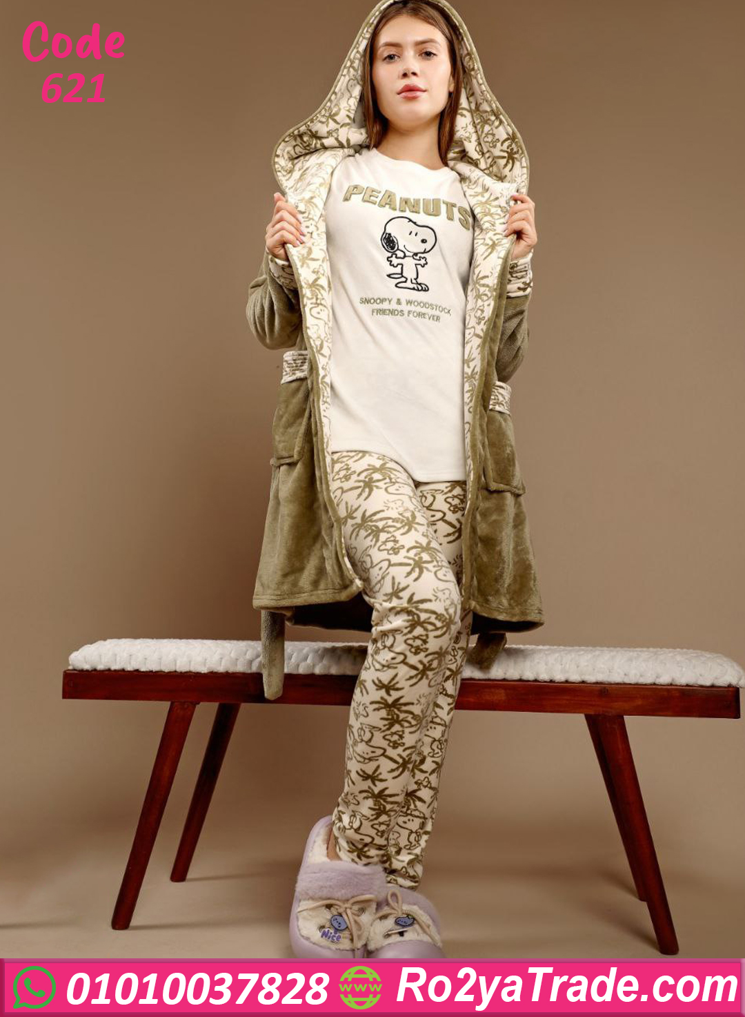الطقم عبارة عن توب مطبوع بشخصية Snoopy اللطيفة، وبنطلون بنفس النقشة المتناسقة، ومعاهم روب شيك جدًا بخامة طرية وأكمام مريحة بتدي إحساس بالدفا والراحة.