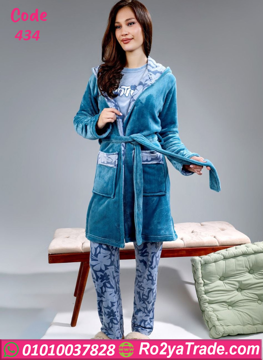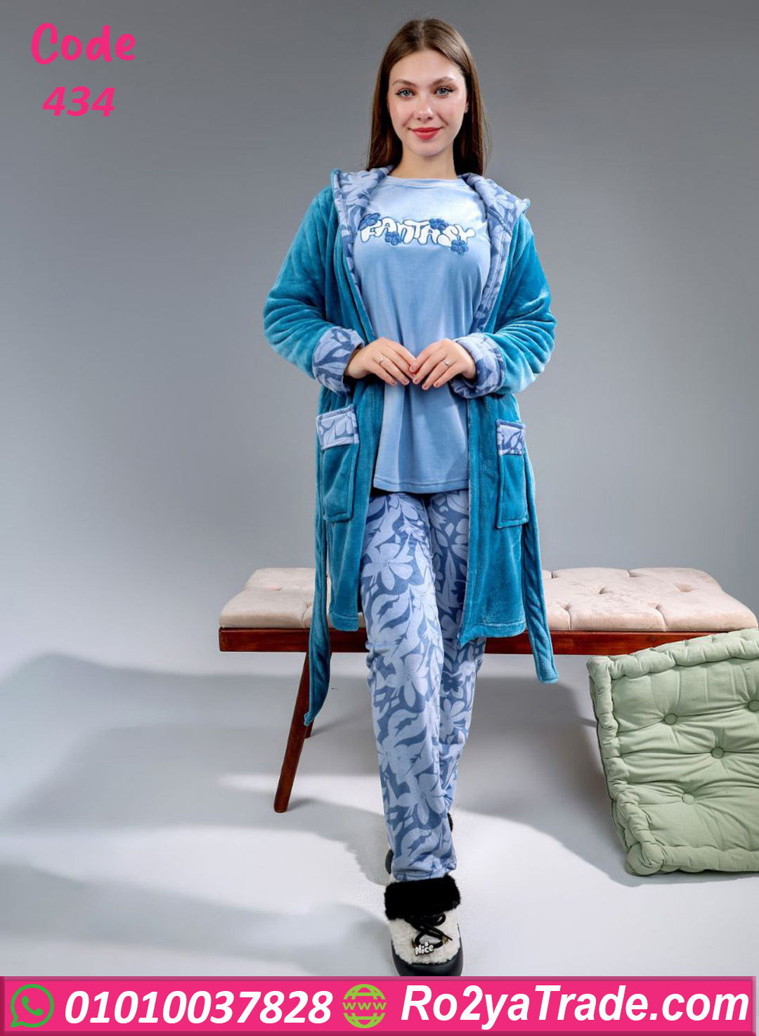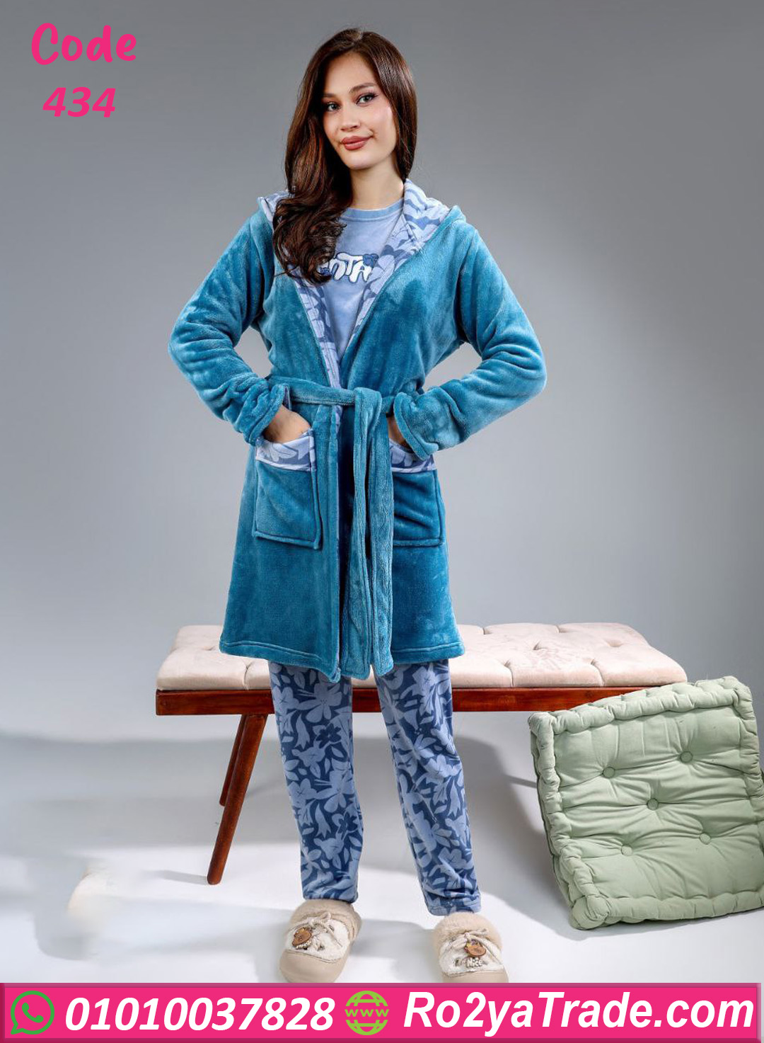 بيجامة شتوي حريمي أنيقة مكونة من 3 قطع (تيشيرت + بنطلون + روب)، خامة ناعمة ودافية جدًا، مريحة في اللبس ومناسبة للاستخدام اليومي في البيت وأيام الشتاء الباردة.