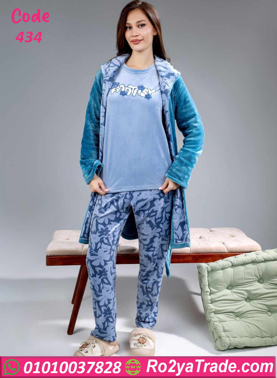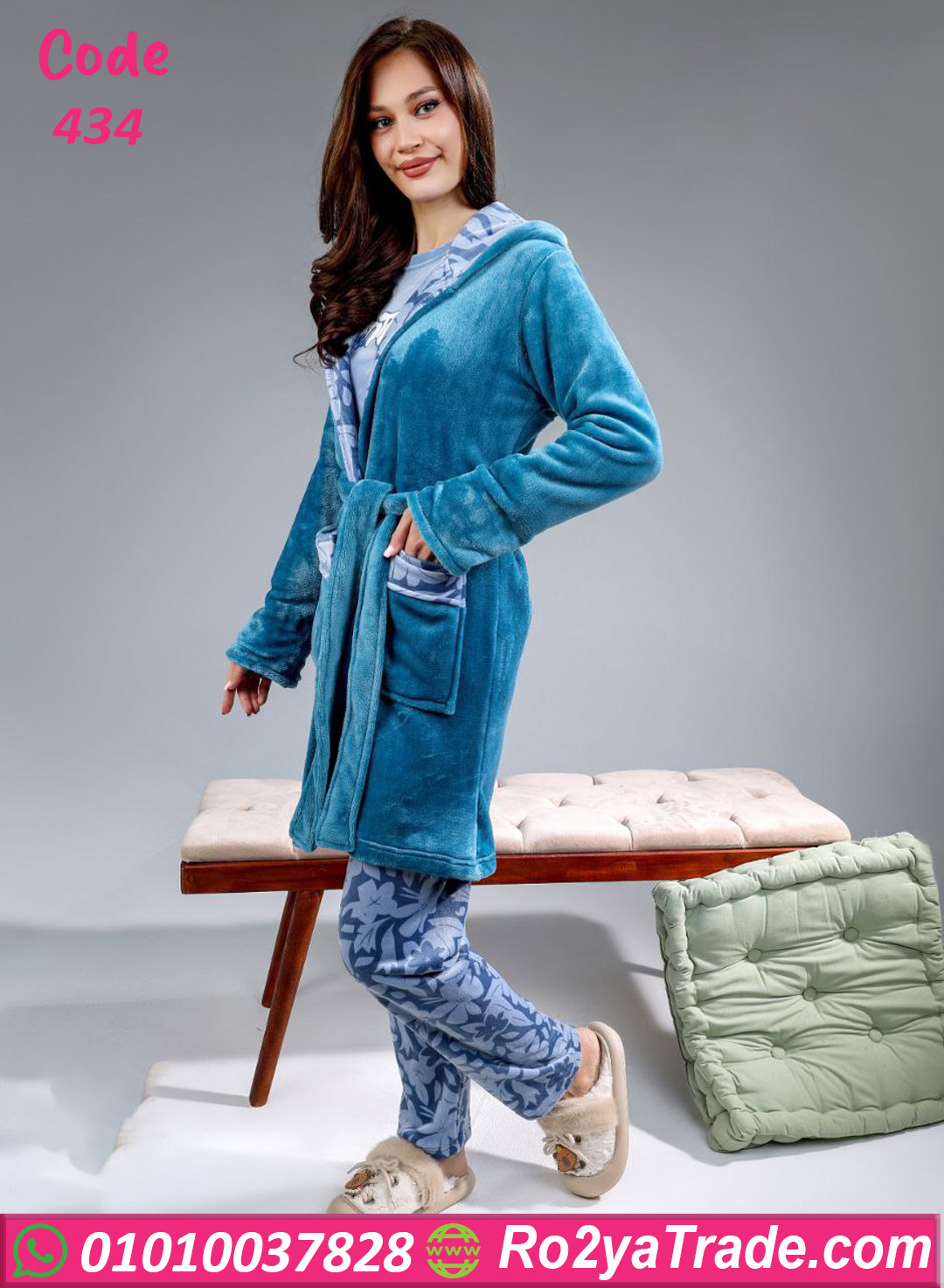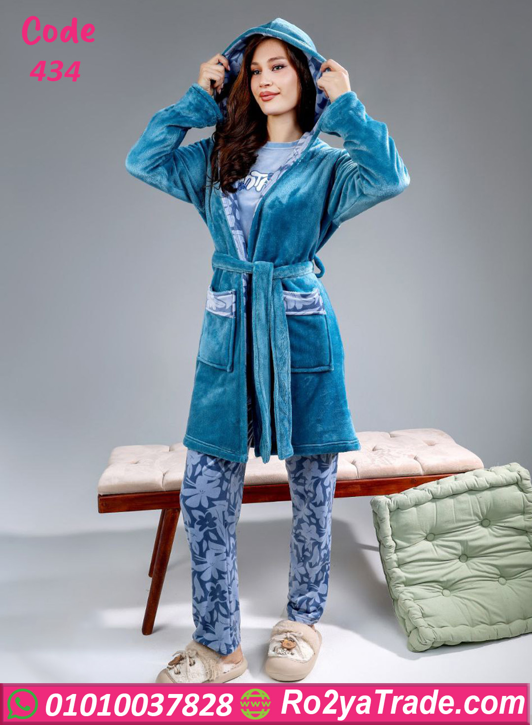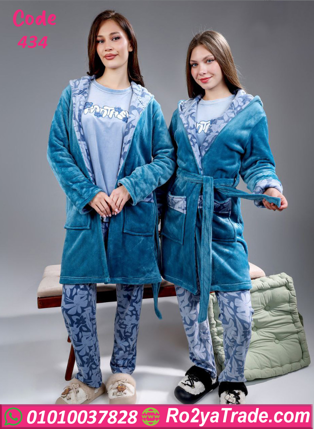بيجامة شتوي حريمي أنيقة مكونة من 3 قطع (تيشيرت + بنطلون + روب)، خامة ناعمة ودافية جدًا، مريحة في اللبس ومناسبة للاستخدام اليومي في البيت وأيام الشتاء الباردة.