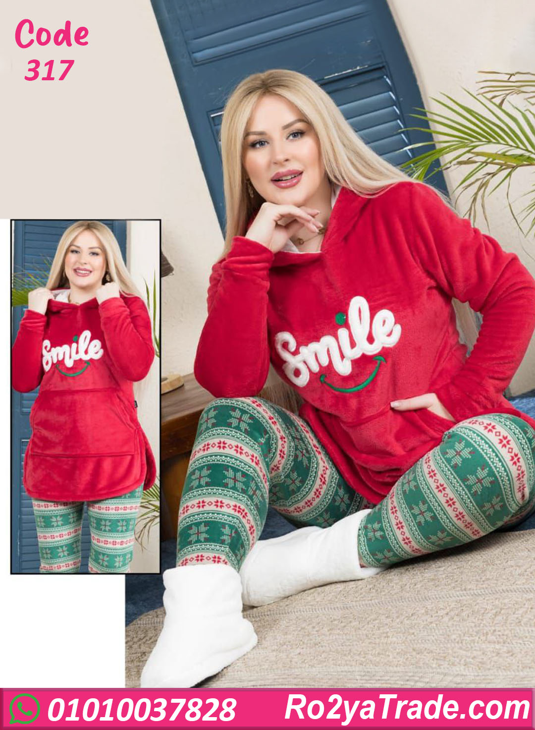 بيجامة شتوي قطعتين كود 317 اختيار مثالي لكل ست بتحب الراحة مع لوك لطيف. التصميم مكوّن من بلوفر شتوي فرو ناعم بقبعة وجيب أمامي + بنطلون شتوي مطبوع مريح، مناسب جدًا للشتا والجو البارد. الخامة شتوي ناعمة على الجسم، عملية ومريحة للاستخدام البيتي اليومي – كود 317.