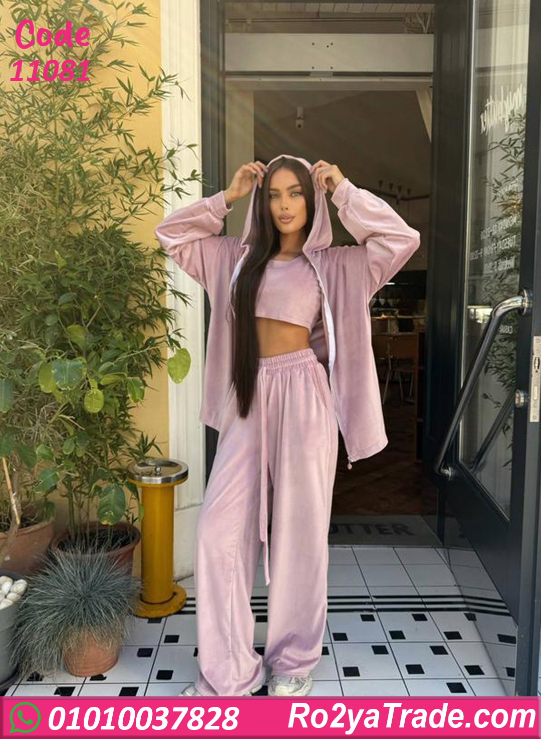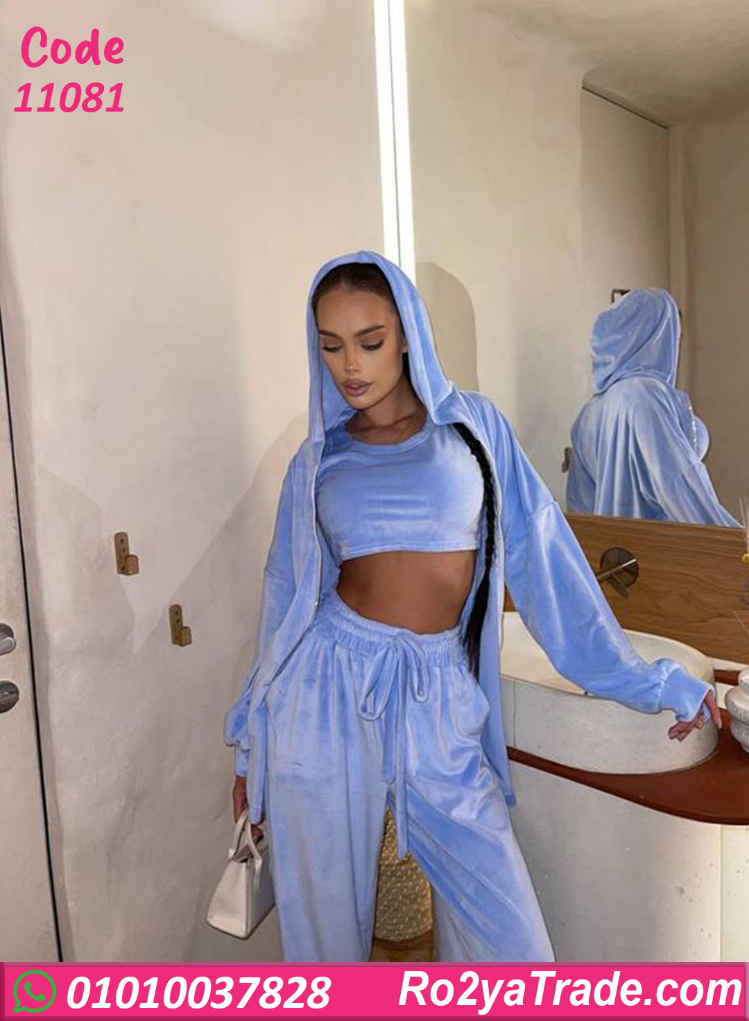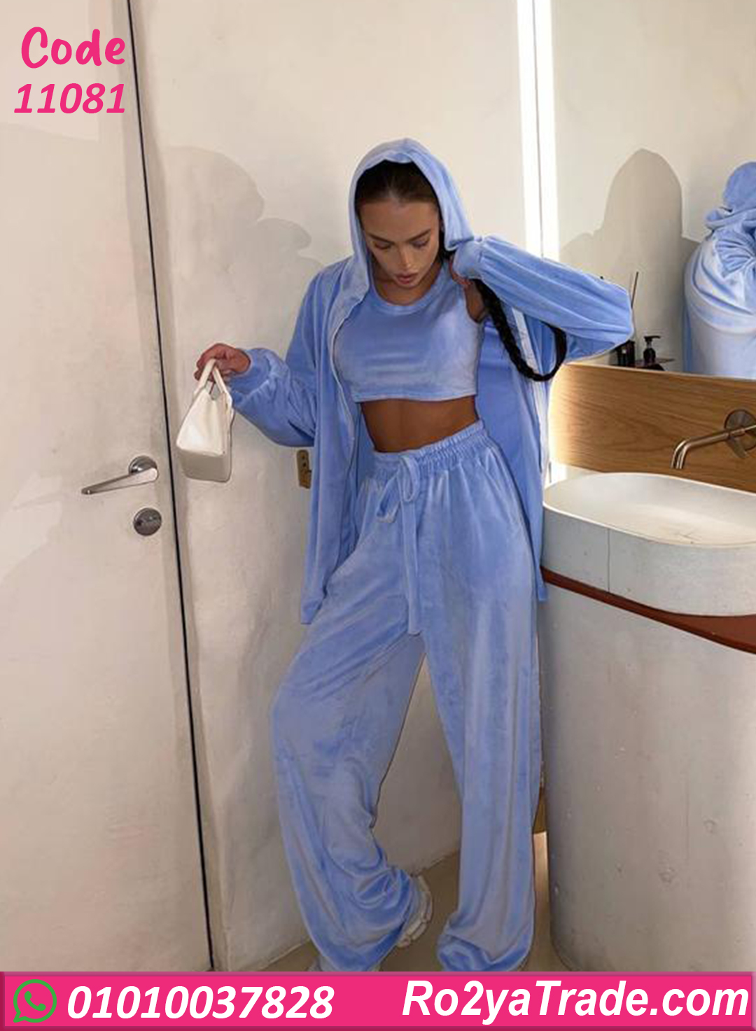 بيجامة شتوي حريمي مكونة من 3 قطع (توب – بنطلون – جاكيت بقبعة)، تصميم عملي وشيك، التوب قصير يدي شكل جذاب، والبنطلون واسع ومريح برباط قابل للتعديل،