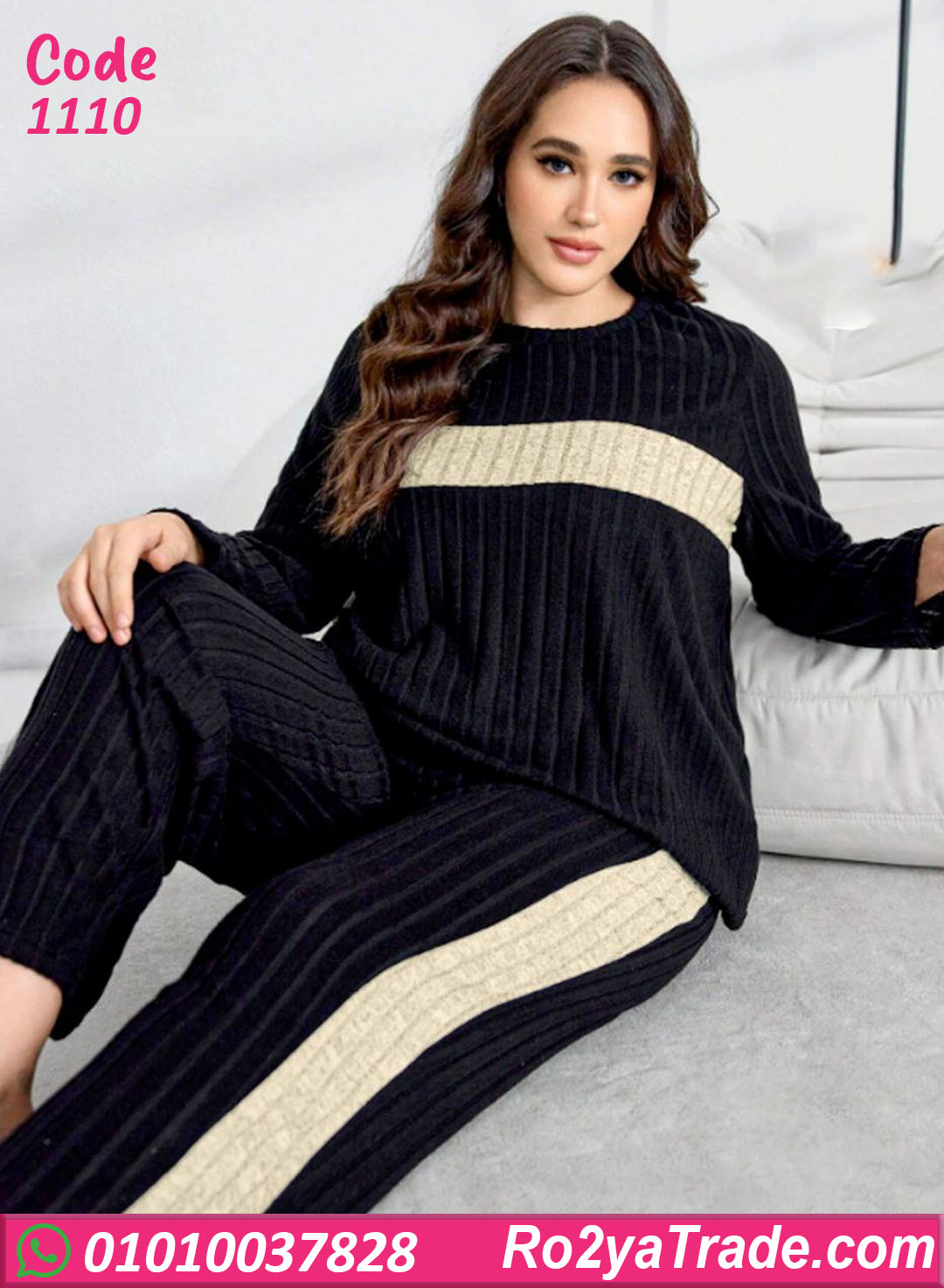 بيجامة شتوي حريمي بخامة ناعمة ومريحة، طقم مكوّن من بلوزة وبنطلون بتصميم عصري بخطوط مضلعة ولمسة لون مختلفة على الصدر، مناسبة للّبس البيتي والراحة اليومية مع إحساس دفا مريح.