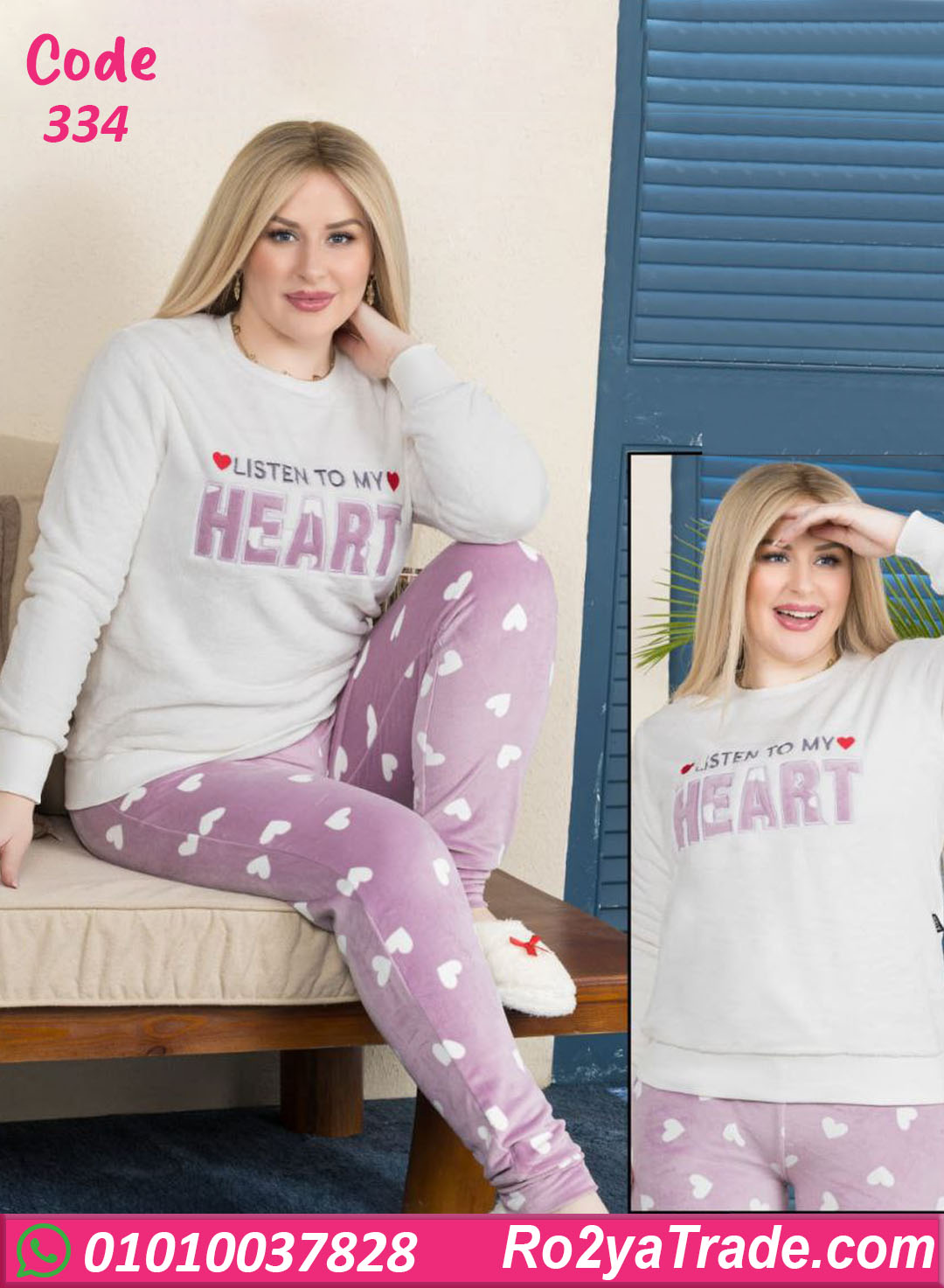 التصميم مكوّن من بلوزة شتوي ناعمة بطباعة Listen To My Heart، وبنطلون مريح بنقشة قلوب بخامة دافية، بيوفر حرية حركة وراحة في اللبس.