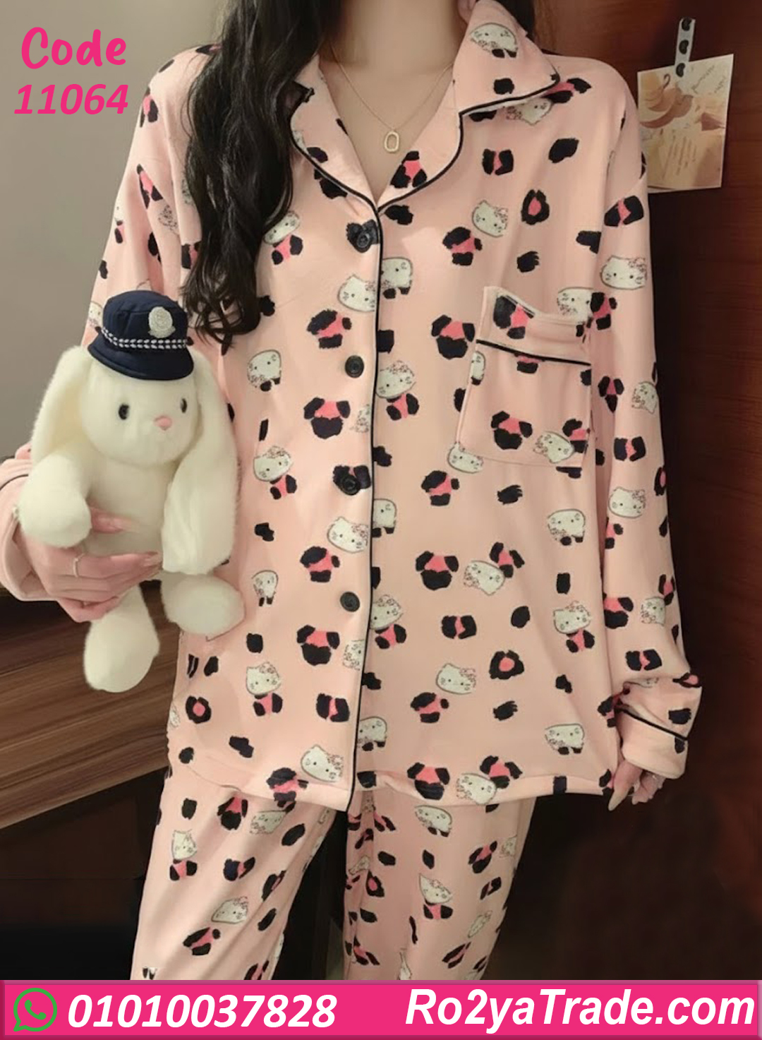 بيجامة شتوي حريمي بتصميم عملي ومريح، قميص بأزرار أمامية وجيب جانبي، مع بنطلون واسع يدي حرية حركة. النقشة الكيوت بتدي شكل لطيف وأنثوي،