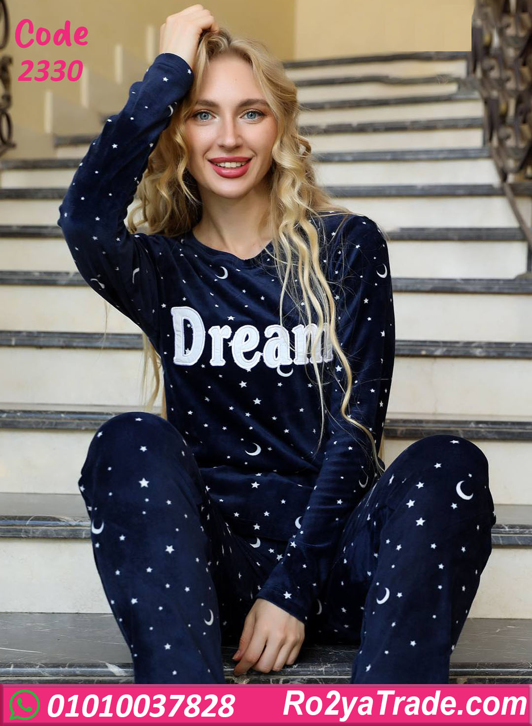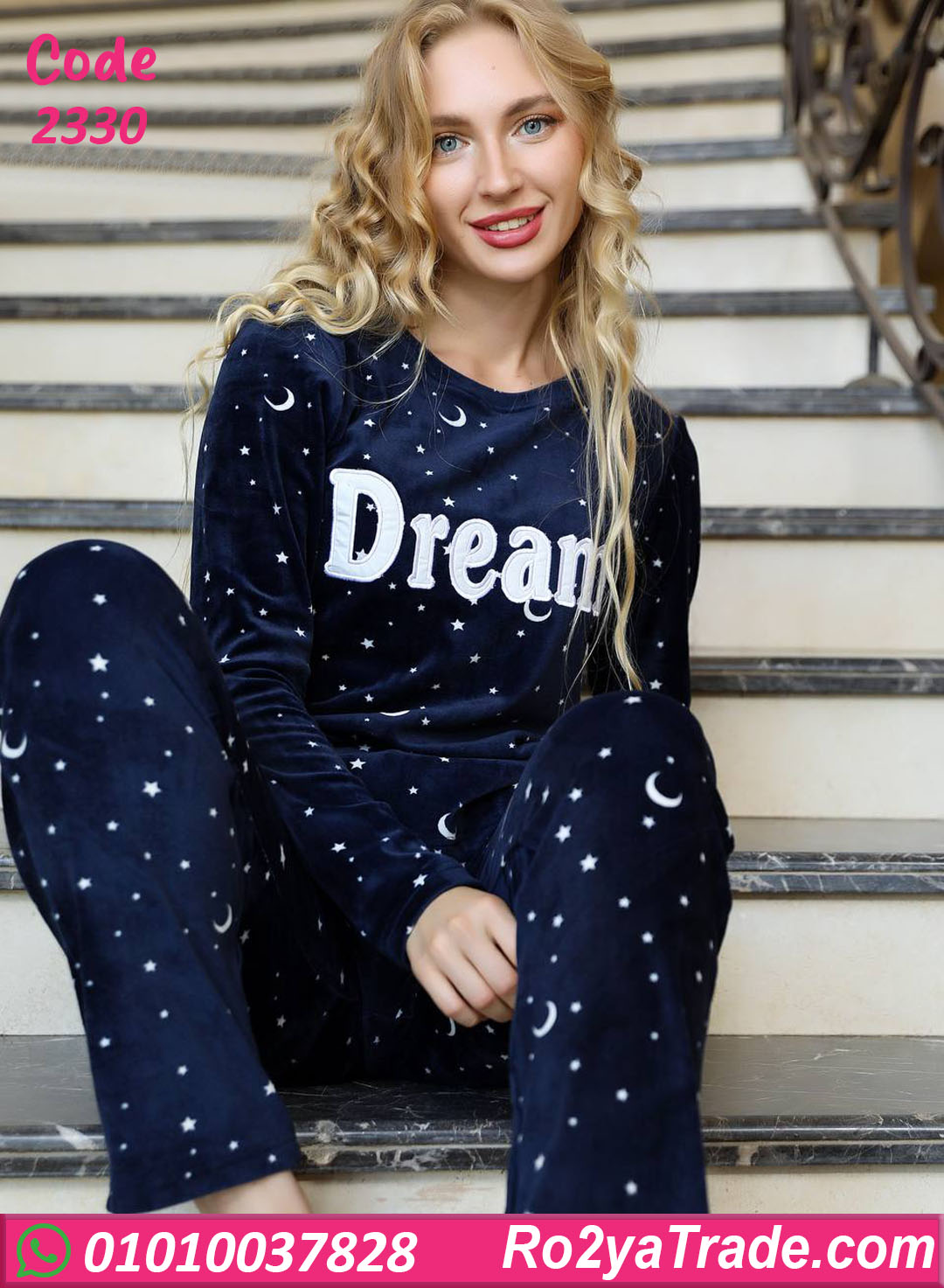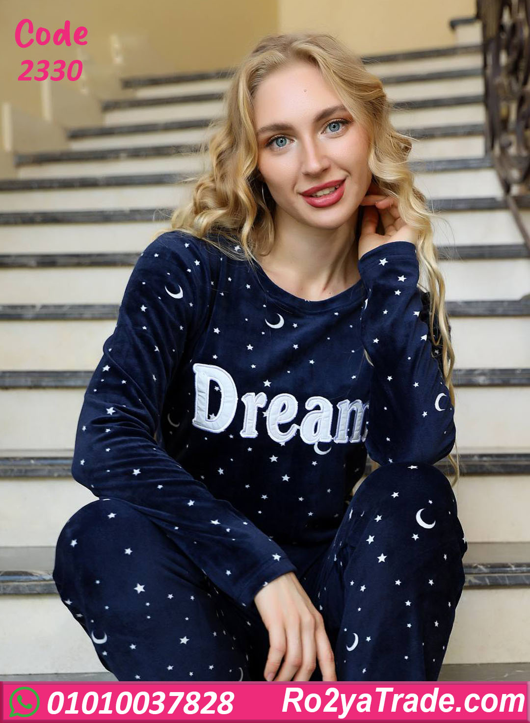 بيجامة شتوي حريمي موديل 2330 اختيار عملي لكل ست بتحب الراحة مع شكل بسيط وشبابي. التصميم مكوّن من بلوزة كم طويل مطبوعة بكلمة Dream مع نقشة نجوم وقمر، وبنطلون مريح بنفس النقشة، وده بيدي شكل لطيف ومناسب للبس البيتي. الخامة ناعمة ودافية، مناسبة للاستخدام اليومي داخل البيت في أيام الشتا، وبتوفّر حرية حركة من غير أي إحساس بالضيق. البيجامة عملية وسهلة اللبس، وتنفع كلبس بيتي مريح أو للنوم.