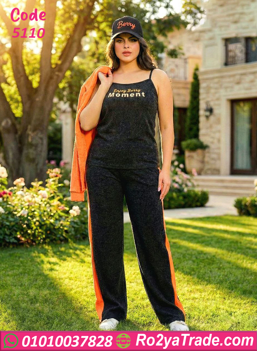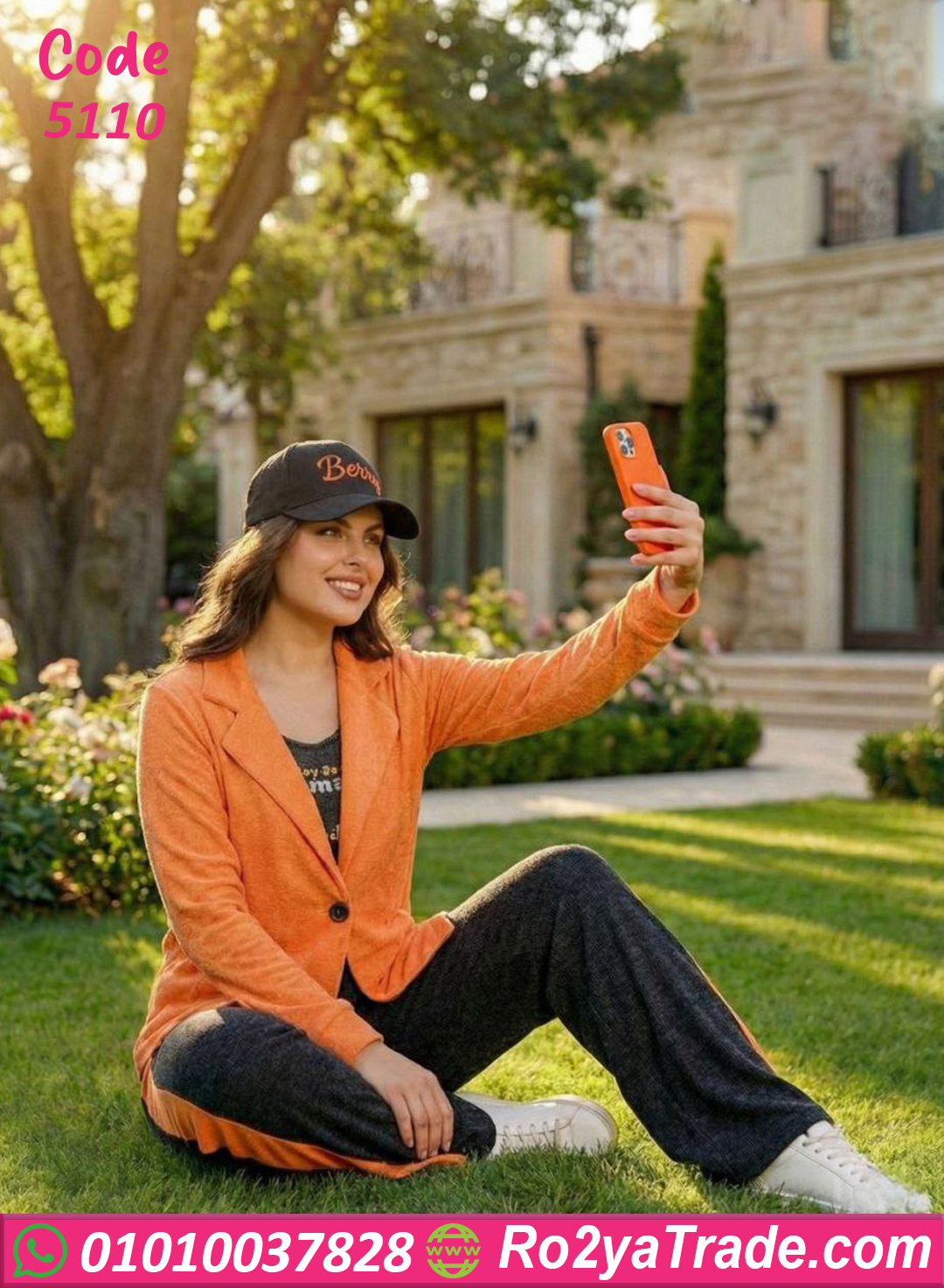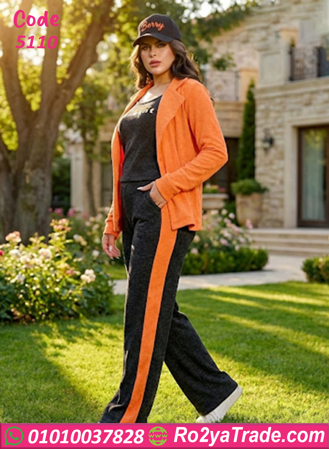 مكونة من توب وبنطلون مع جاكيت مفتوح، خامة تقيلة ودافية بتدي راحة وشكل أنيق، وان سايز تناسب أغلب الأجسام.