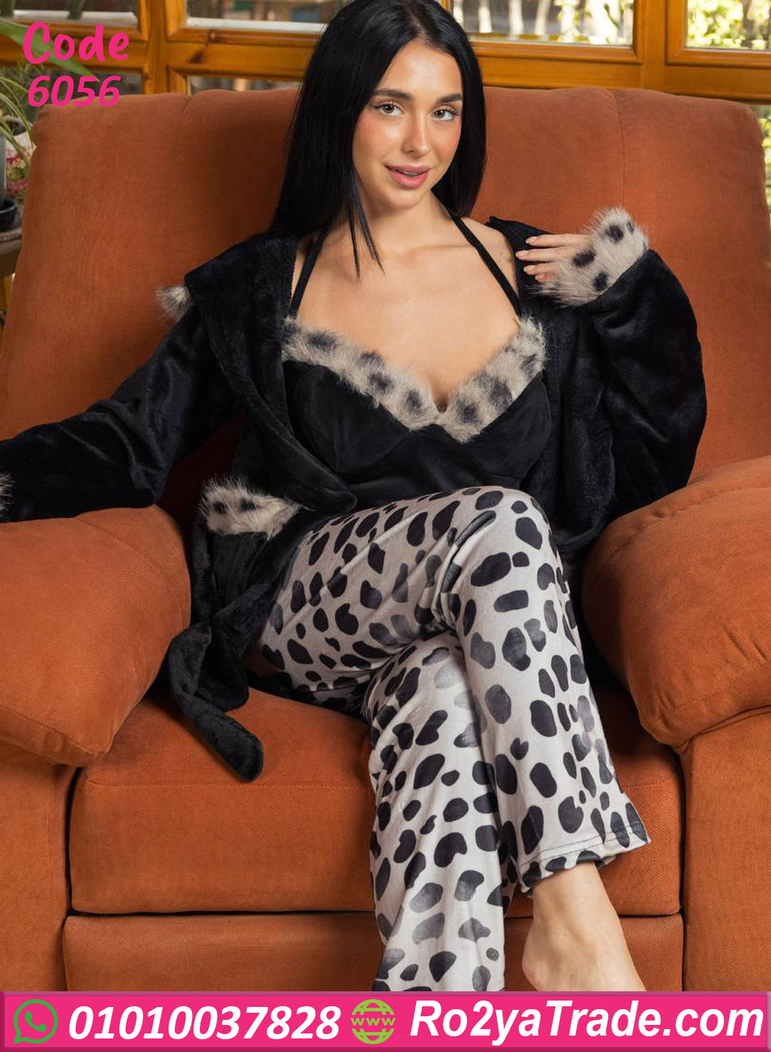 بيجامة خامة فرو ناعمة جدًا بملمس مخملي مريح على الجسم، مع روب بنفس الخامة بفروا ناعم عند الكُم والياقة، وبنطلون ستان مطبوع بنقشة ليوبارد بتدي لوك جذاب ومختلف 💫