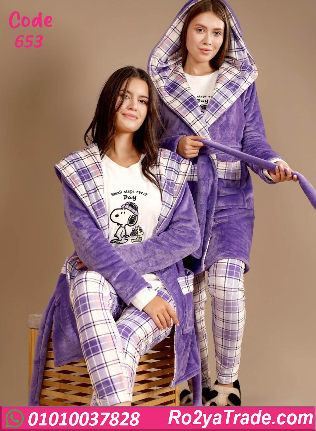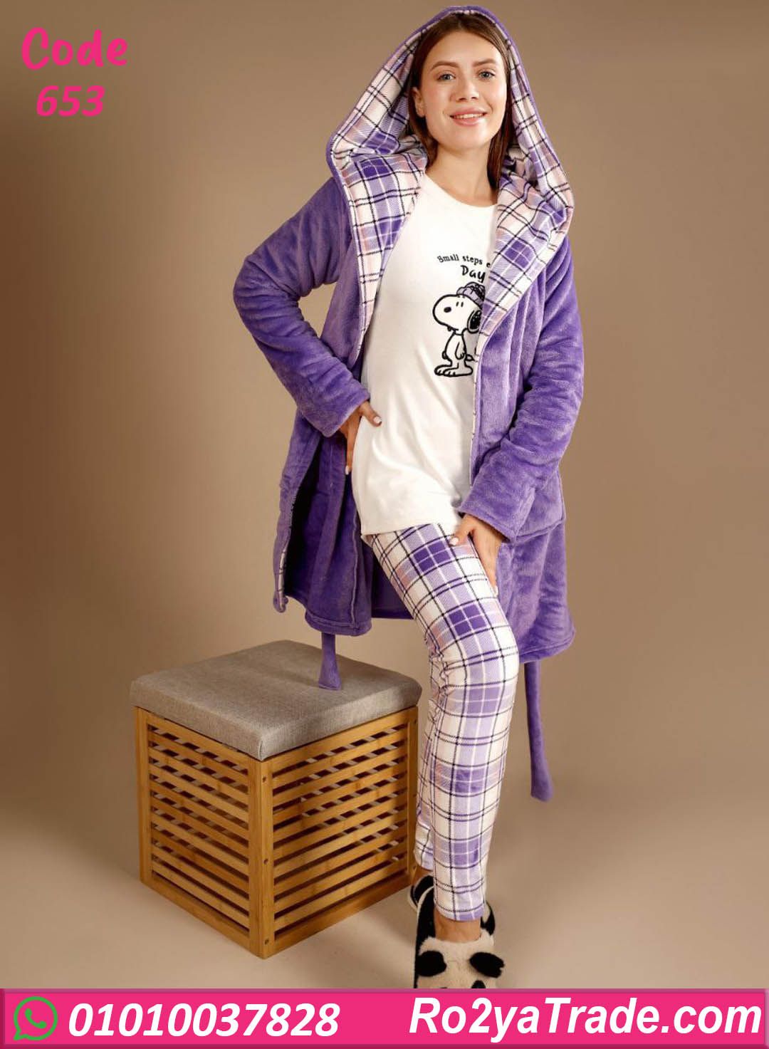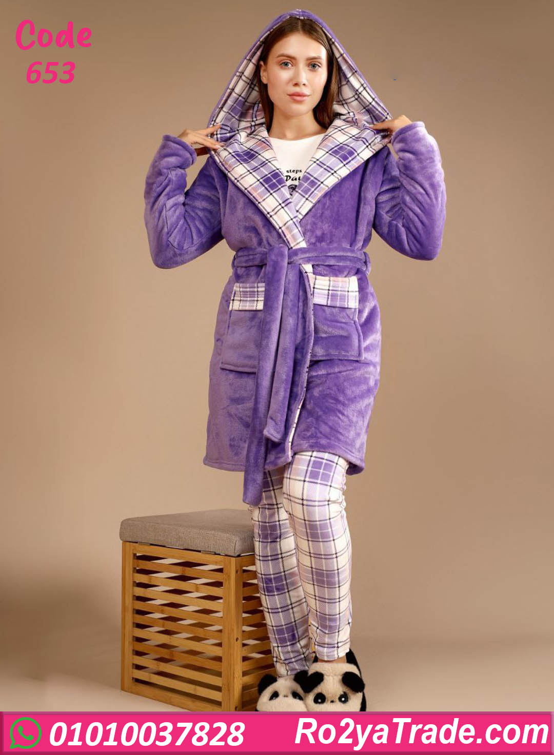 بيجامة شتوي حريمي بخامة قطيفة تقيلة وناعمة بتدي إحساس عالي بالدفا والراحة. الطقم مكوّن من تيشيرت وبنطلون مع روب قطيفة بحزام، تصميمه شيك ومريح في نفس الوقت، مناسب قعدة البيت والنوم، وكمان مثالي للجو البارد. الخامة لطيفة على الجلد ومش بتسبب أي إزعاج، وقصته مريحة بتسمح بحرية الحركة طول اليوم. اختيار ممتاز للستات اللي بتحب الراحة مع شكل أنيق، وكمان ينفع كهدية شتوي مميزة. كود 653