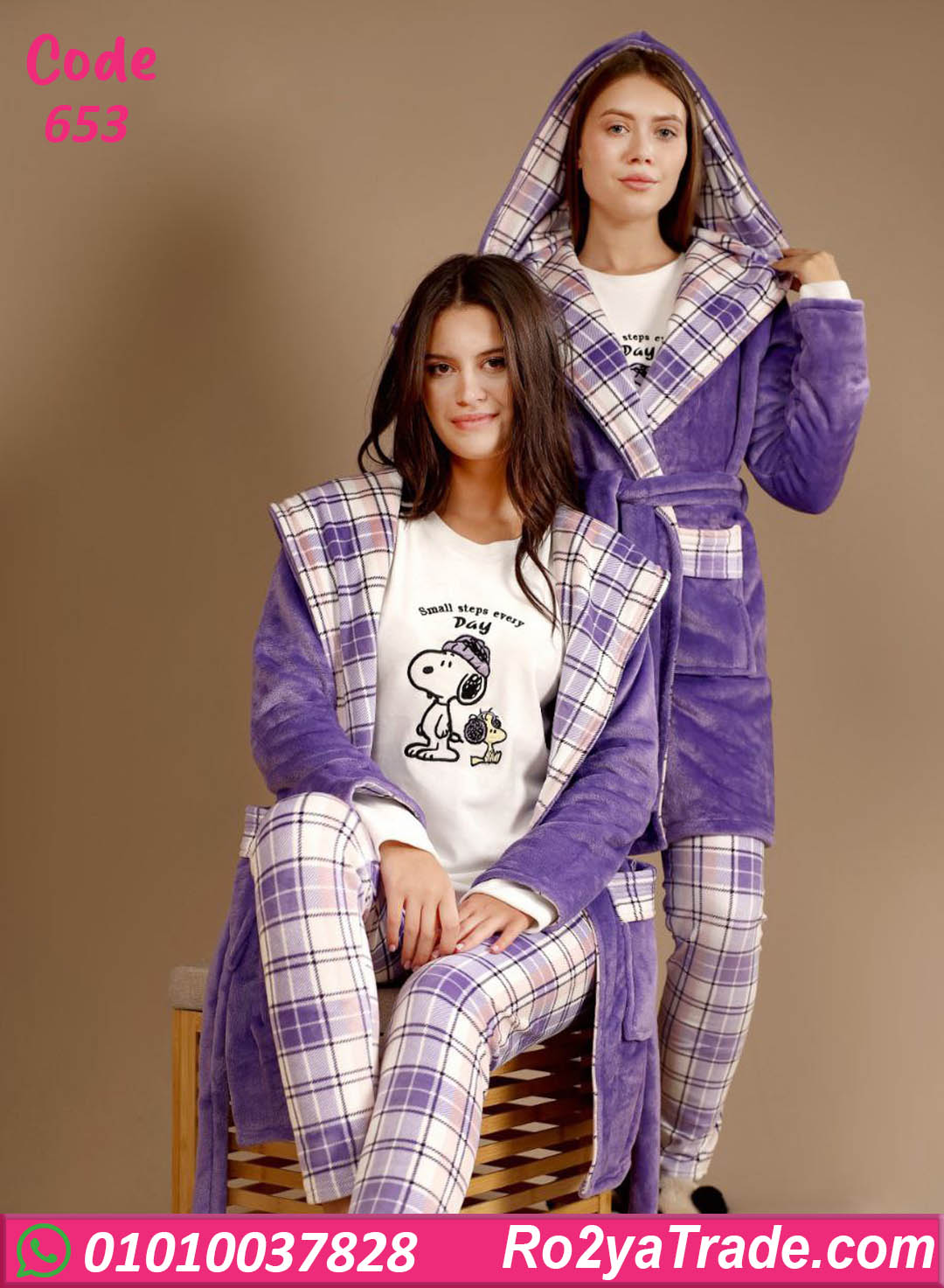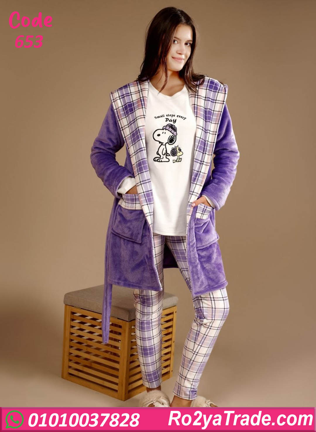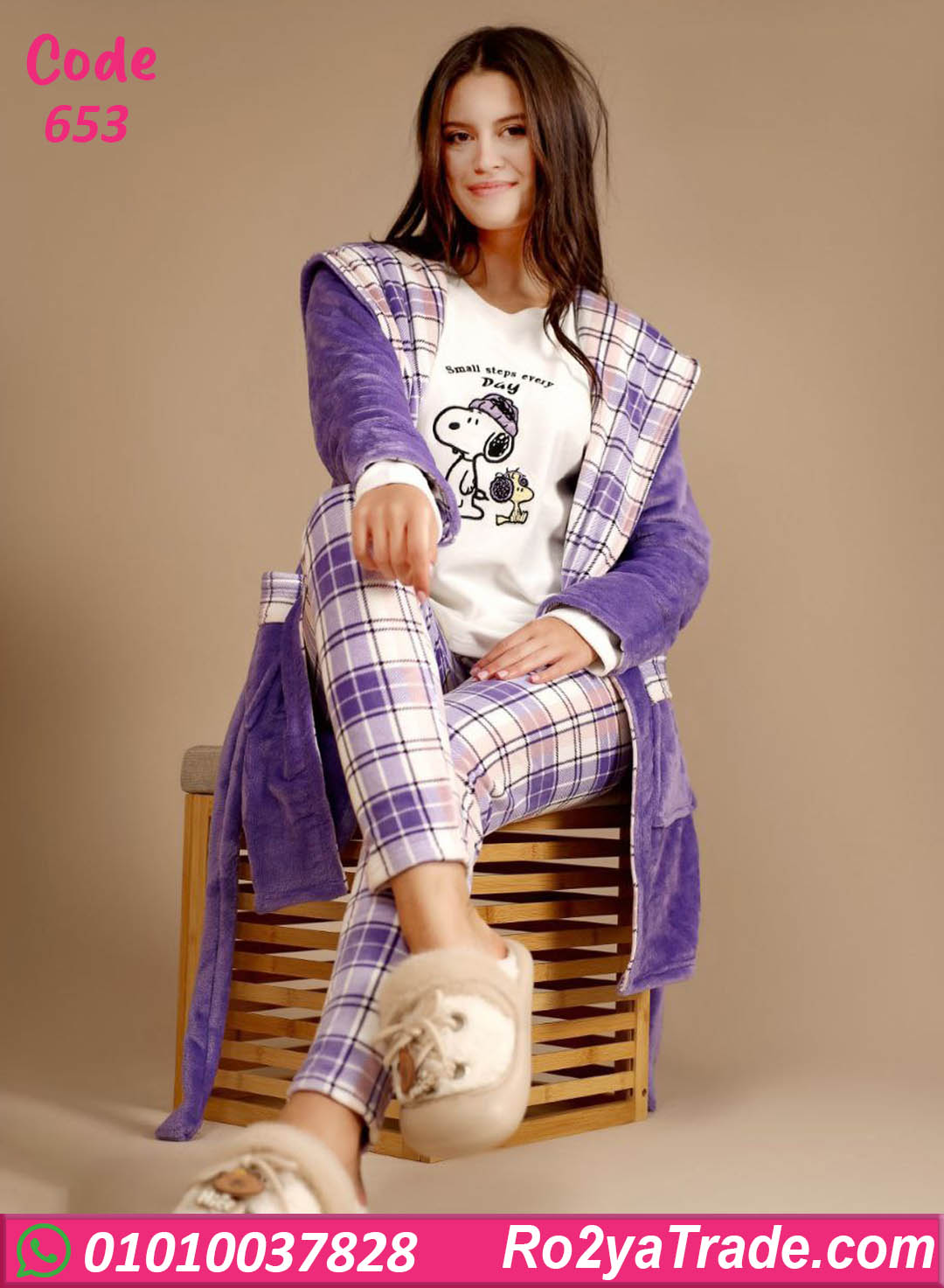 بيجامة شتوي حريمي بخامة قطيفة تقيلة وناعمة بتدي إحساس عالي بالدفا والراحة. الطقم مكوّن من تيشيرت وبنطلون مع روب قطيفة بحزام، تصميمه شيك ومريح في نفس الوقت، مناسب قعدة البيت والنوم، وكمان مثالي للجو البارد. الخامة لطيفة على الجلد ومش بتسبب أي إزعاج، وقصته مريحة بتسمح بحرية الحركة طول اليوم. اختيار ممتاز للستات اللي بتحب الراحة مع شكل أنيق، وكمان ينفع كهدية شتوي مميزة. كود 653