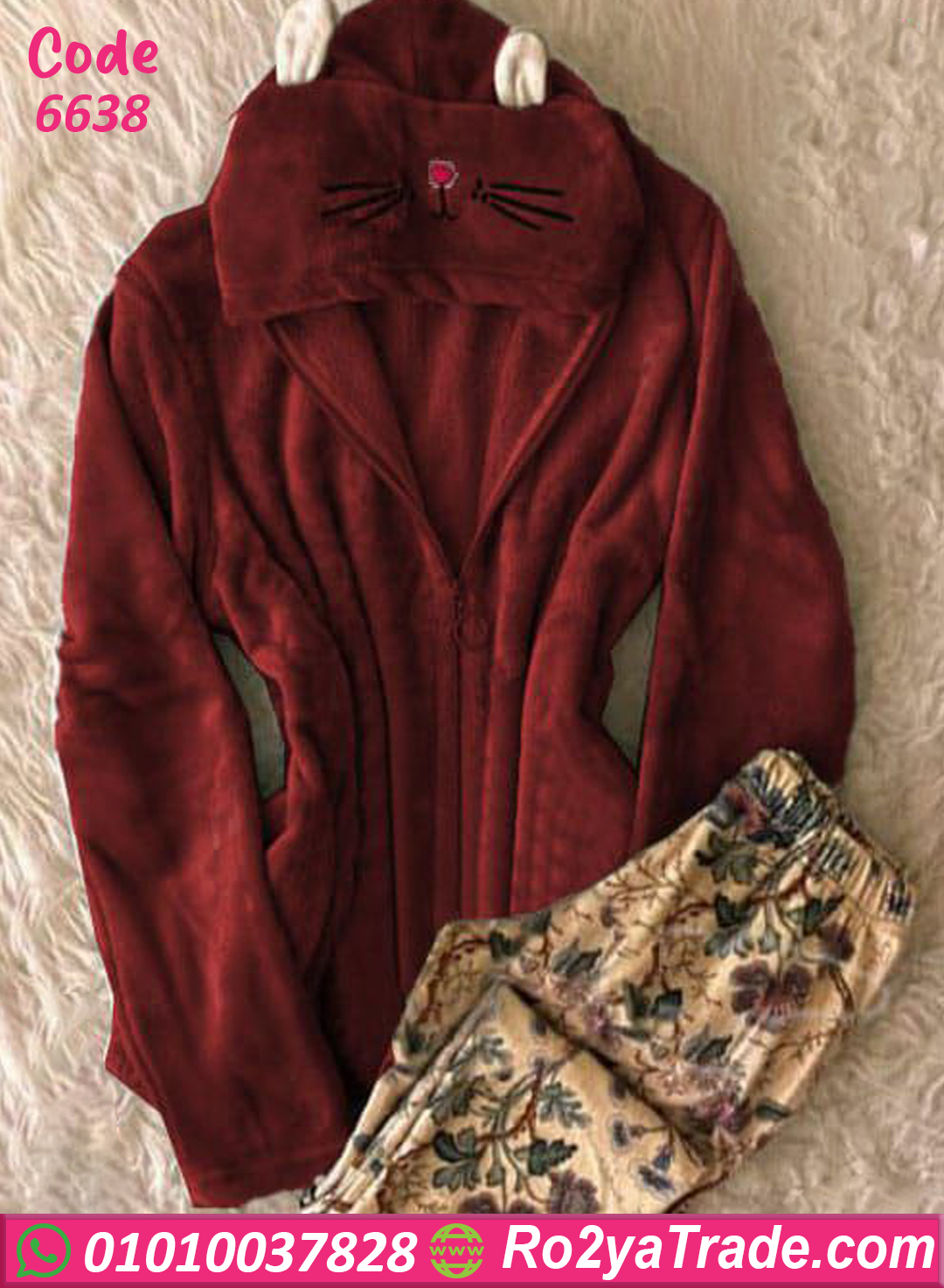 جاكيت قطيفة ناعم جدًا بسوستة أمامية وغطاء رأس بأذنين مطرزين بشكل لذيذ، والبنطلون منقوش نقشة دافئة ومميزة تضيف لمسة أنوثة ودفا.