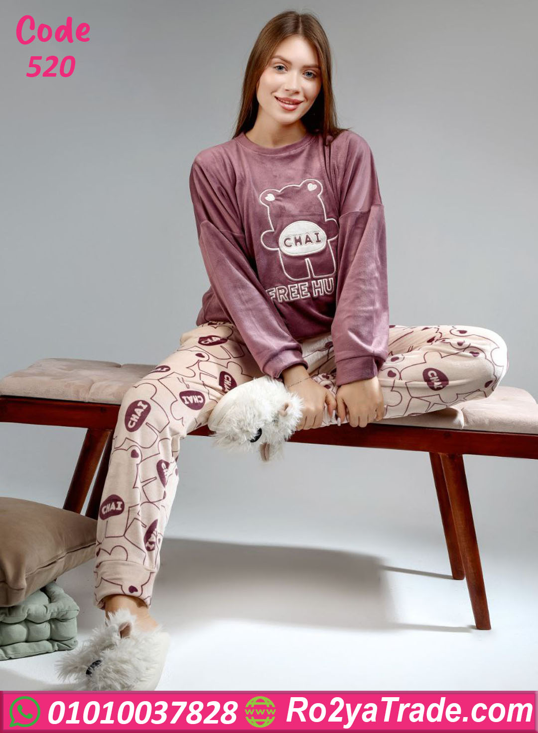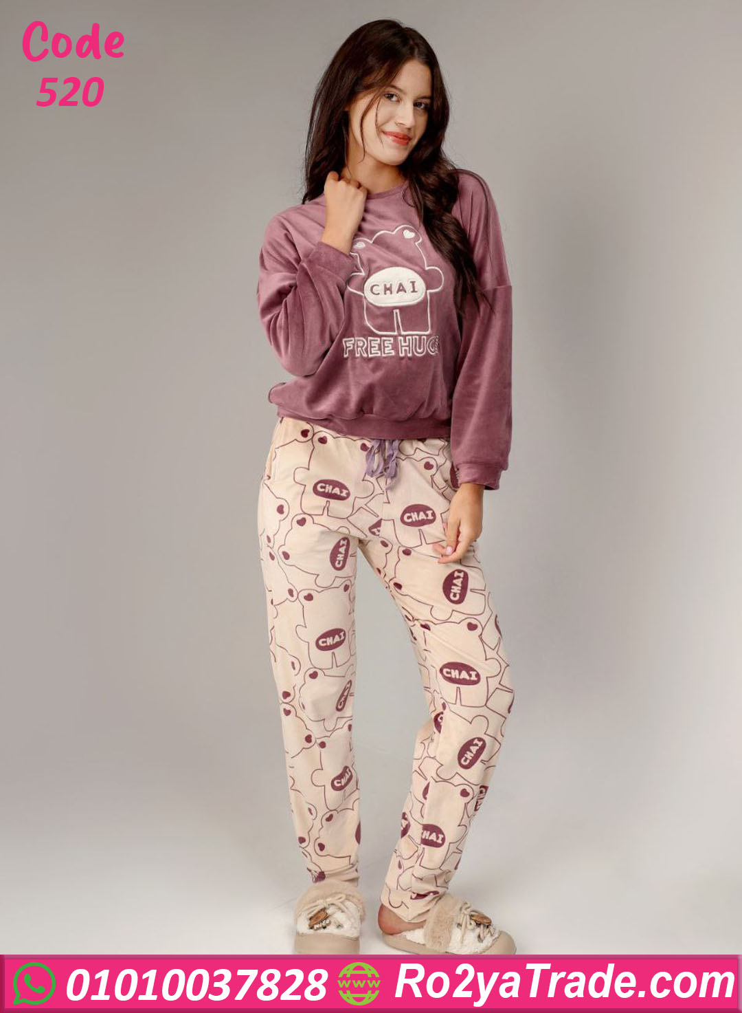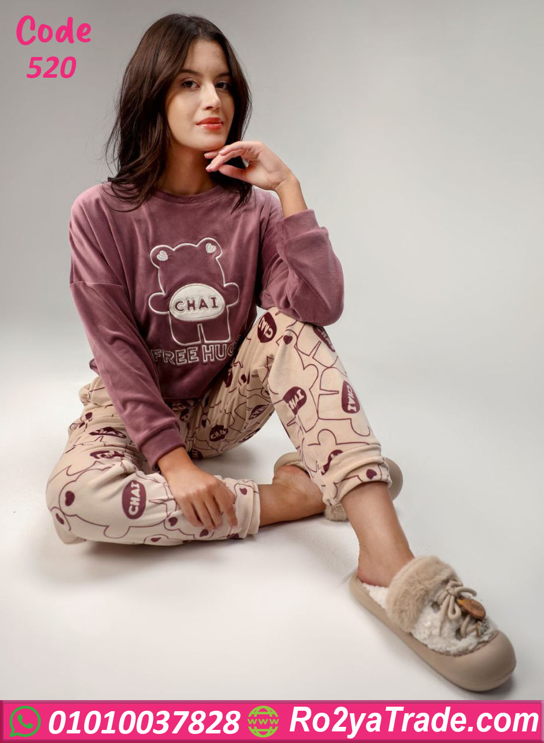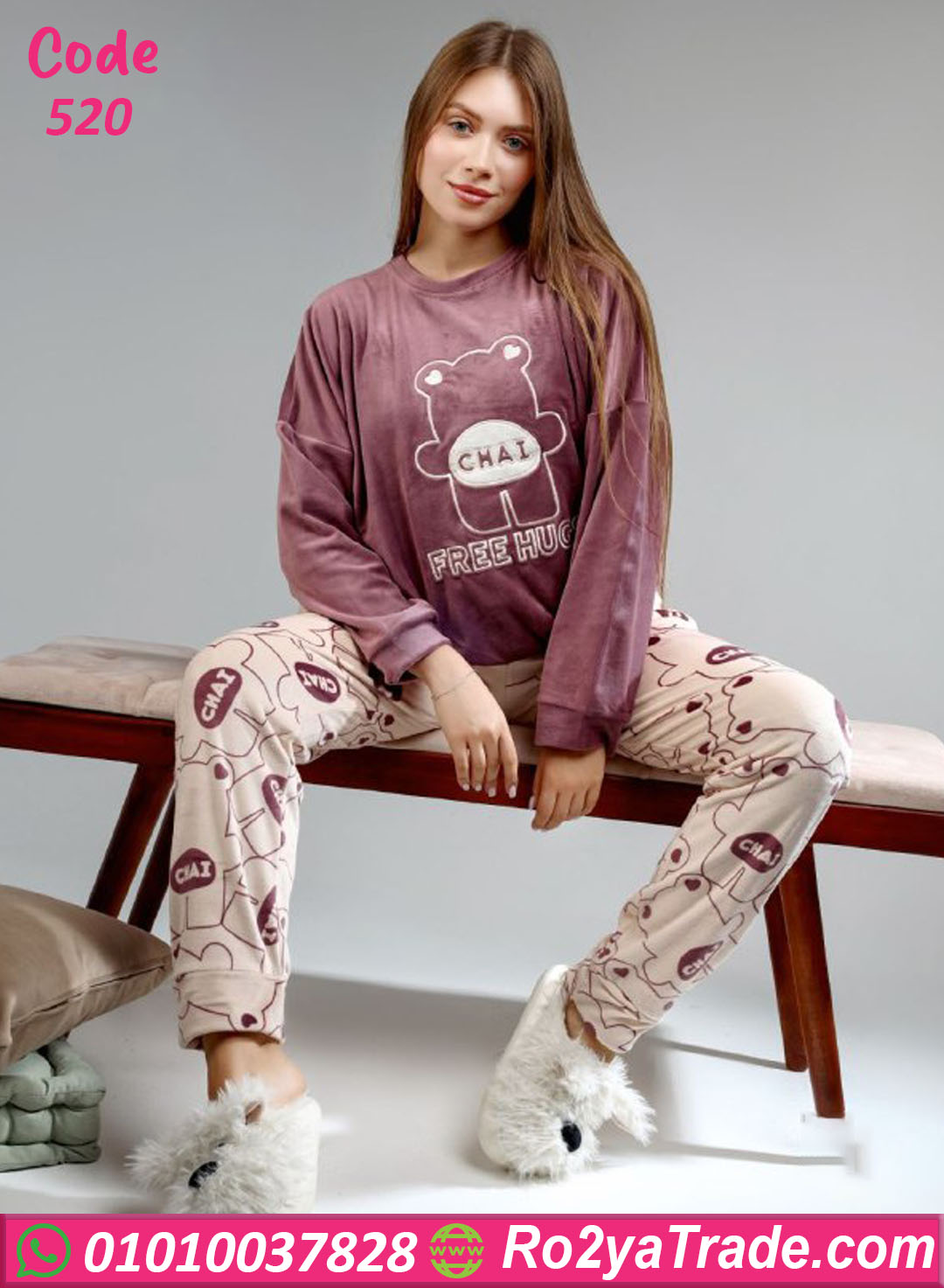 التوب مصنوع من خامة قطيفة لامعة بلون موف ترابي، مطرز بدبدوب كيوت بيكتب عليه “FREE HUG”، والبنطلون نفس التيمة بلون بيچ وعليه رسومات الدبدوب بنفس اللون.