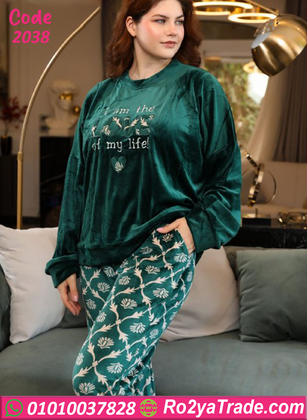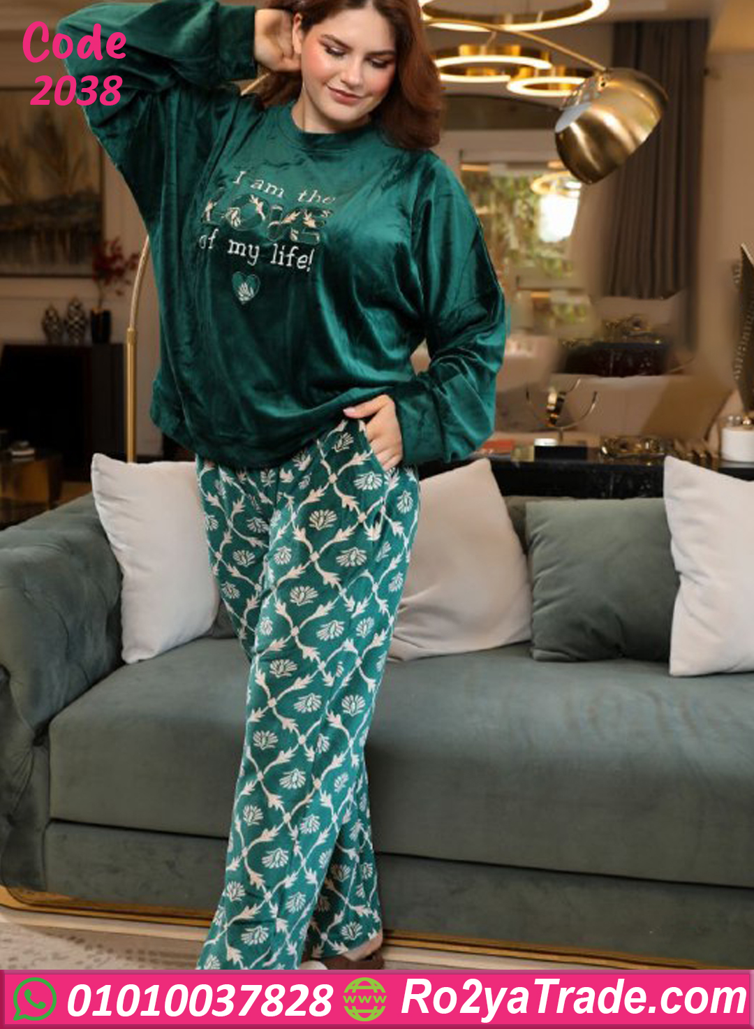 البيجامة مصنوعة من خامة القطيفة التقيلة المبطنة اللي بتدي دفا وملمس ناعم جدًا على الجلد، والتصميم العصري بتاعها فيه توب ساده أنيق مطرز بعبارة تحفيزية جذابة، مع بنطلون مطبوع نقش أوراق ناعم بيكمّل الإطلالة بإحساس فخم ومودرن 💕