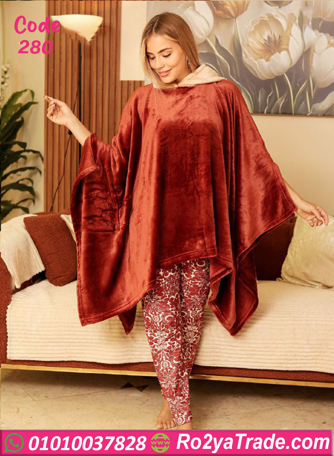 البلوزة تصميمها واسع ومريح مع قبعة لطيفة تضيف شكل شيك ومميز، وكمان مناسبة للقعدة في البيت أو الاسترخاء. البنطلون مطبوع برسمة أنيقة وناعمة، وبيكمل اللوك بشكل متناسق وجذاب.