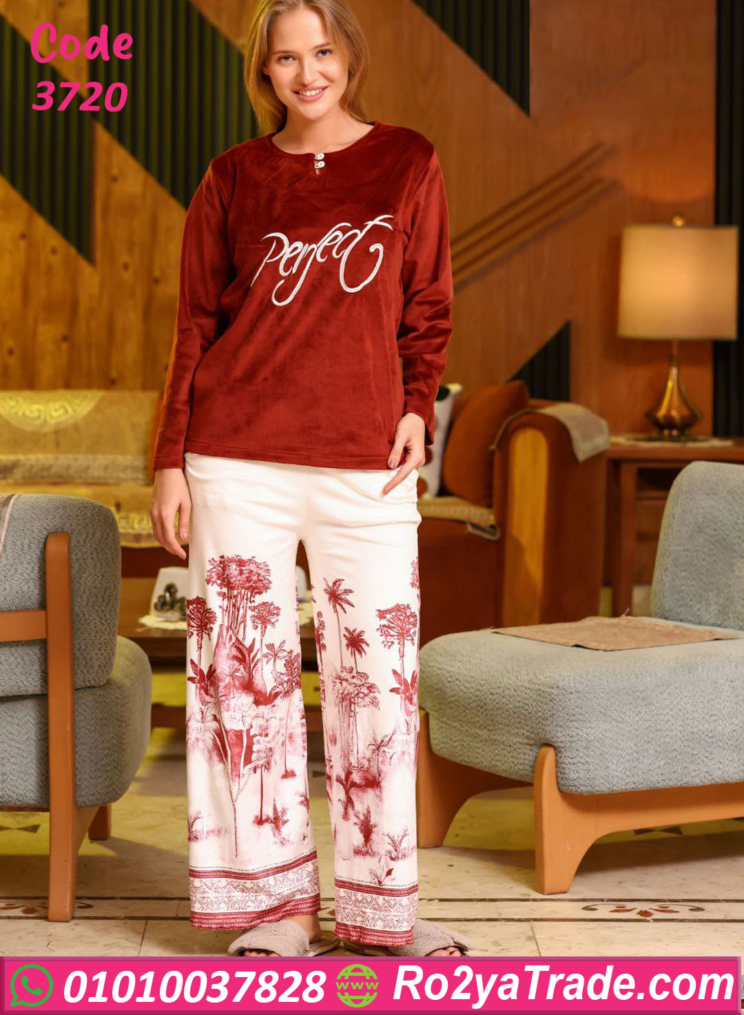بيجامة حريمي شتوي قطيفة ناعمة جدا بلون نبيتي غامق مكتوب عليها “Perfect”، بتصميم مريح وجذاب مثالي للجو البارد.