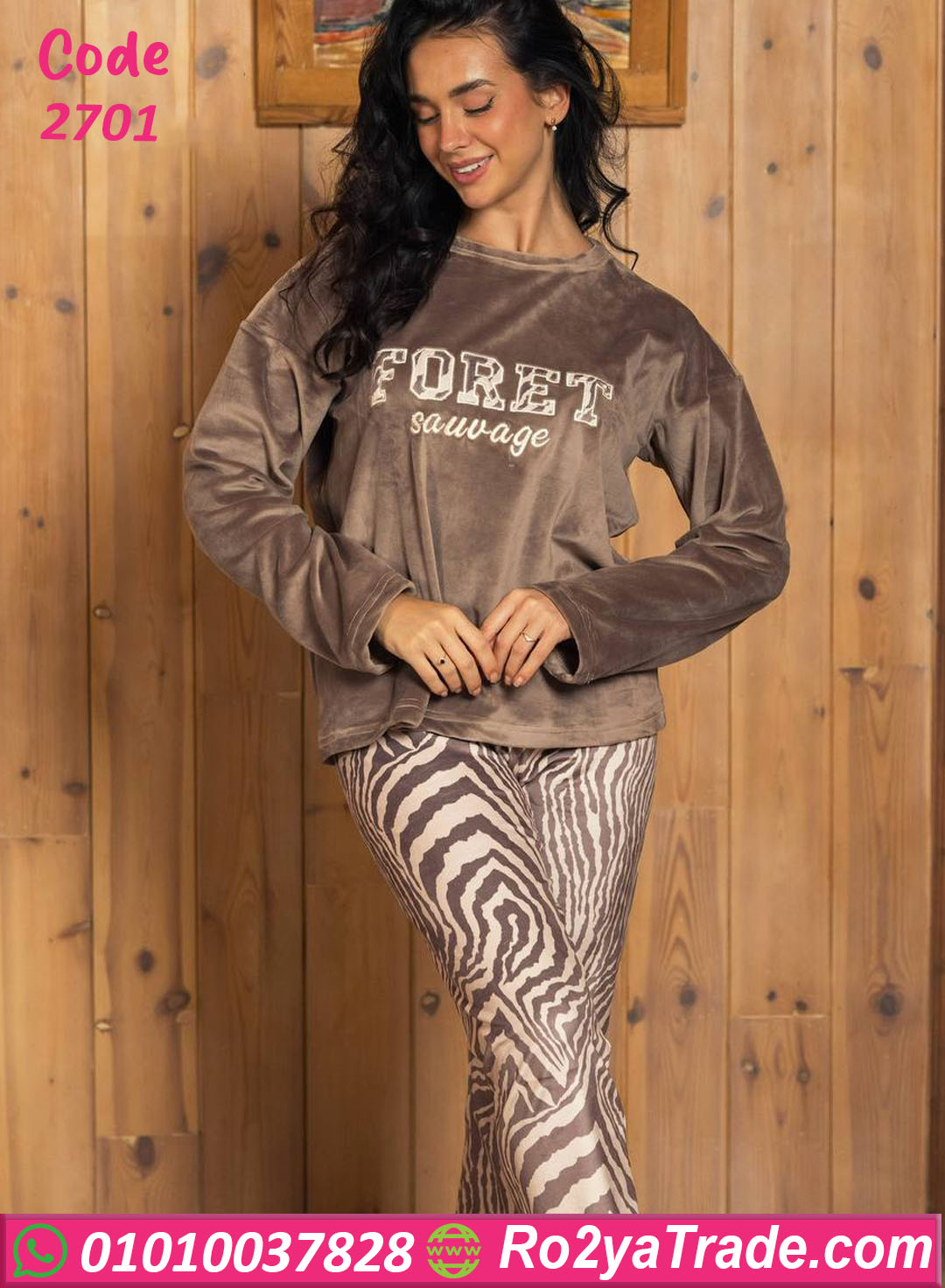 بيجامة حريمي شتوي قطيفة ناعمة جدًا باللون البني الغامق، مطبوعة بستايل مميز وكلمة Forêt Sauvage، مريحة وشيك جدا.