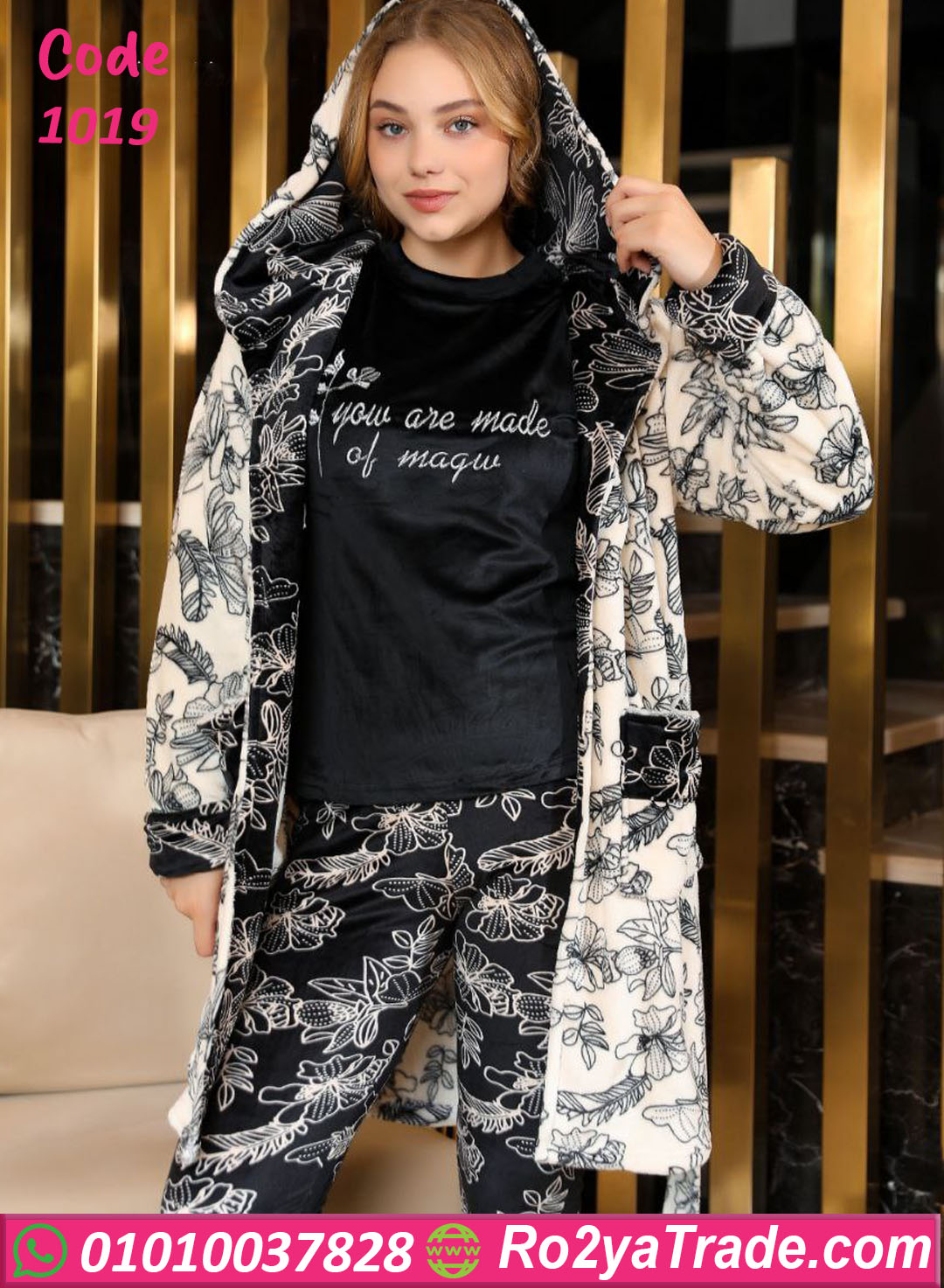 الخامة قطيفة فخمة وناعمة جدًا على الجسم، والتصميم فيه توب أنيق مطرز بكلمات بسيطة، وبنطلون منقوش جذاب، ومعاهم روب ناعم بنفس التفاصيل بيكمل الشياكة والدفا.