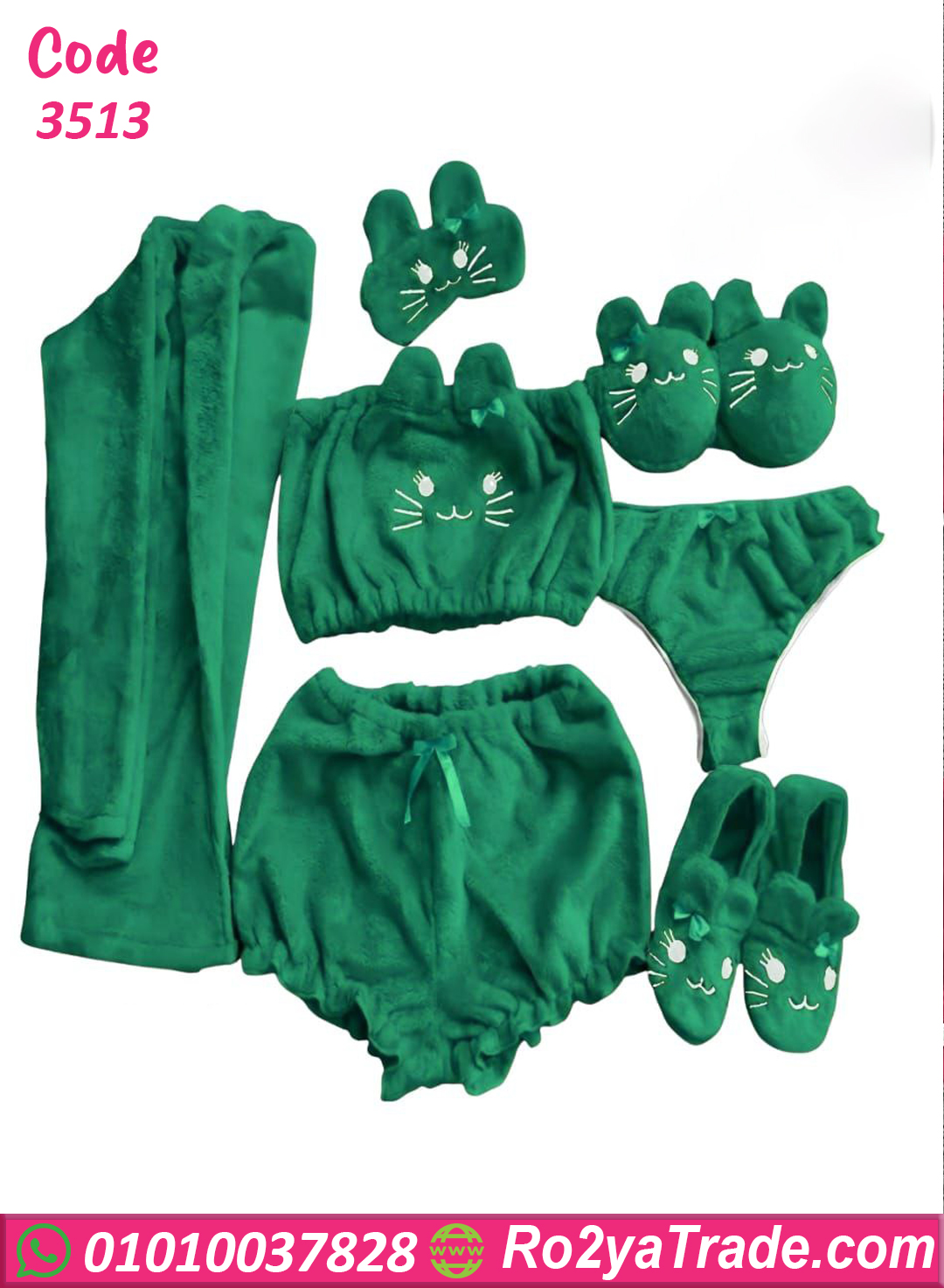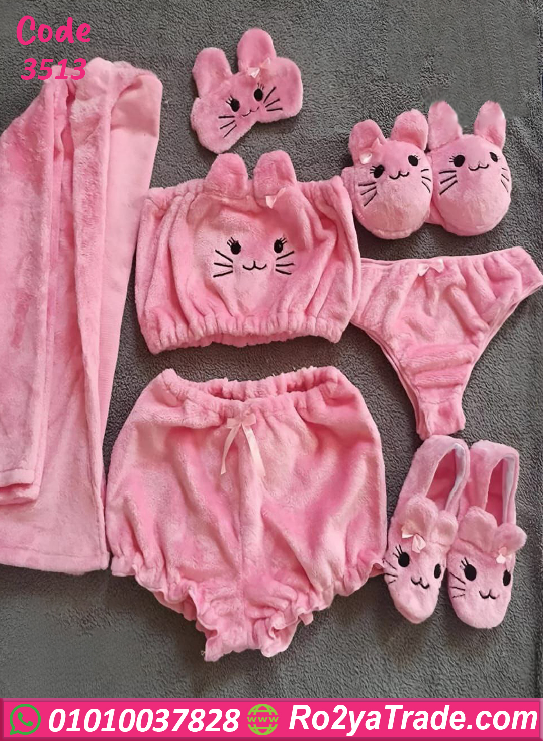 الطقم مكوّن من شورت، توب كت كيوت بتصميم وش أرنب، شبشب فرو بنفس الشكل، ماسك عين، وبنطلون بيت مريح جدًا 💖