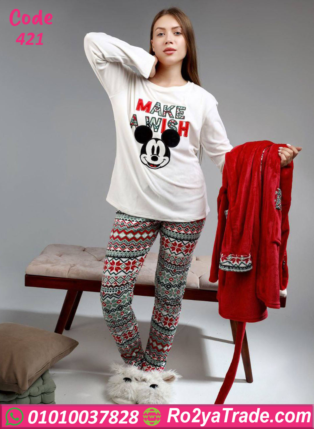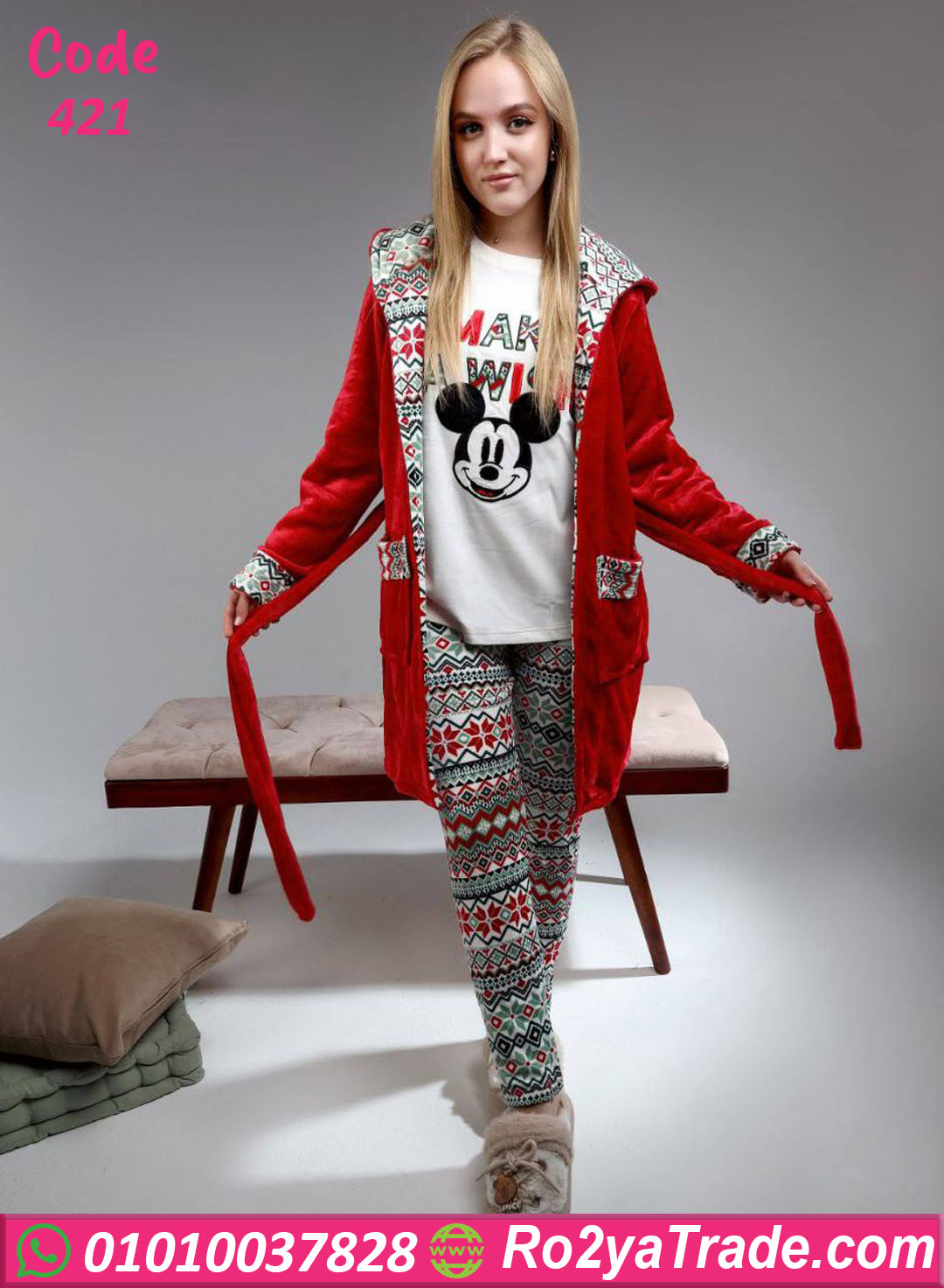 بيجامة شتوي أنيقة بخامة قطيفة ناعمة جدًا ودافية، التصميم بيضم توب مطبوع عليه ميكي ماوس مع بنطلون نقشة كريسماس وروب قطيفة بنفس النقشة لمظهر شتوي لطيف ودافي 🔥