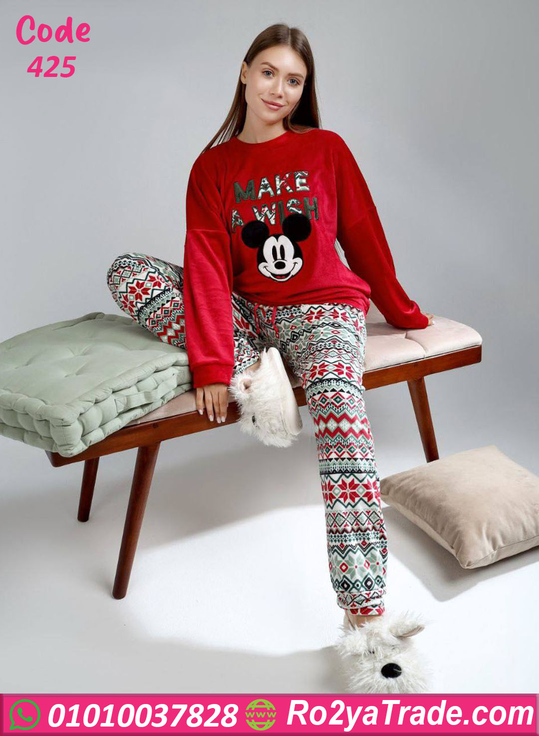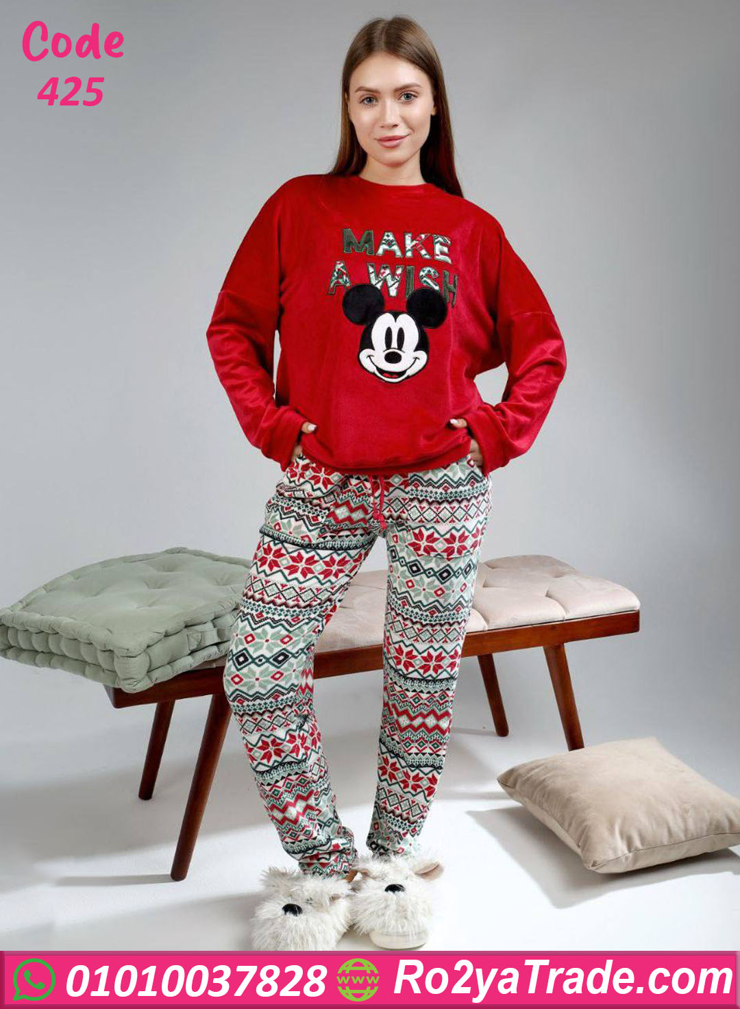 بيجامة شتوي ناعمة جدًا بخامة قطيفة مستوردة فخمة، التصميم بيجمع بين توب أحمر مطبوع عليه ميكي ماوس وبنطلون بنقشة كريسماس شيك عشان لوك شتوي دافي ومبهج ❤️